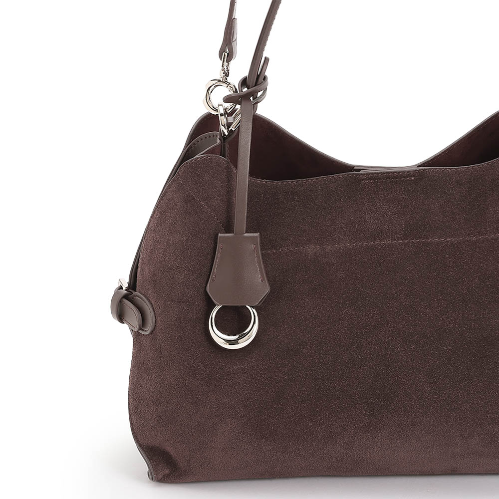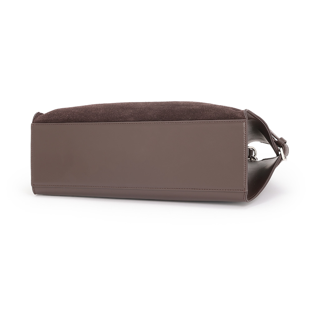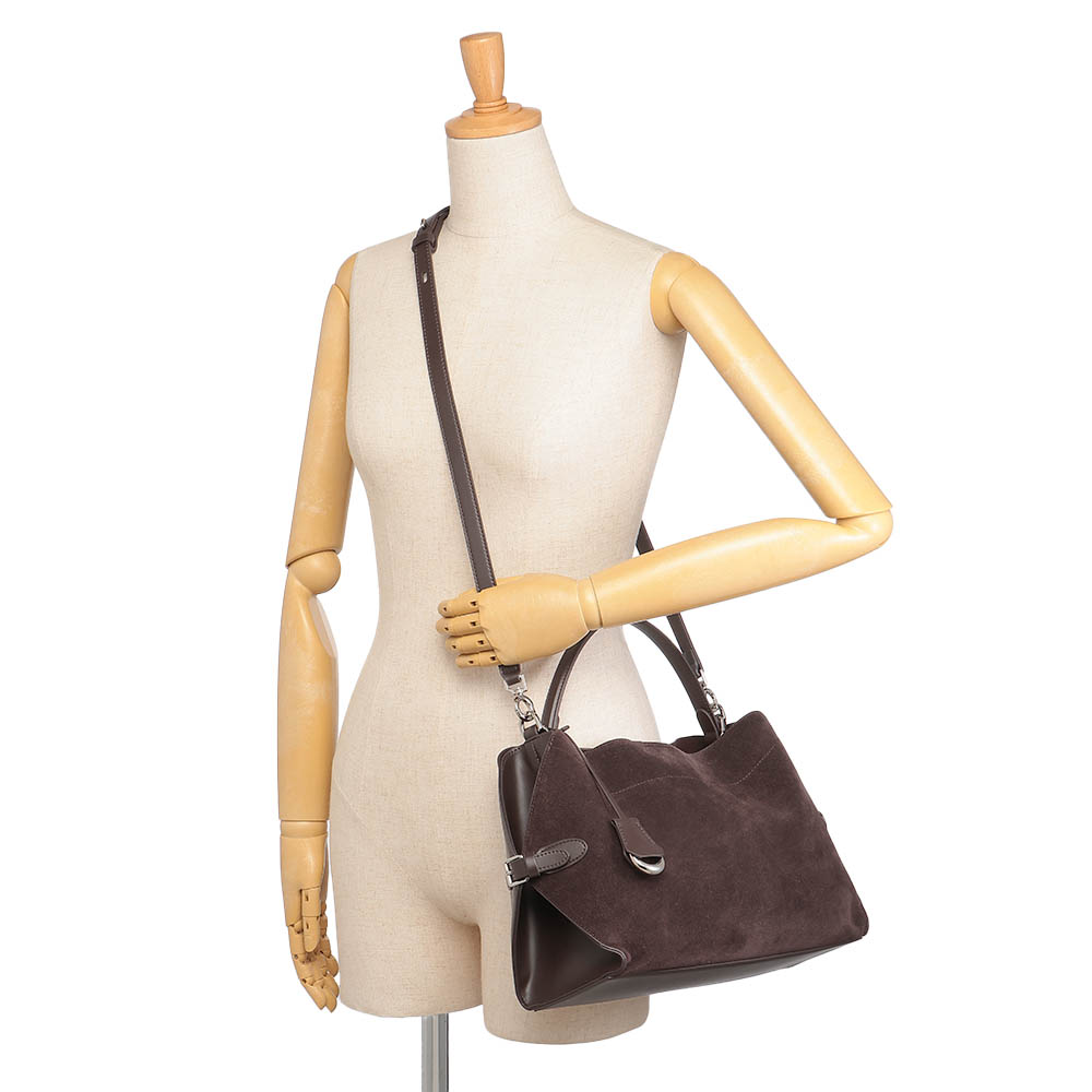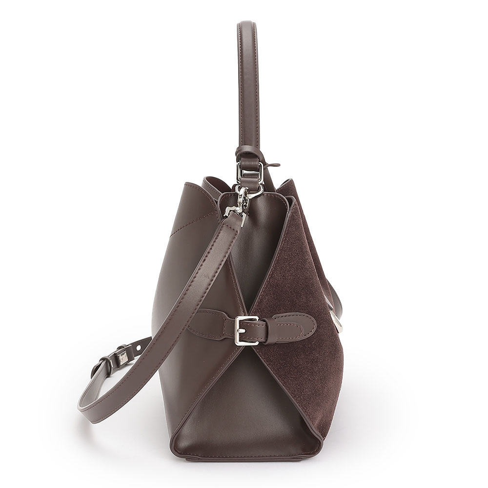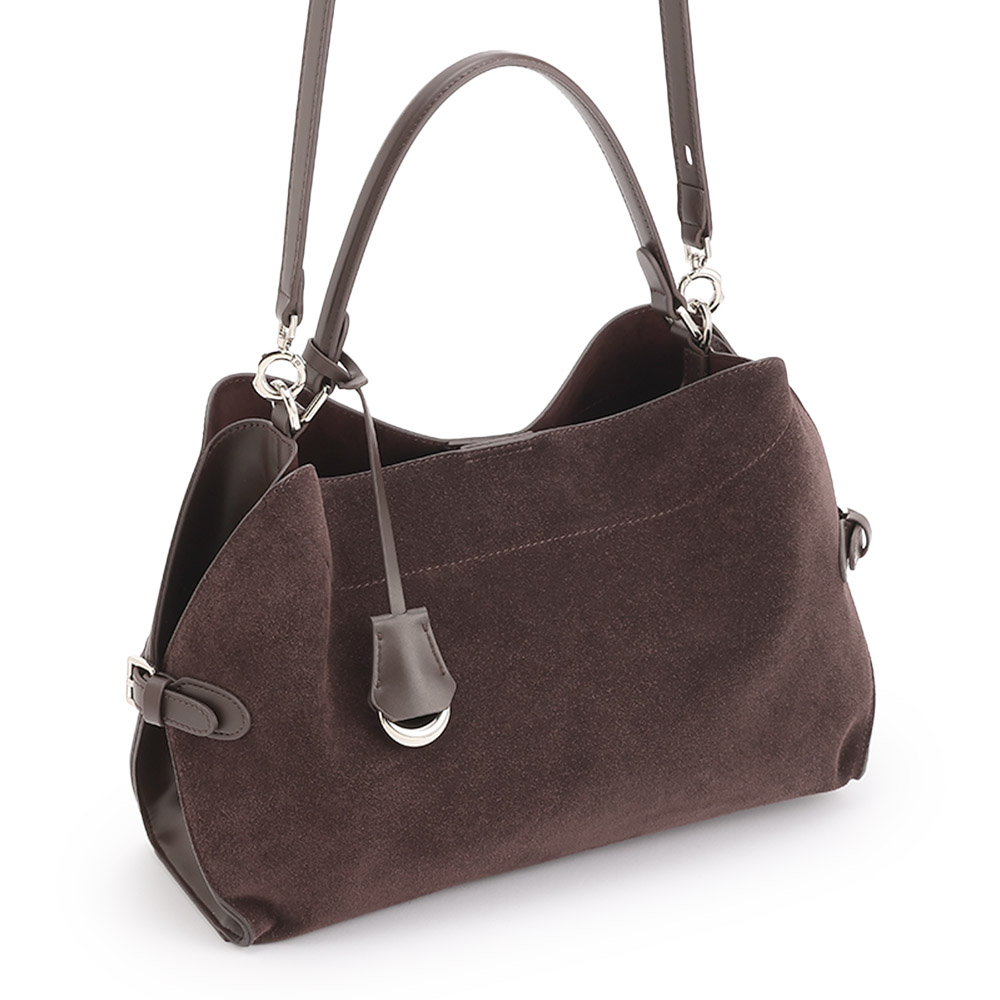 こなれたニュアンスの深色スエードに注目。シンプルモダンに機能も充実前胴は表情豊かなスエードレザー、他は同色系のソリッドな素材を使用した素材コンビバッグ。立体的なフォルムやサイドのベルトデザインなど細部にまで拘った仕様に。付属のインポーチ付きで収納力も上々。