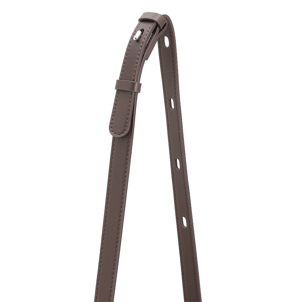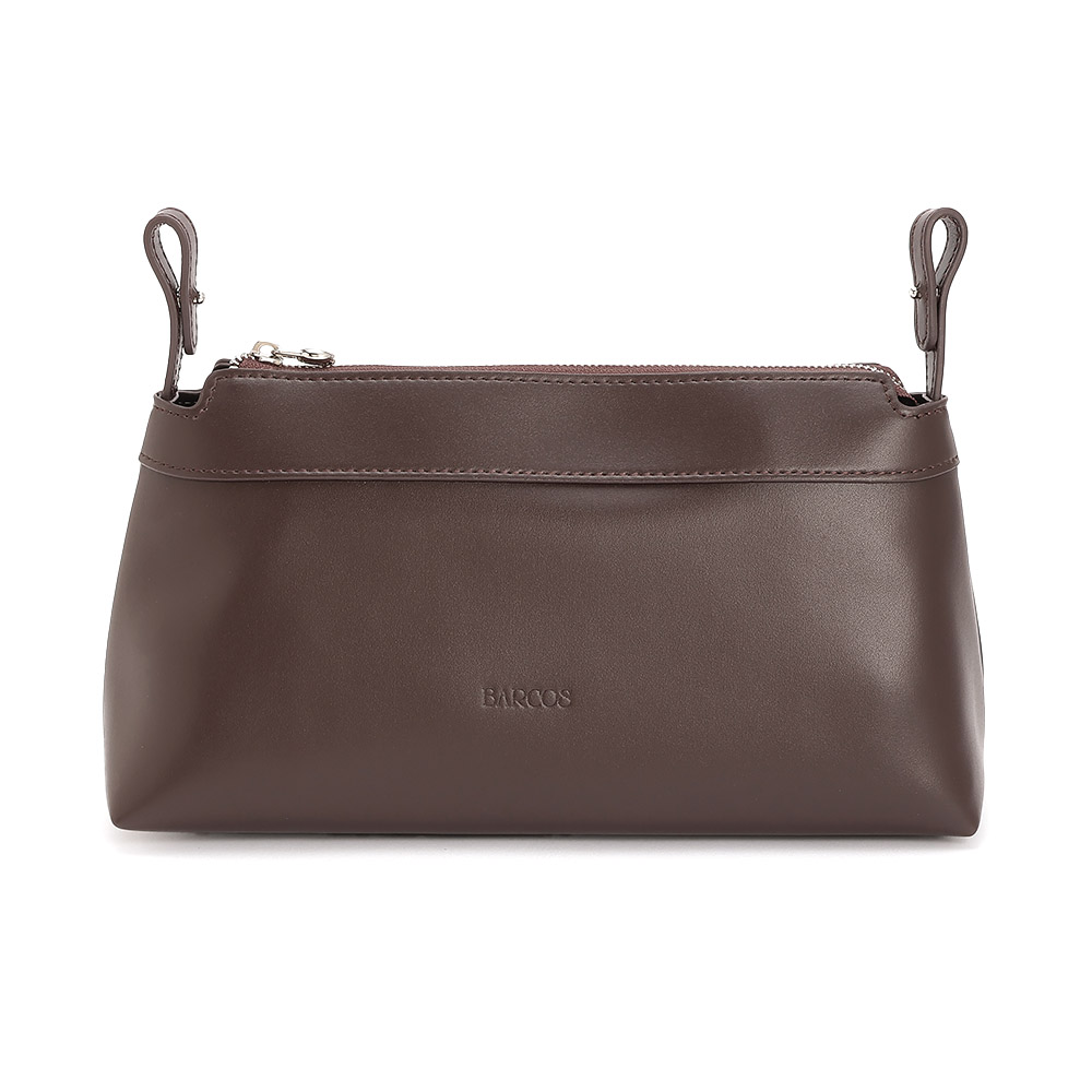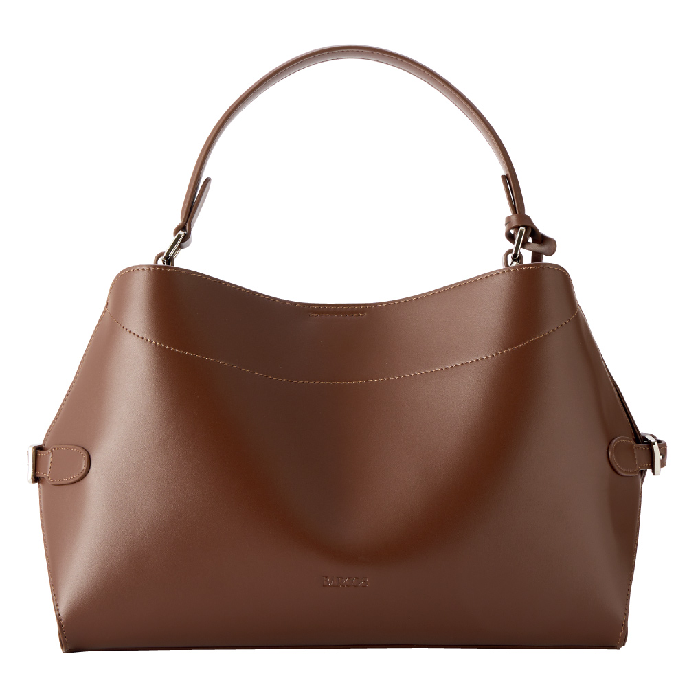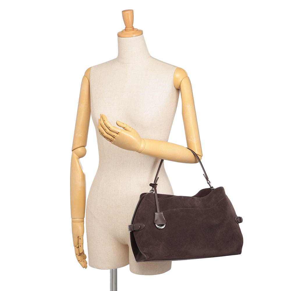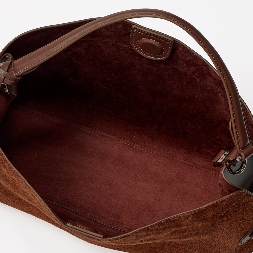 こなれたニュアンスの深色スエードに注目。シンプルモダンに機能も充実前胴は表情豊かなスエードレザー、他は同色系のソリッドな素材を使用した素材コンビバッグ。立体的なフォルムやサイドのベルトデザインなど細部にまで拘った仕様に。付属のインポーチ付きで収納力も上々。