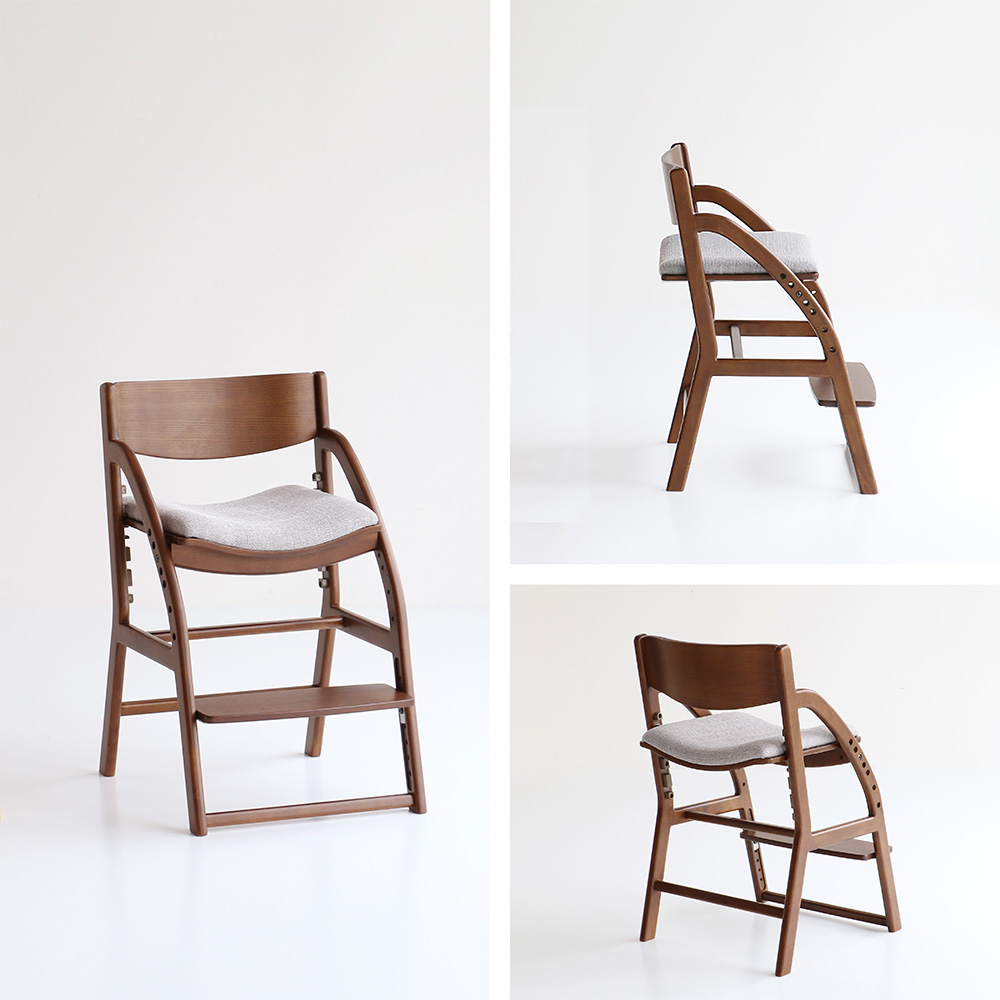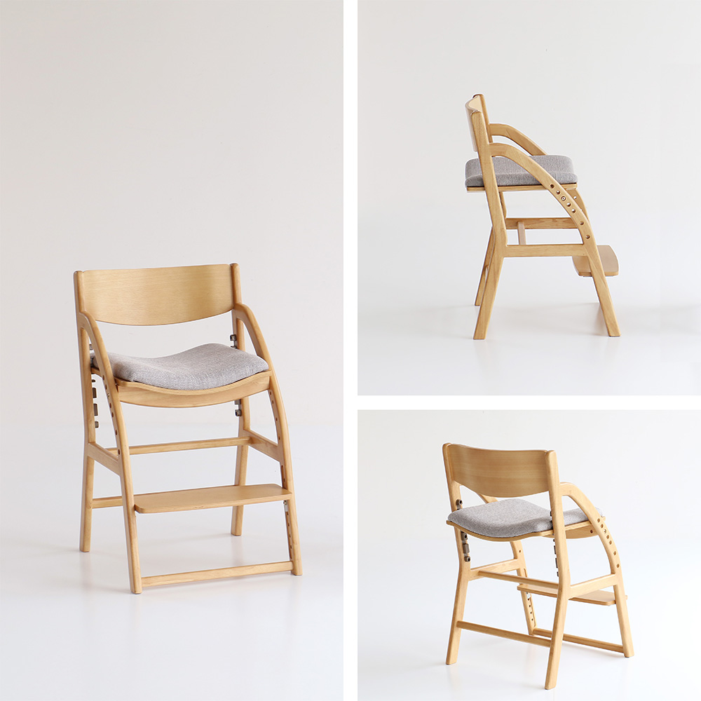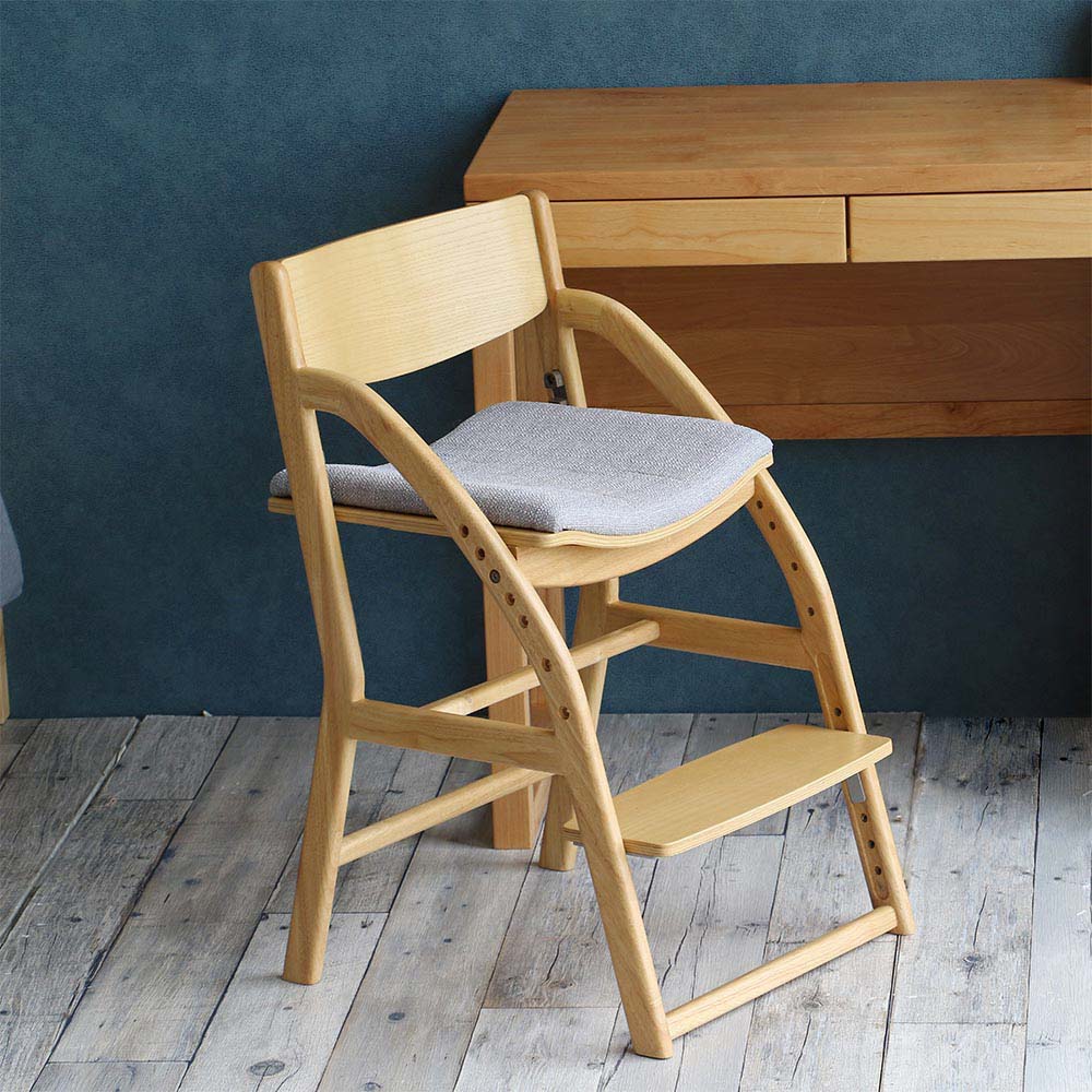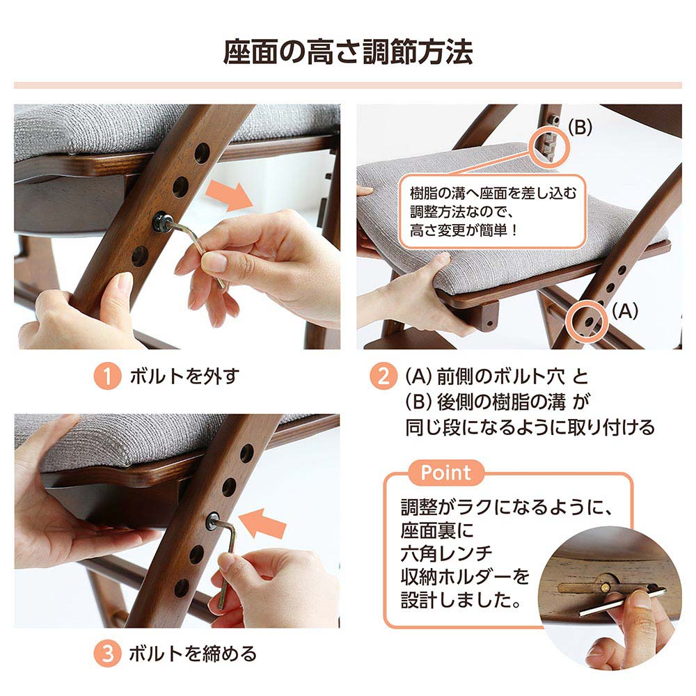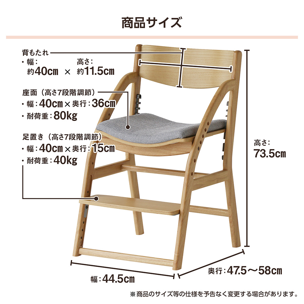 正しい姿勢を保って集中力UP! 成長に合わせた7段階の細やかな高さ調節で、学習に最適な姿勢を保ちます。ダイニングテーブルに調和するデザインは、家族に見守られながらのリビング学習にぴったり。幼少期を過ぎても、学習デスクのチェアや大人も使えるダイニングチェアとして長期間使えるロングライフ設計です。正しい姿勢で座れる椅子で、子どもが勉強に集中できる環境づくりを約1200人の小学生の体型を調査(※1)。身長によらず、正しい姿勢で座れるよう開発されたチェアです。子どもにとって大切な「正しい姿勢で座ること」を無理なく実現。正しい姿勢を保ち続けられるため、体の負担が少なく集中力が続きます。(※1)子どもが椅子に座ったときの(1)天板と太ももの距離と、膝下の高さ(2)太ももの長さ(3)肘の位置の統計を解析して、約95%の小学生の体型に合わせられるよう設計。●集中力を保つ3つのポイント【ひじが疲れにくい角度】机に手をのせると、ひじの角度が約110度に。ひじが疲れにくい、ちょうどいい位置で読み書きや作業ができます。【足がぶらぶらしない足置き】奥行15cmの広い足置きは7段階に高さ調節可能。足裏がしっかりつくので安定して座れ、集中力を妨げません。【姿勢が安定する背もたれ】背もたれは背中に沿う曲げ加工で姿勢をサポート。座面の高さを調節すると、座面の奥行も適切な位置になるこだわりの設計(※2)です。(※2)お子様が小さいうちは体に合わせて座面の奥行が狭く、成長に合わせて座面位置を下げると同時に座面の奥行も広くなり、どの高さでも背もたれが常に適切な位置になるのでしっかりと体を支えられて姿勢が安定します。成長に合わせて使える高さ調節7段階・座面と足置きの高さは各7段階に、細やかに調節可能。・身長約115cm〜170cmに対応。身長に合わせた最適な高さに設定でき、常に正しい姿勢で座れます。・幼児期から大人まで、長期にわたりお使いいただけるロングライフ設計。・インテリアに合わない子どもチェアを使いたくない方や、良いものを長く使いたい方にもおすすめです。2層構造のクッション座面で、長時間座っていても快適・座面は曲げ加工で体にフィット。・中材はウレタンフォームとウレタンチップの2層構造なので、座面もヘタりにくく疲れにくい仕様です。・体の軸がブレず、疲れにくいので長時間座り続けても快適です。家族に見守られて安心して勉強できる「リビング学習」をサポート・ダイニングテーブルでも使いやすい、ナチュラルでシンプルなデザイン。・子ども部屋でのひとり学習が不安な時期も、家族のそばで安心して学習できます。・体に合わない大人用のダイニングチェアで姿勢が悪くなる心配も解決します。・お子様が成長したら、子ども部屋で学習デスクのチェアやダイニングチェアとして活躍。・勉強するときだけでなく、お食事タイムなど日常的にお子様の姿勢をサポートします。「頭のいい子に育ってほしい…」。お子様への、そんな想いを応援します・勉強は子どもが自分でがんばるしかないけれど、よりよい環境を整えてあげることは大人の役目です。・正しい家具選びで毎日の集中力を重ねて勉強に自信をもたせ、大きな成果につなげてあげましょう。・お子様を大切に想う気持ちがこもったチェアなら、毎日座るお子様にも愛情が伝わります。ほかにも、うれしい気配りがいろいろ・角をなめらかに丸めて安全性に配慮した、幼児期のお子様にも安心なやさしい肌ざわり。・組み立て不要の完成品でお届けしますので、組み立てる時間がない方、組み立てが苦手な方もすぐにお使いいただけます。・高さ調節も簡単で、使う道具も付属の六角レンチだけ。工具のご用意は必要ありません。なくしがちな六角レンチは、椅子の裏に収納できるので安心です。・足置きは、お子様が大きくなったら取り外せます。