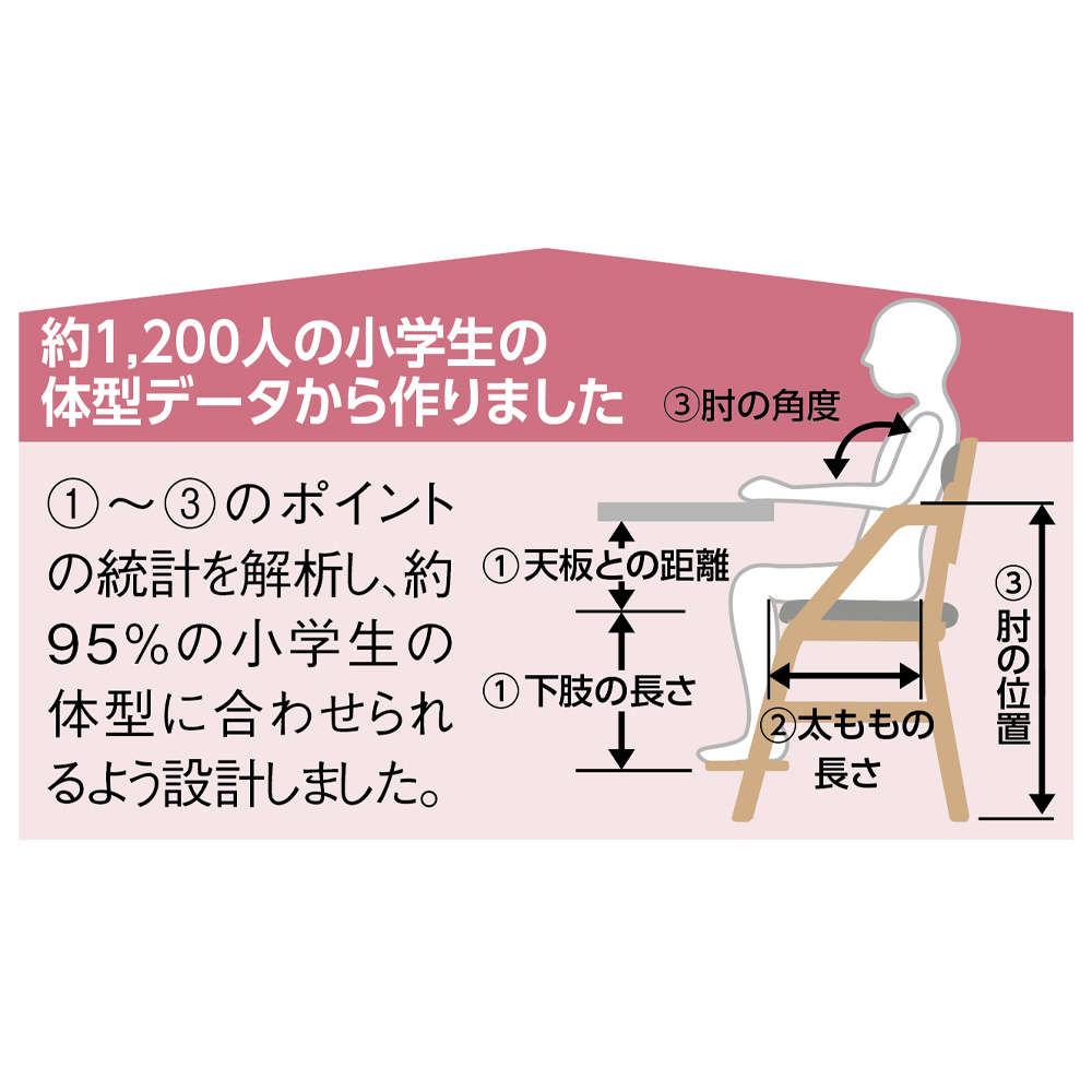 【正しい姿勢を保てる=集中力が続く】1200人の子どもの体型調査を行い、どの身長でも、ほとんど全ての子どもの体型に合う寸法に設計された学習椅子です。