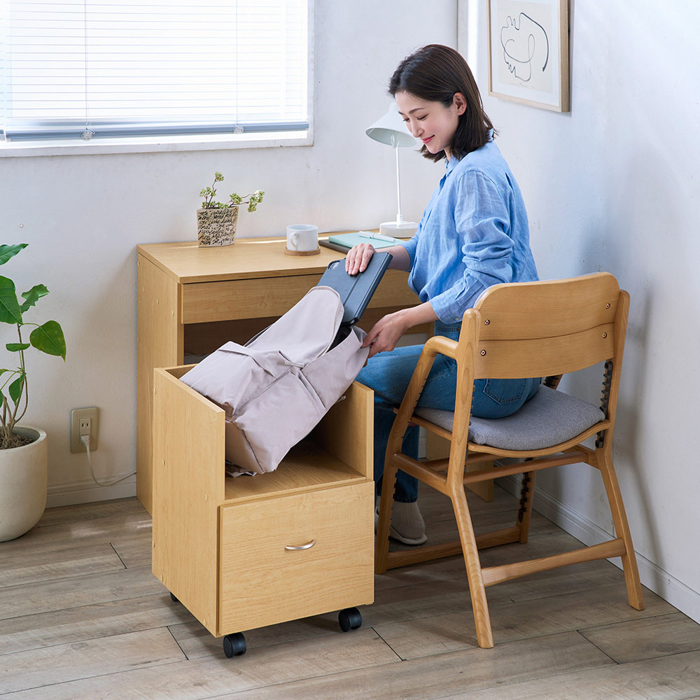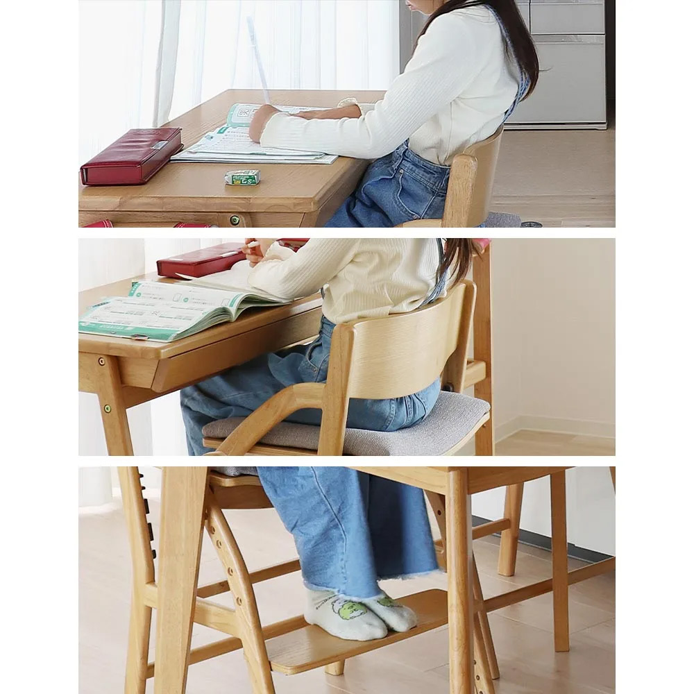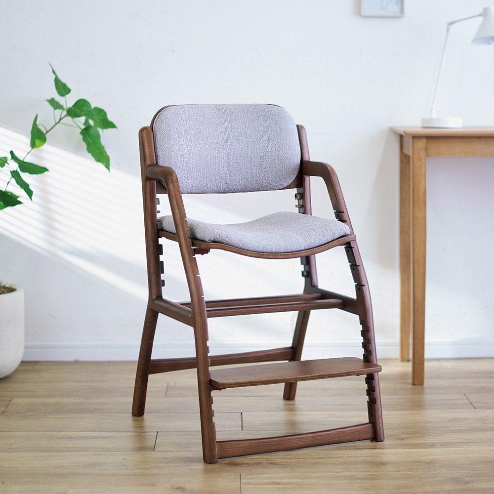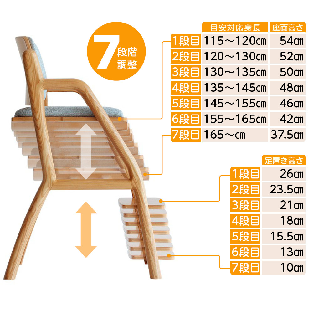 細やかな高さ調節で正しい姿勢を保って、集中力UP! 「頭のいい子を目指すチェア」シリーズに、高さ調節がワンタッチで簡単にできる最新版が登場。身長によらず正しい姿勢で座れるよう開発された構造により、体の負担が少なく集中力が続きます。気軽に高さ変更できるから子供も大人も毎日使える、家族にうれしい一台です。子どもから大人まで、正しい姿勢を保って集中力UP!(イ)ブラウン約1200人の小学生の体型を調査し、身長によらず正しい姿勢で座れるよう開発されたチェアです。幼児期の子どもから大人まで年齢を問わず、学習や仕事の集中力を保ちやすい姿勢で座ることができます。インテリアになじむデザインで、お子さまの食事からリビング学習までサポート左:(ア)ナチュラル、右:(イ)ブラウンシンプルなデザインは、おしゃれなダイニングテーブルともマッチ。小さなお子さまが家族に見守られて安心して勉強できる「リビング学習」もサポートします。簡単に座面の高さを変えられる新設計で、大人のワークチェアとしても活躍(ア)ナチュラル ※デスク&ワゴンは別売りのコンパクトデスク&ワゴン スターターセットです座面と足置きはボタンで簡単に高さ調節可能。足置きも簡単に取り外せるので、夕方はお子さまのリビング学習、夜は大人のワークチェアとして、時間帯で使い分けることもできます。もちろん、大人も正しい姿勢で座れて集中力アップ!約1200人のデータでわかった“頭のいい子”を目指せるヒミツ※写真のチェアは同シリーズ別モデルの使用例●集中力を保つ3つのポイントは(1)ひじが疲れにくい角度(2)姿勢が安定する広々とした背もたれ(3)足がぶらぶらしない足置きそれら3点を考慮した設計により正しい姿勢を保ち続けられるため、体の負担が少なく集中力が続きます。座面と足置きの高さは、それぞれ7段階にきめ細かく調整可能小さいお子さまが座るときは体に合わせて座面の奥行が狭く、伸びた身長に合わせて座面位置を下げると座面の奥行も広くなります。どの高さでも背もたれが常に適切な位置になるので、しっかりと体を支えられて姿勢が安定します。幼児から大人まで長く使えるロングライフ設計です対応身長の目安は115〜170cm。小さなお子さまが成長して、大人になっても使える長期の使用を想定した設計。良いものを長く使いたい方にもおすすめです。高さ調節は、はめこむだけのワンタッチで工具いらず座面や足置きの高さ調節は、(1)座面下の赤いボタンを押して座面を前に引き抜く。(2)希望の高さに座面を差し込み、銀色のボタンを押して完了。工具もいりません。美しい木目を生かし、小さな手にもやさしく加工温もりある木肌は、なめらかで心やすらぐ手触り。2層構造のクッションはヘタリにくく、体の軸がブレず疲れにくいので、長時間座り続けても快適です。組立不要の完成品なので、届いてすぐ使えます。詳細サイズは、こちらでチェック(ア)ナチュラル集中力を保つために大切な「正しい姿勢」を、いろんなシーンで実現しますお子さまのリビング学習や食事に。小中高の学生時代を通じて学習机のチェアとして。大人のテレワークや趣味のデスクチェアとしてなど、使うシーンも多彩。きっと、家族みんなのお気に入りチェアになります。