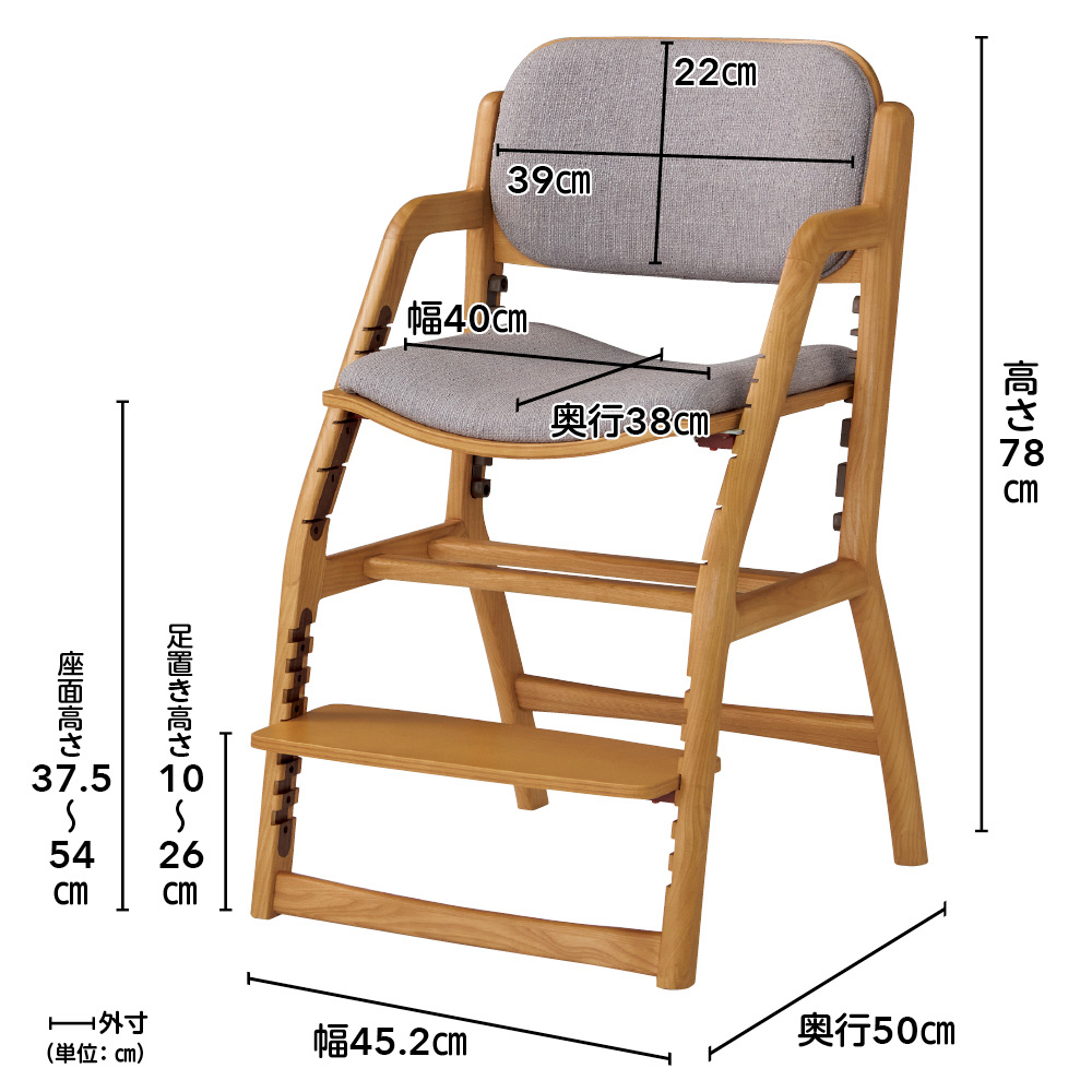 詳細サイズ(単位:cm) ダイニングに違和感なく置ける子供チェア。座面と足置きの高さ調節が可能で、大きくなっても長く愛用できます。 ※足置きは取り外しできます。