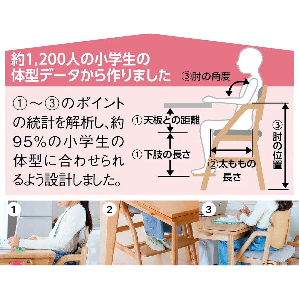 【正しい姿勢を保てる=集中力が続く】1200人の子どもの体型調査を行い、どの身長でも、ほとんど全ての子どもの体型に合う寸法に設計された学習椅子です。