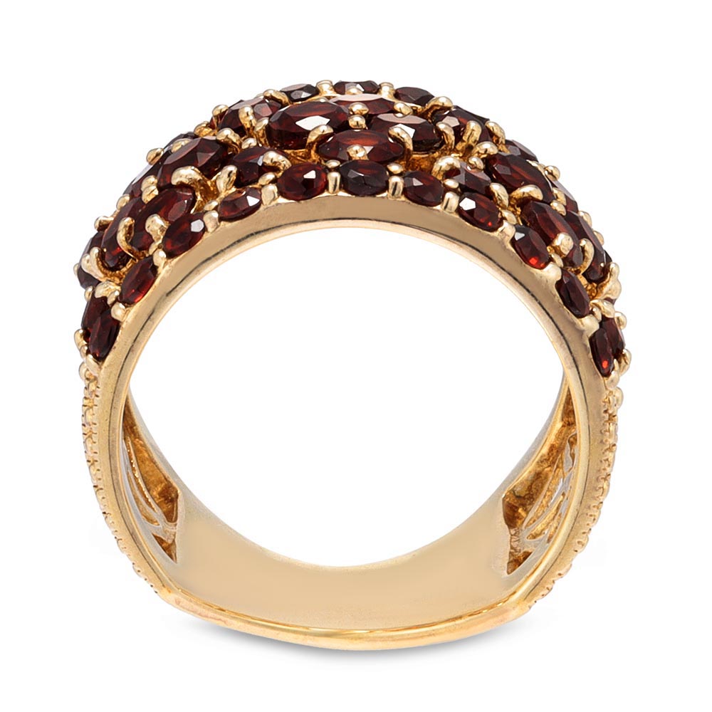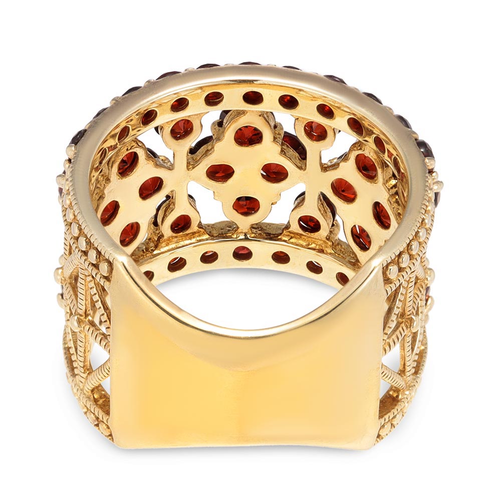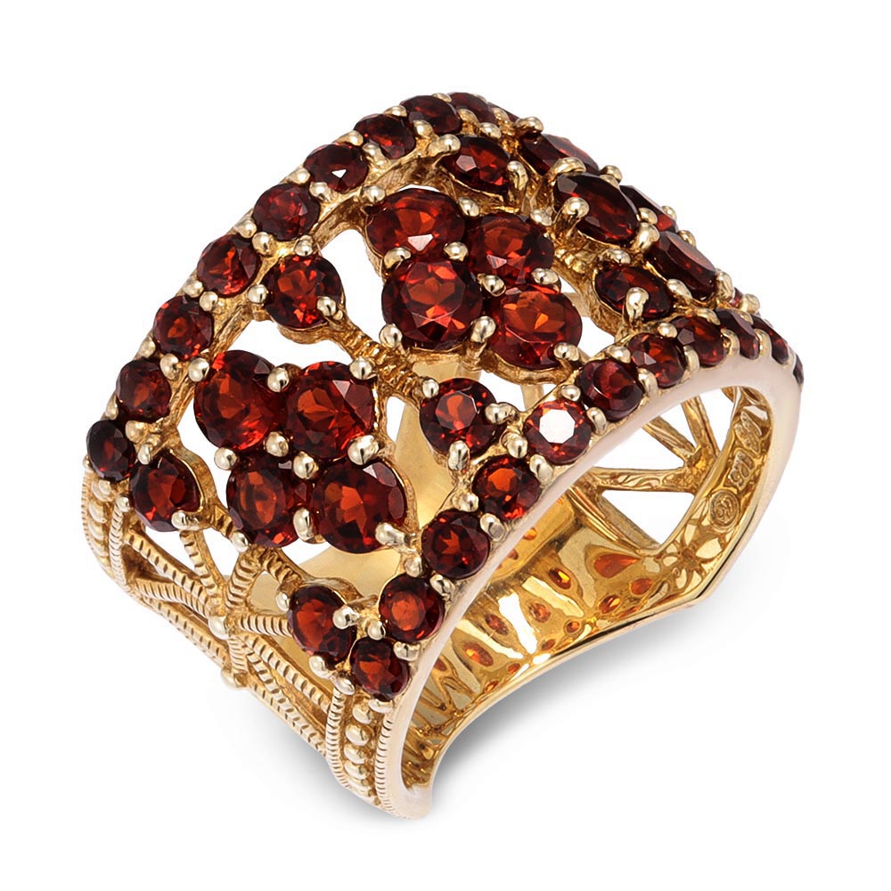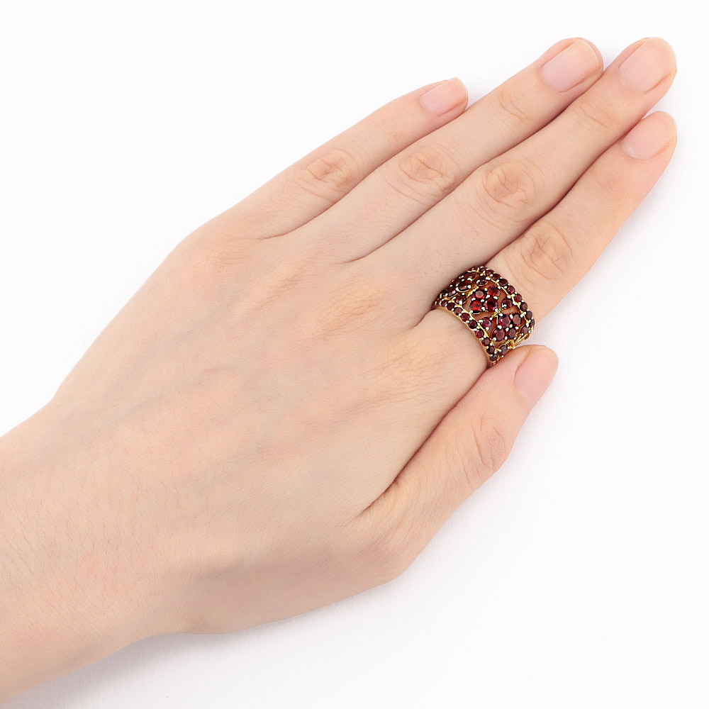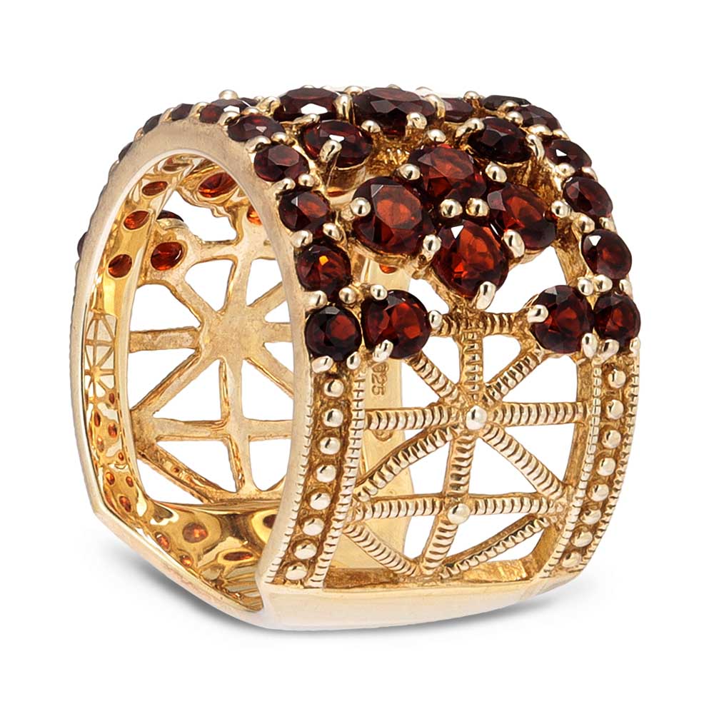 「碌山」の世界観を彩るガーネットの趣深い赤精緻なカットと多彩なシェイプが、ガーネットの華やかさを引き立てるアイテム。花モチーフを思わせる幅広リングは「碌山」らしいアンティークテイスト。