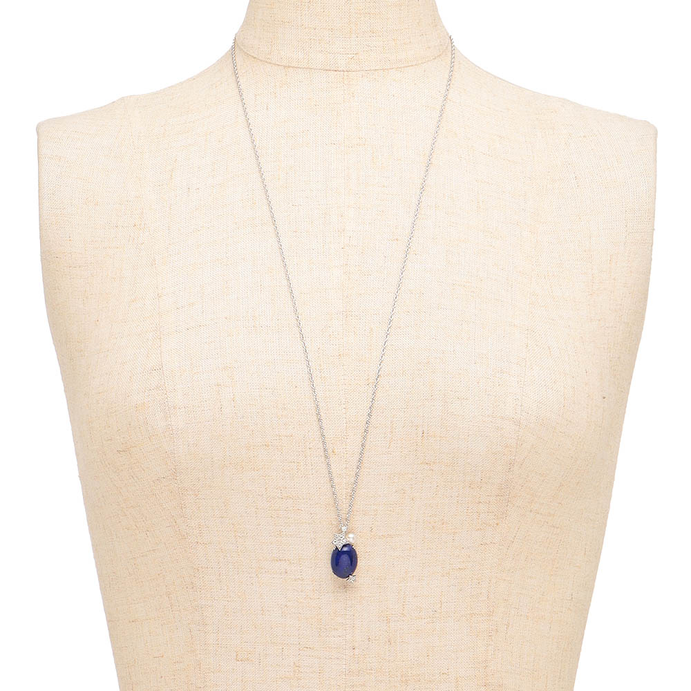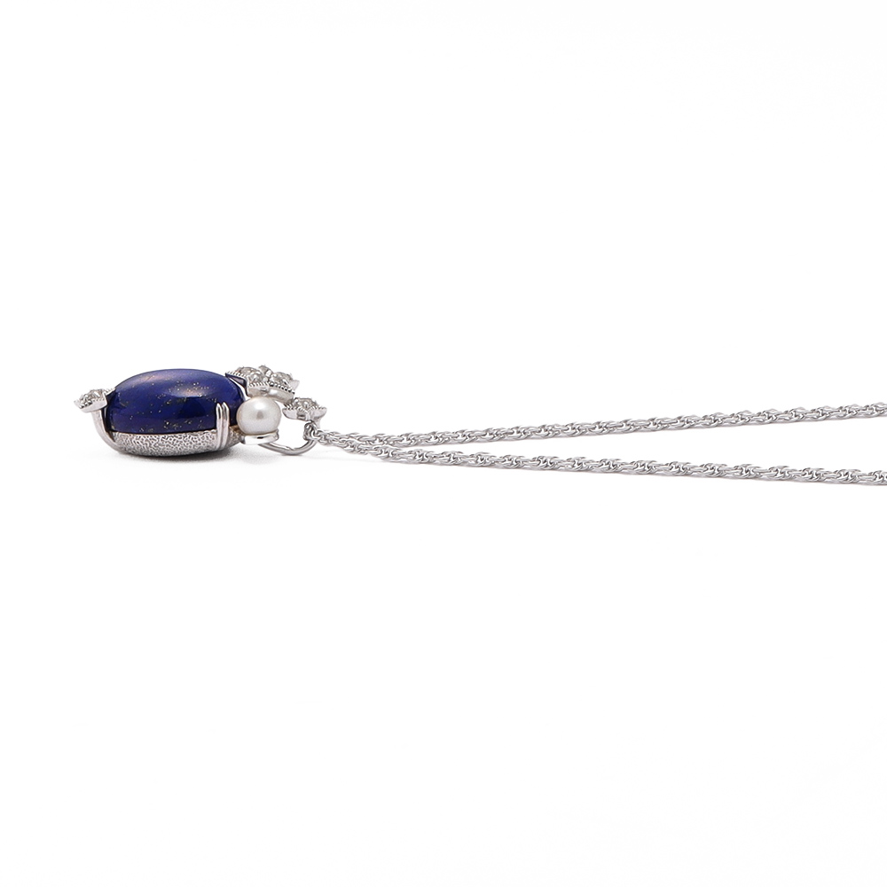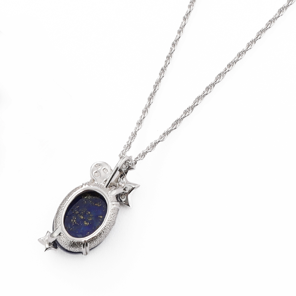 「碌山」の世界観を彩るラピスラズリの静謐な青オーバルカボションが瑞々しい艶感のラピスラズリ。深い青を夜空に見立て、ホワイトトパーズの星とパールを添えたロマンティックなデザインのペンダント。