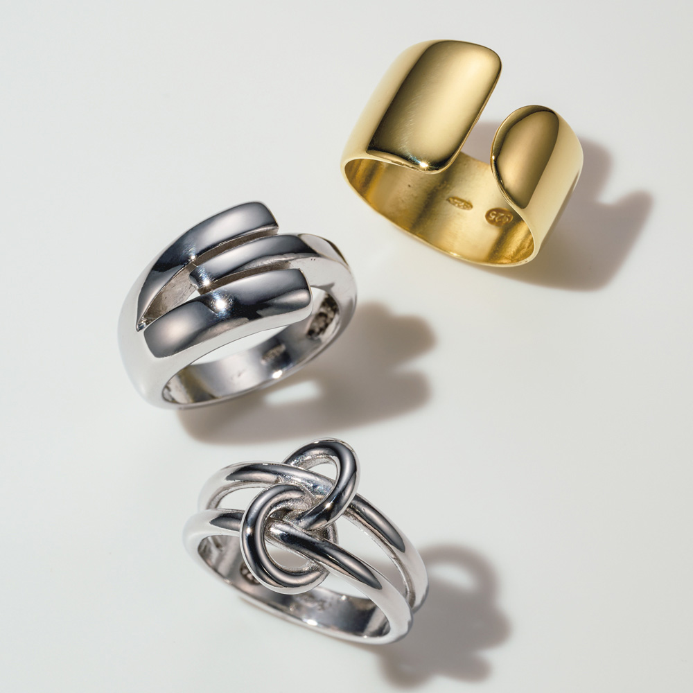 装いに旬を吹き込むジュエリー・トレンド洗練されたムードのカギとなる旬のジュエリーと、洒落て見えるアレンジ法で装いをアップデート。イタリア「プリマプレッジオシ」のスタイリッシュなシルバーリング。2本のリングを中央のノット(結び目)でつないだ、軽やかな立体感が魅力のリング。