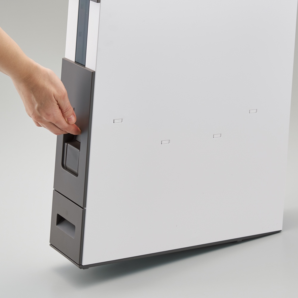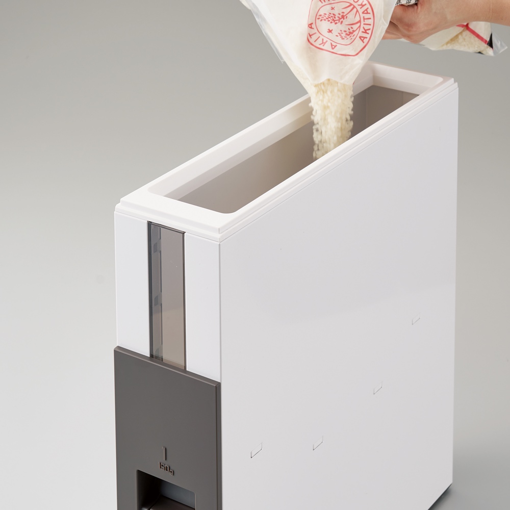 キッチンのすき間に収まる幅10cm。工夫満載の使いやすいアイデア米びつ。丈夫な鋼板製、キッチンの隙間における幅10cm!わずか10cmのすき間に置ける省スペースの米びつです。中にお米が少し残っていてもさらに5kgのお米1袋分を補充できる6kgの容量設定。付属のアタッチメントで0.5合の計量もできます。一回押し下げると一合計量できるレバー方式の採用 すぐに使え、簡単に計量したい方も満足のシンプル設計。米受けの先端が尖っているため、炊飯釜に投入する際もこぼれにくい形状になっています。また、簡単に清掃ができるので常に清潔に保つ事ができます。キャスター付き後部にキャスター付き。前を少し浮かせるとラクに移動できるので、隙間に入れても引出すのが楽々です。