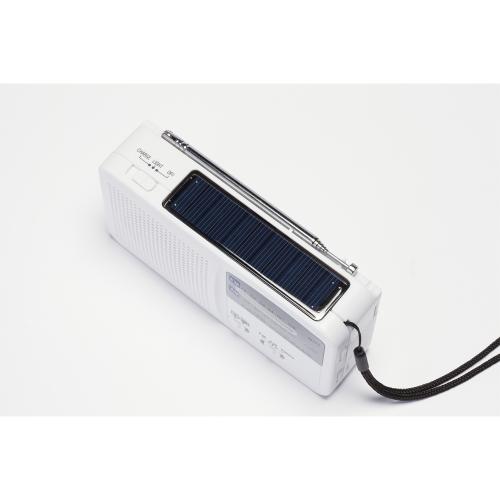 コンパクトなボディに非常時役立つ機能を満載した、6WAY携帯充電ラジオ。日中ソーラー充電が可能です。