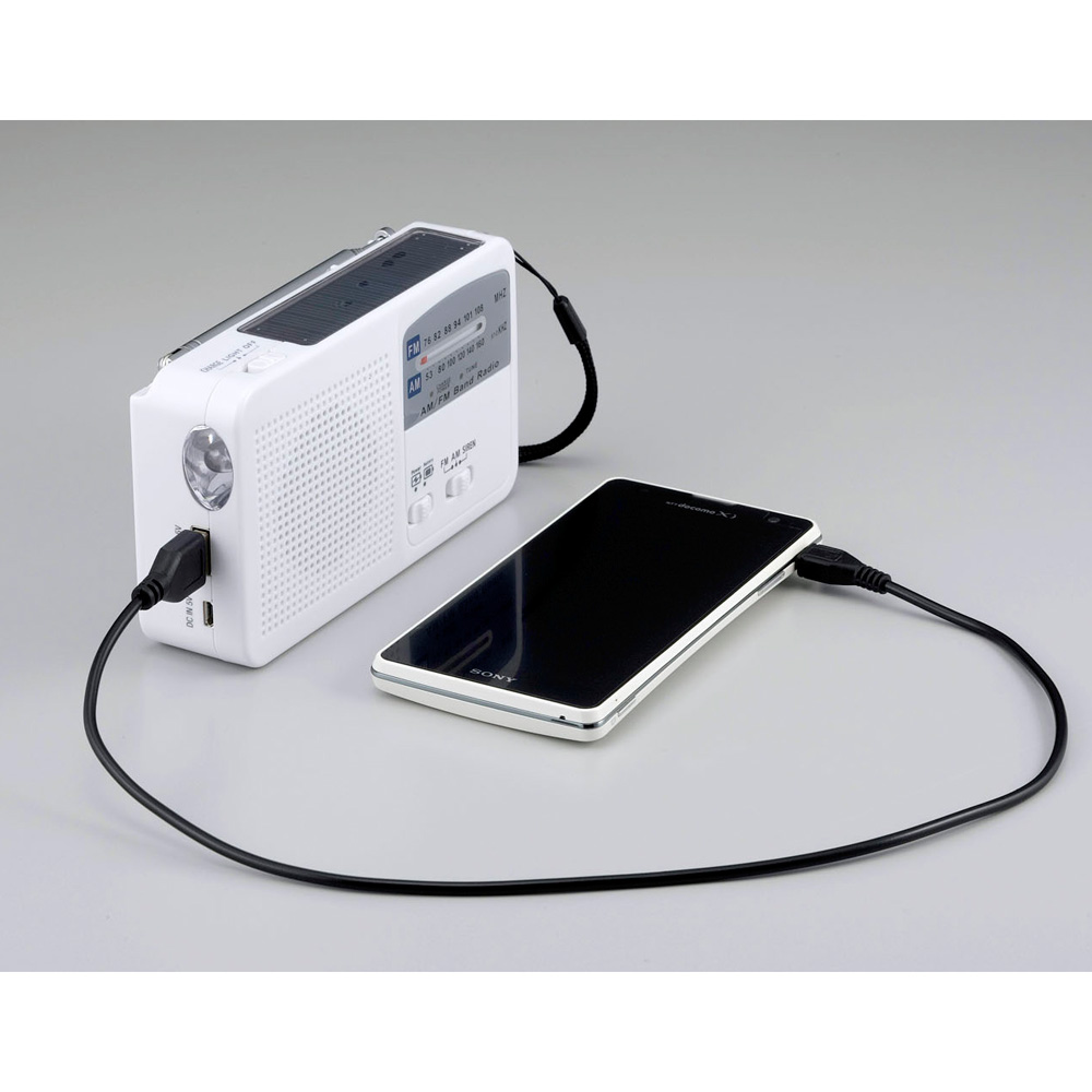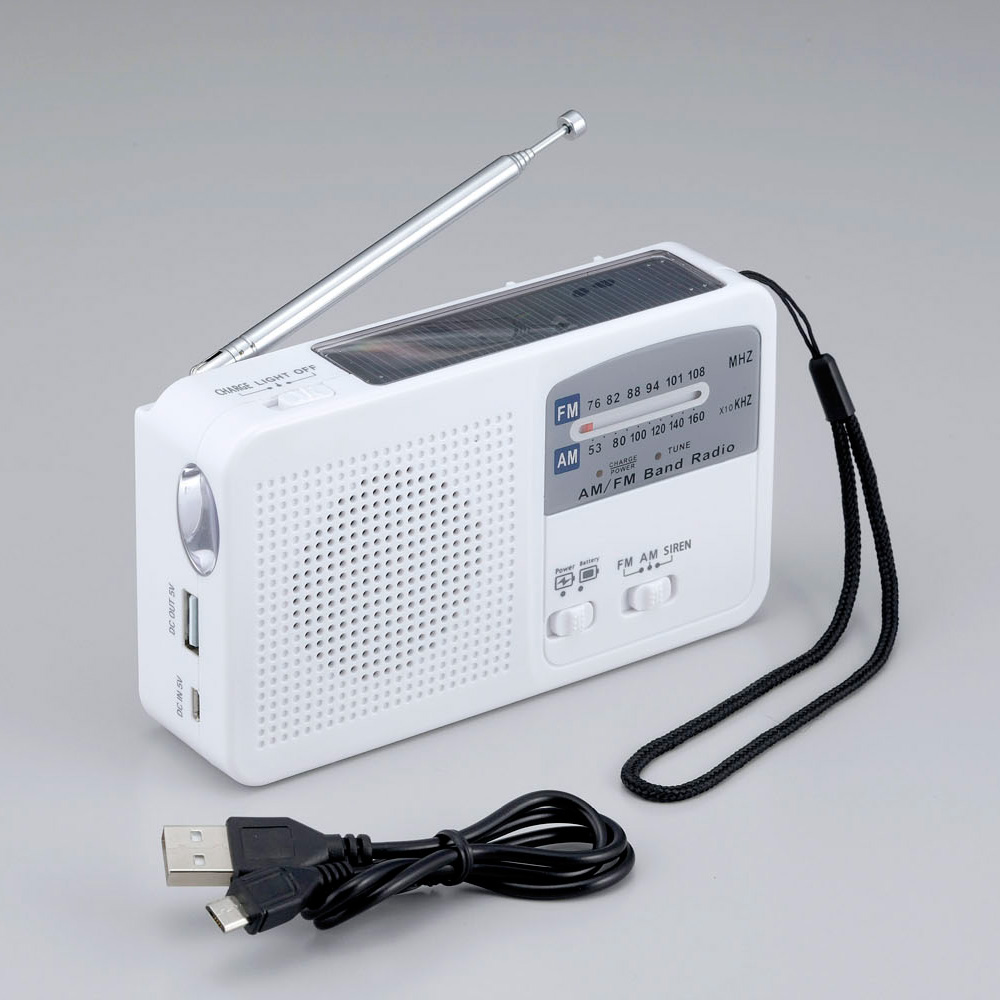 コンパクトなボディに非常時役立つ機能を満載。 コンパクトなボディに非常時役立つ機能を満載■ソーラー充電・手回し充電・携帯電話の充電・サイレン・LEDライト・AM/FMラジオの6種類の使用ができます。■コンパクトなサイズなので持ち運びしやすく、緊急時にカンタンに使用できます。■充電が無くなっても単4乾電池3本(別売り)で使用可能です。■携帯充電は、USB充電コードをつなげばカンタンに充電できます。iPhoneも対応(USBコードは、純正のコードをお使いください。)■充電方法:/ソーラー充電/手回し充電/外部コンセント充電の三種類になります。外部コンセント充電は、付属のUSBケーブルでの充電を行ってください。■ライトの明るさは、45、000-55、000MCD(ミリカンデラ)になります。■ワイドFM対応(ワイドFMとは、FM補完放送)なぜ今、防災グッズが必要なの?近年、地震や豪雨など災害リスクを感じる機会が増え、需要が高まっている防災グッズ。水道や電気などのインフラが途絶えたら?避難所に行けなかったら?いざという時に自分や家族を守る備えが今こそ必要なんです。家族全員が一週間暮らせる用意をしましょう!