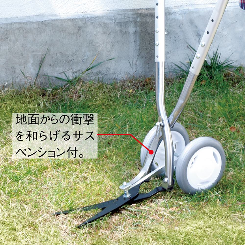 腰をかがめずゆったり草刈り。芝生の手入れに、雑草退治に、腰を伸ばしたラクな姿勢でハサミのようにチョキンチョキン。自分のペースでゆったり作業できるのは、電動式には望めないこのタイプならではです。自立するのも嬉しいポイント。