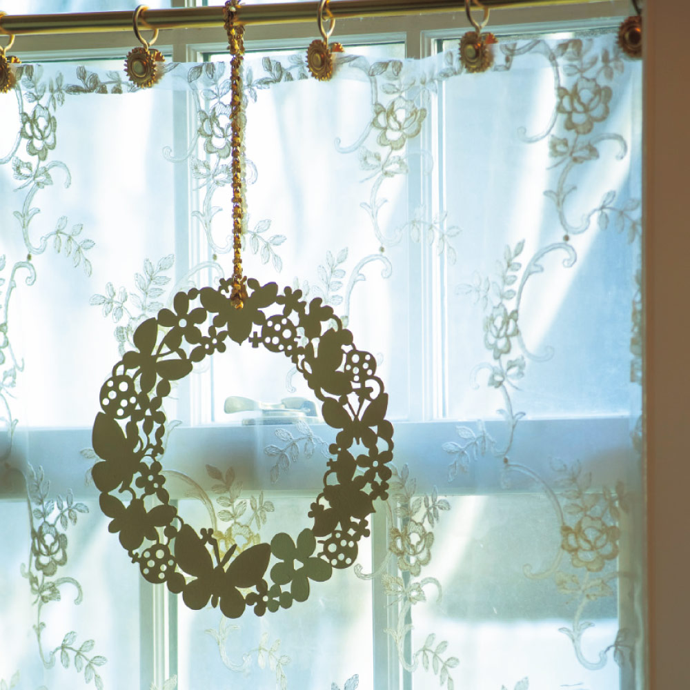 自然光で煌めきと影絵のシルエットを楽しむ幸せを願って飾る光のリース。つつがなく続く幸せを意味する円形のガーデンリース英国園芸研究家・吉谷桂子さんデザイン。ゴールドがお庭のアクセントに。影を楽しむのもオススメ。レーザーカットで綺麗に仕上げたリースです。リースを近くで見てみると…お花、ミツバチや蝶、テントウムシなどお庭の中にいる仲間たちでできたデザイン!▼吉谷さんコメント「花咲く庭に集うミツバチ、蝶々、テントウムシをつなぎ添わせ、自然界の愛おしい友達の輪をデザインしました。時間と共に変化して輝く自然光の反射や、時折背後にできる影絵も楽しんで!」。【吉谷桂子/KEIKO YOSHIYA】英国園芸研究家、ガーデン&プロダクトデザイナー。7年間英国に在住した経験を生かしたガーデンライフを提案。さまざまなイベントや雑誌などに出演するほか講師を務め、著書も多数。