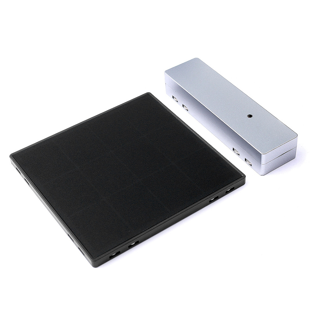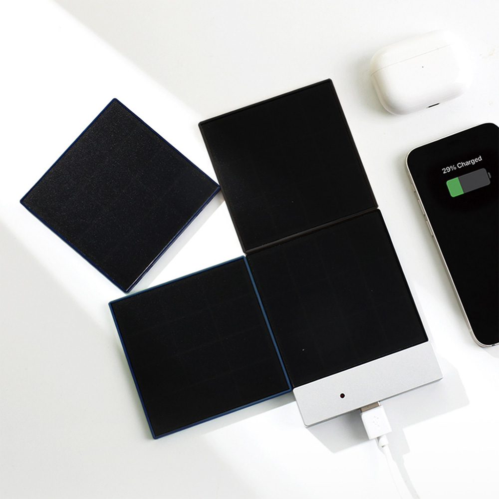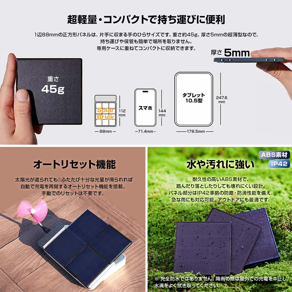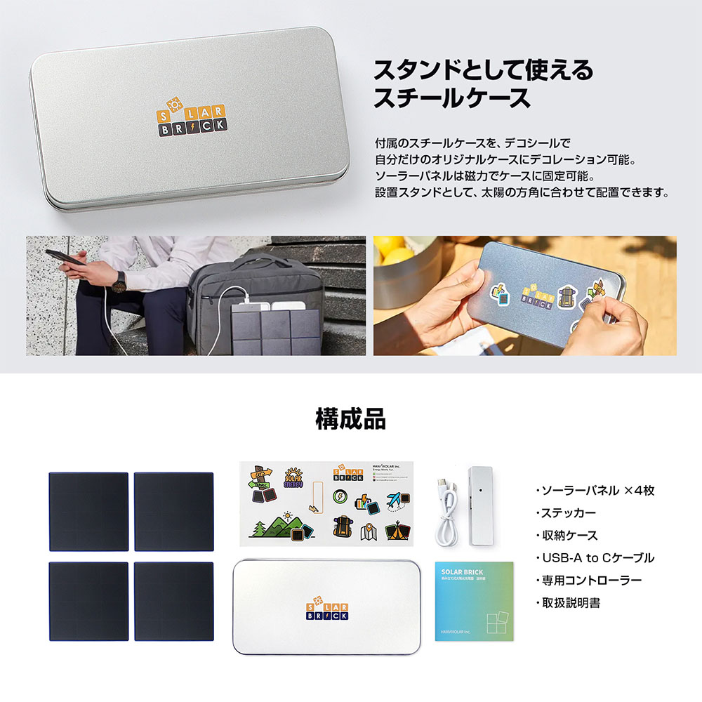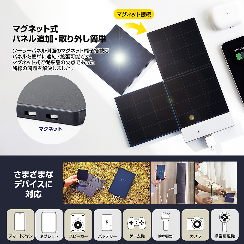 マグネット式で簡単に組み立てられるコンパクトなソーラーパネル充電器。スマホやタブレットなどのUSBデバイスに対応し、どこでも太陽光下であれば充電可能。災害時やアウトドアで大活躍します。●マグネット式でパネル追加・取り外し簡単ソーラーパネル側面のマグネット端子搭載でパネルを簡単に連結・拡張可能です。災害時やアウトドアなど、電源が確保しづらい場面で活躍します。※別売りのオプションパネルを追加すると、最大12枚までパネルを連結可能で、最大10Wの出力を実現。●さまざまなUSBデバイスに対応スマートフォン、イヤホン、モバイルバッテリー、携帯扇風機、懐中電灯、デジタルカメラなどUSBで充電可能な機器に幅広く対応。外出先や緊急時に頼りになります。●USB-C/USB-A 搭載USB-AとUSB-Cポートを搭載し、あらゆるデバイスの充電に対応します。※定格電圧 : 5V DC、2A、パネル数・太陽光により最大出力は異なります。●太陽下であればどこでも充電iPhoneなら最短4時間で満充電。パネル4枚で最大4.6Wの出力が可能です。パネル1枚は1.2Wを発電し、使用環境に応じて組み合わせを調整できます。最大12枚まで連結可能(最大出力10W)です。10枚以上でより安定した充電が可能です。ソーラーパネル4枚:出力4.6W (iPhone16が約4時間で満充電※快晴時基準)ソーラーパネル9枚:出力10W (iPhone16が約2時間で満充電※快晴時基準)ソーラーパネル12枚:出力10W (より安定的に充電可能)※天候により充電時間が変動することがあります。●オートリセット機能太陽光が遮られても、ふたたび十分な光量が得られれば自動で充電を再開するオートリセット機能を搭載。手動でのリセットは不要です。●超軽量、コンパクトで持ち運びに便利パネル1枚は1辺88mmの正方形サイズで片手に収まるサイズ。重さ約45g、厚さ5mmの超薄型なので、持ち運びや保管も簡単で場所を取りません。専用ケースに重ねてコンパクトに収納できます。●優れた耐久性、 水や汚れに強い耐久性の高いABS素材で、踏んだり落としたりしても壊れにくい設計。パネル部分はIP42準拠の防塵・防滴性能を備え、急な雨にも対応可能。アウトドアにも最適です。※完全防水ではありません。降雨の際は屋外での充電を中止し、水滴をよく拭き取ってください。※USB端子部分は防水機能がないためご注意ください。●デコレーションができるスチールケース付属のスチールケースとデコシールで、自分だけのオリジナルケースを作成可能。アルミ素材のケースはソーラーパネルに吸着し、設置台としても使用できるため、太陽の方角に合わせて簡単に配置できます。