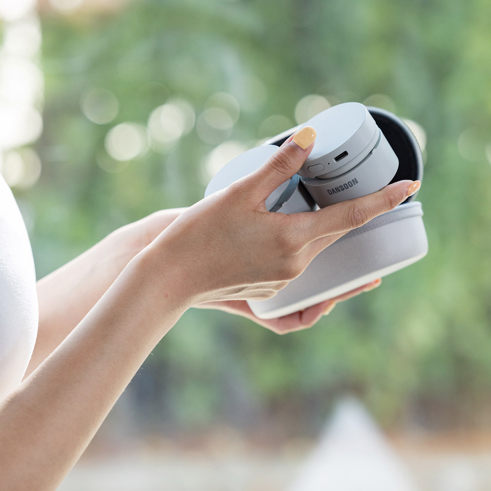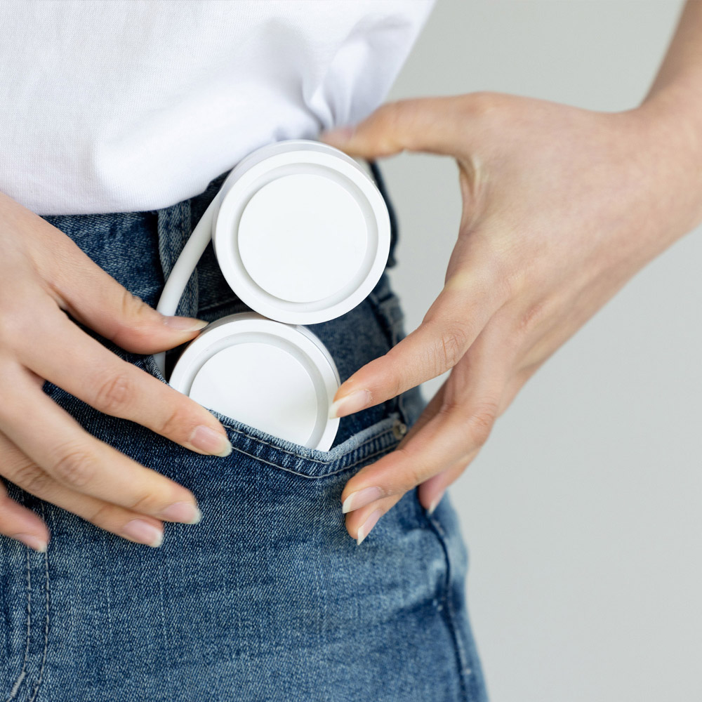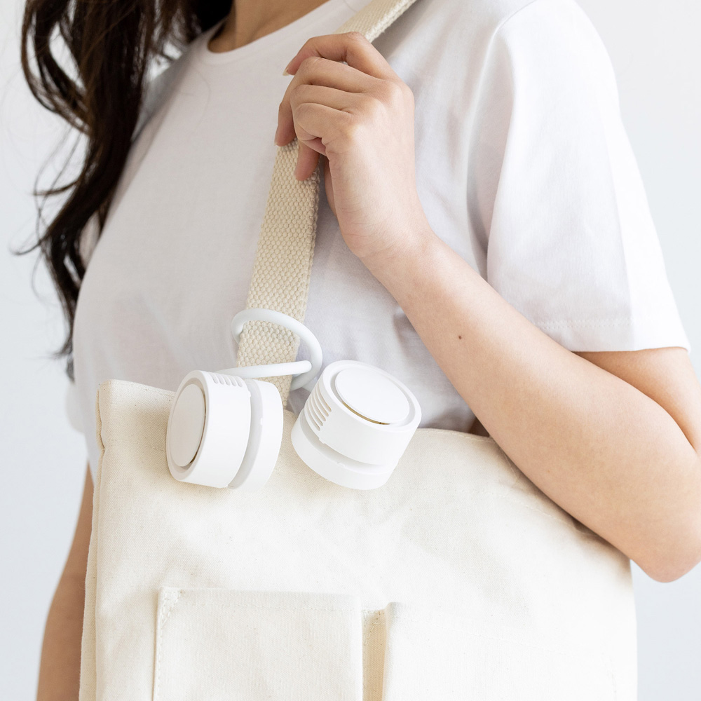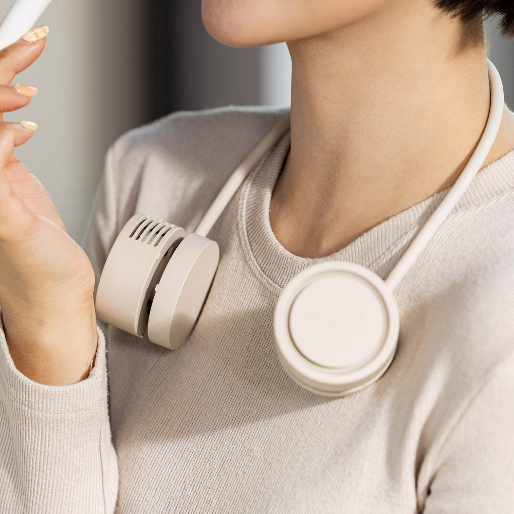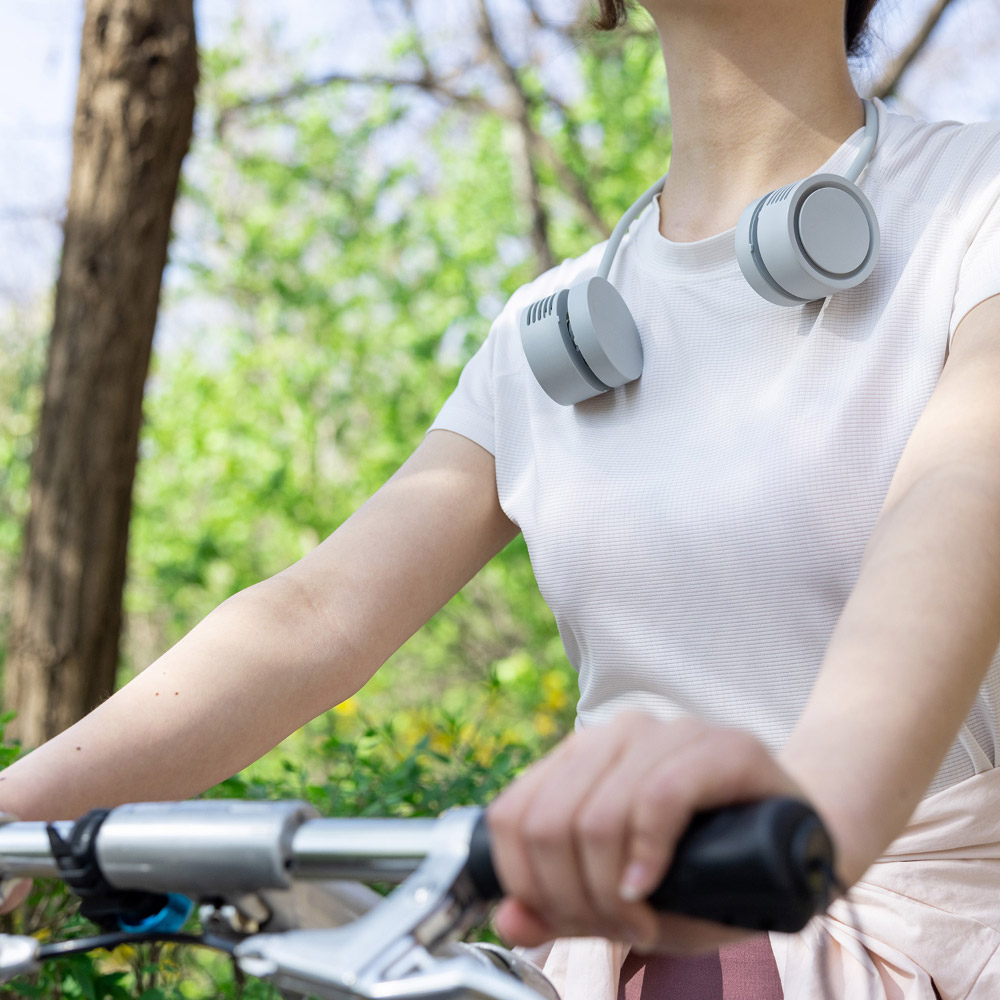 くすみカラーのミニマルデザインが目を引く、コンパクトに収納可能な首かけ扇風機。くるっと巻いてコンパクトに収納可能な首かけ扇風機。両手を自由に使える便利なハンズフリー式の羽根なしタイプで、髪や手を巻き込む心配がありません。ヘッドホンを思わせるデザインはファッションアイテムとしても大活躍します。●くるっと巻いてコンパクトに、専用ポーチ付属ネックバンドファン ROLLINGのバンドはスリムなシリコン素材。ヘッドにぐるぐると巻きつけるだけで、コンパクトに収納できます。付属のポーチは、本体色に合わせたマッチングカラー。衝撃や汚れから守り、持ち運ぶ際に便利に使えます。●180gの軽量設計、もっとスリムにスリムなネックバンド部は設計を見直すことで、前モデルFlexより約80g軽量化。日常生活でより気軽に、長時間使っても気にならないよう、首にかかる負担を軽減しました。●360°自由に角度調節、ハンズフリー自由自在に曲がるシリコン製のアームは、360°好みの角度で調節可能。左右の角度調整も簡単で風向きを自分用にカスタムして調整できます。首かけ式で、荷物が多い時や雨の日など、手を塞がずに使用できます。アームを巻くことで長さの調節もでき、自分に合わせたサイズにセットすることも可能です。●大風量でも静かな音!低騒音BLDCモーター半永久的に稼働するBLDC(ブラシレスDC)モーターを採用。長時間使用しても故障しにくく、強力な風を確保しながらも、回転音が気にならない低騒音設計です。※ 首にかけて使用する特性上、耳までの距離やその他条件により動作音の感じ方には個人差があります。●最大6.5時間使用、省エネ設計1回の満充電で、弱風で約6時間半、中風で約3時間半、強風では約2時間使用できます。充電用にはUSB-Cポートを搭載。付属のケーブルで電源アダプタ(5V/1A)に接続すれば、約3時間で本体へ満充電が可能です。※ 充電・動作時間は目安です。使用頻度や使用する条件(温度・環境)により異なります。※ 充電しながらの使用はできません。●羽根なしで安心安全ネックバンドファン Rollingは、送風にブレードレス方式(Bladeless Fan)を採用。ファン内部のタービンが回転しながら空気を吸い込み、吹出口に風を送り出す際の圧力差で強力な風力を生み出します。通常の羽根つき扇風機に比べ髪を巻き込む危険性が少ない安全な構造です。使用者の安全保護を規定した様々な国際安全基準を満たしており、品質面でも安心して使用できます。●シリコン素材で首にやさしくフィット肌に直接触れるネックバンド部分には、シリコン素材を使用。やわらかな感触で首にやさしくフィットします。肌に触れる面積を最小限にし、密着することで生じる汗やムレなどの不快感を最低限に抑えています。