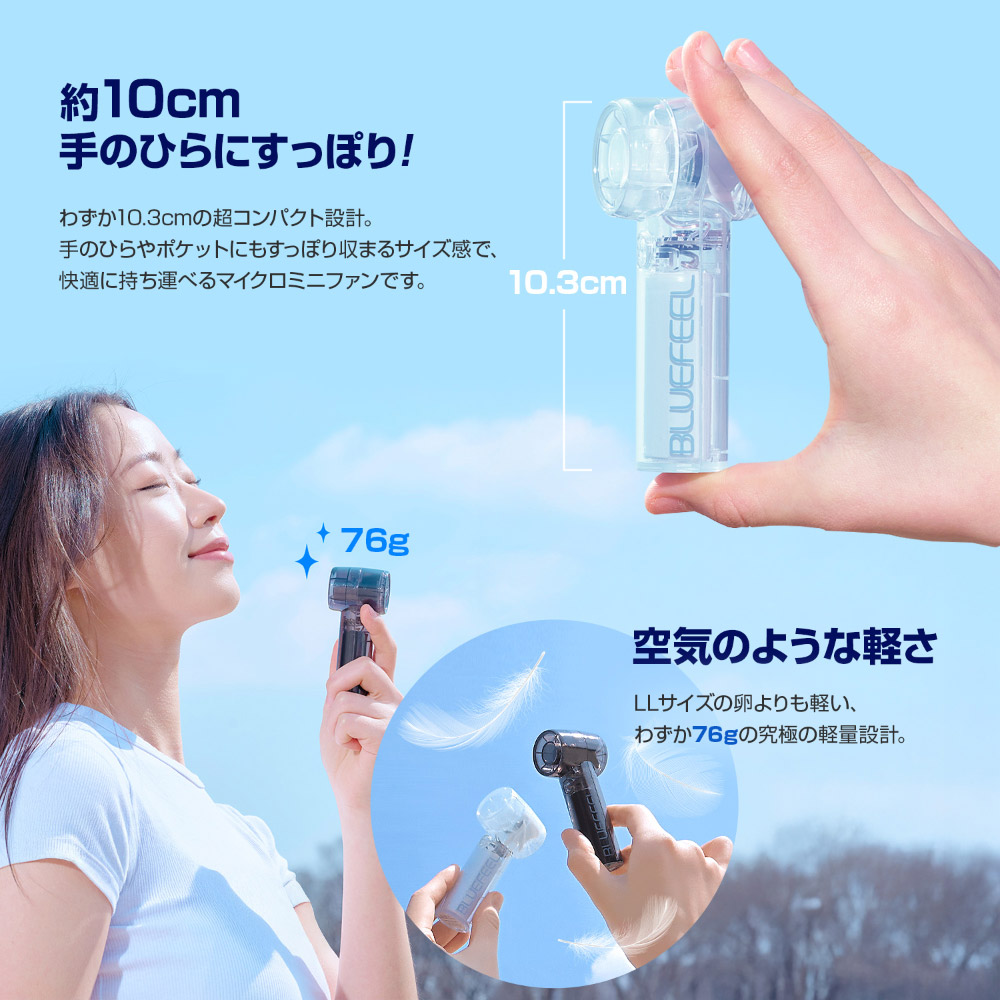 マイクロミニ級サイズ!パワフルな風と超軽量ボディ!涼しげなクリアポーチに入った、ファッションやバッグにも映える、「魅せる」ハンディファン。わずか76gの超軽量ボディに、最大15m/sのパワフルな風を秘めたミニファンです。爽やかなスケルトンデザインと、流行のミニポーチ付きで持ち歩きもおしゃれに。かわいさとパワフルさを兼ね備えた、スマートな携帯扇風機です。【マイクロミニサイズ】約10cm、手のひらにすっぽりわずか10.3cmの超コンパクト設計。手のひらやポケットにもすっぽり収まるサイズ感で、快適に持ち運べるマイクロミニファンです。【エア級の軽さ】たった76g、驚きの軽量感たまご(LLサイズ)より軽い、究極のミニマル設計。軽やかで洗練された一台です。【Zモータ搭載】2万RPM高速回転 最大15m/sの強力風Zモータが毎2万回転を実現し、最大15m/sのパワフルな風を生み出します。風量は3段階に調節可能。【スケルトンデザイン】夏に映える透明感あふれるボデイ夏にぴったりの爽やかなスケルトンデザイン。まるで氷のように透き通る、クリアな質感が、見ているだけで涼しさを感じさせてくれます。【クリアポーチxキーリング】流行のミニポーチ付きファッションやバッグにも映える、「魅せる」携帯ファンです。付属のクリアポーチに収納し、キーリングのようにバッグにぶら下げて持ち歩けるので「見せる推し活」アイテムとしても大活躍します。使いたいときにサッと取り出せる機動力も、大きな魅力です。【安心の安全設計】7重の安全回路 ×誤動作防止●指が入りにくい深型デザインファンカバーを採用●バッグの中での誤作動を防ぐため、電源ボタン2度押し方式●バッテリーには、逆起電力・過電圧・過電流・過充電・過放電・過熱・ショート防止の7重安全回路を搭載