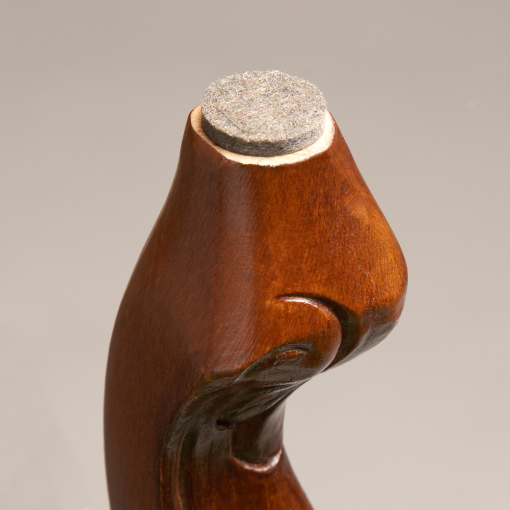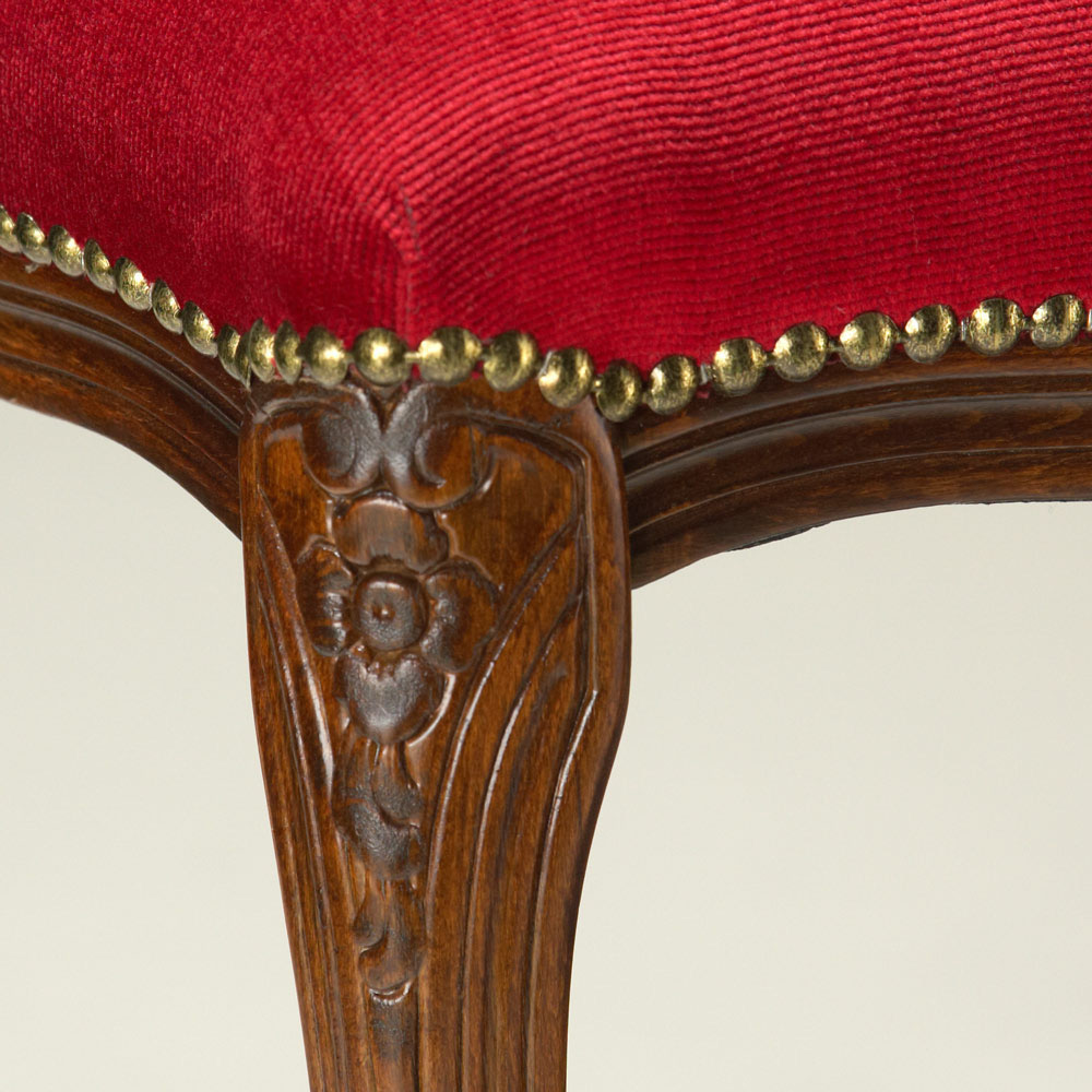 脚部にはクラシカルな彫刻が施されています。座面の張り地止めには(ア)ベージュはレース調のリボン、(イ)レッドには鋲打ちされたこだわりよう。