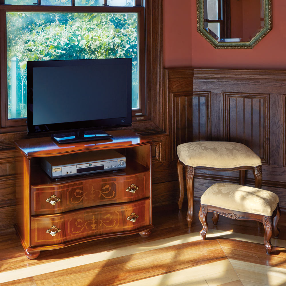 脚部にはクラシカルな彫刻が施されています。座面の張り地止めには(ア)ベージュはレース調のリボン、(イ)レッドには鋲打ちされたこだわりよう。
