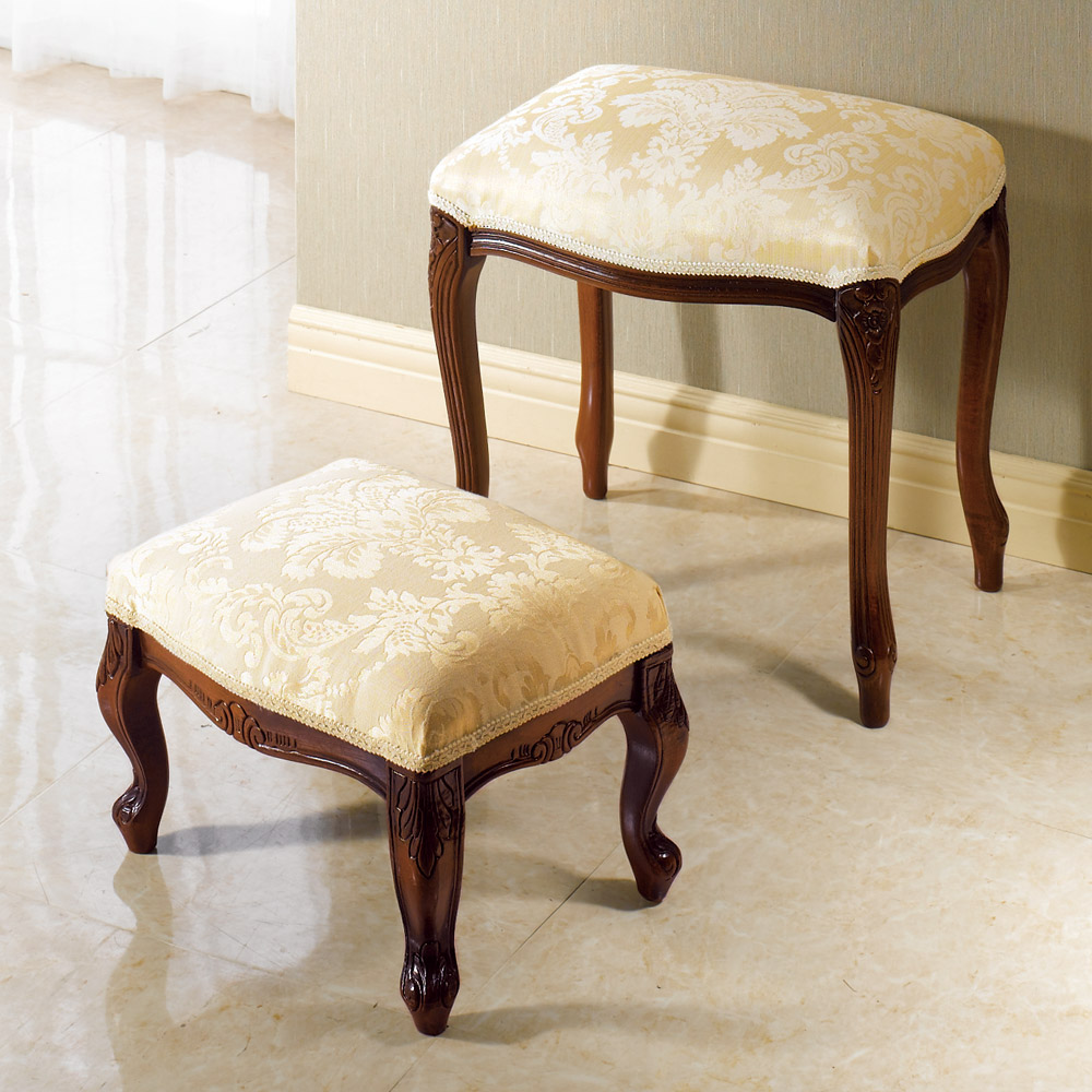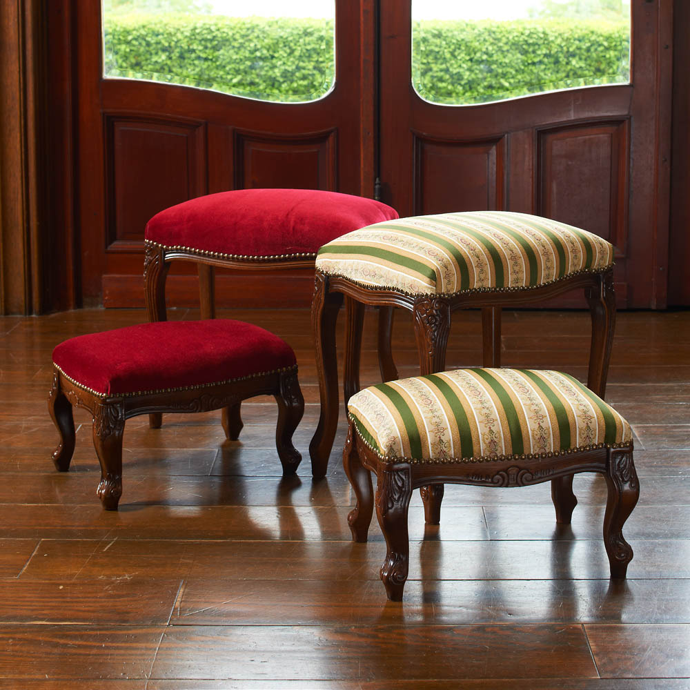 イタリア家具のクラシカルなデザインが魅力の猫脚フットスツール。簡易オットマンとして同シリーズのソファやスツールに合わせて。ダイニングの補助椅子や玄関ベンチとしても。イタリア現地職人による伝統の技が息づく、イタリアの様式美◆イタリアの家具メーカーで長年修行を積んだ熟練の職人たちが昔ながらの技法を駆使し、丹精込めて仕上げました。◆脚部は優美で流れるようなフォルムの猫脚形状。贅沢で風格漂うヨーロピアンデザインです。◆脚部・フレーム部は飴色に輝くブラウン塗装仕上げ。使いこむ程に味わいが出て、長年に渡ってお楽しみいただけます。フレームに施された彫刻や優美なネコ脚はイタリア製ならでは。◆古い歴史と伝統を受け継ぐイタリア職人が丹精こめて作り上げたスツール。◆ちょっとした簡易オットマンとして同シリーズのソファやスツールに合わせて多目的に使えるイタリア家具です。(ア)ベージュ(柄あり)光沢感のある糸で繊細な柄を表現した、クラシカルな張地を使用。(イ)レッド(無地)独特の光沢感があり、やわらかな肌触りのモケット生地を使用。※フレームと張り地の境目の装飾が(ア)レース調リボン、(イ)鋲と異なります。〜アンティーク家具の特集はこちら〜アンティーク家具の世界