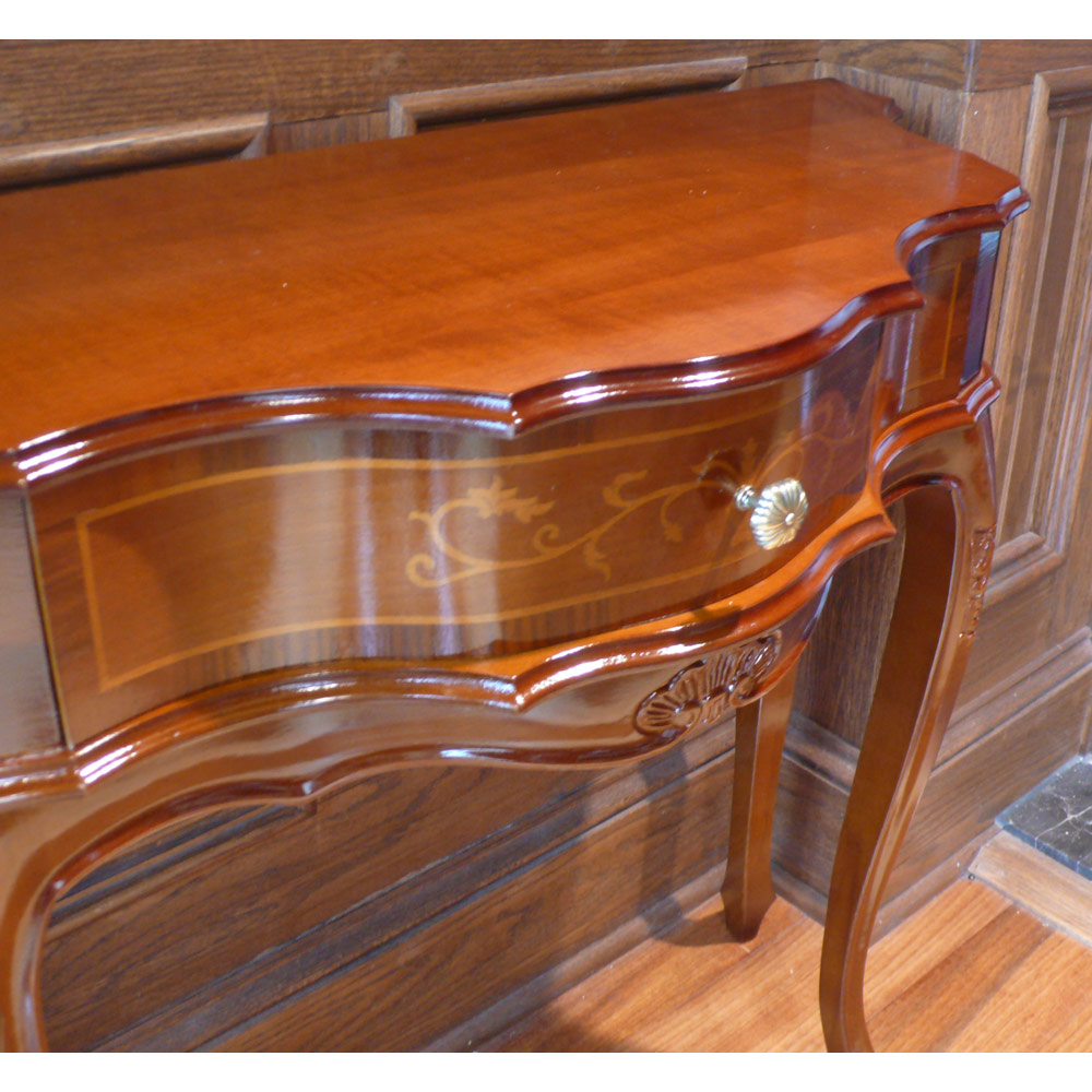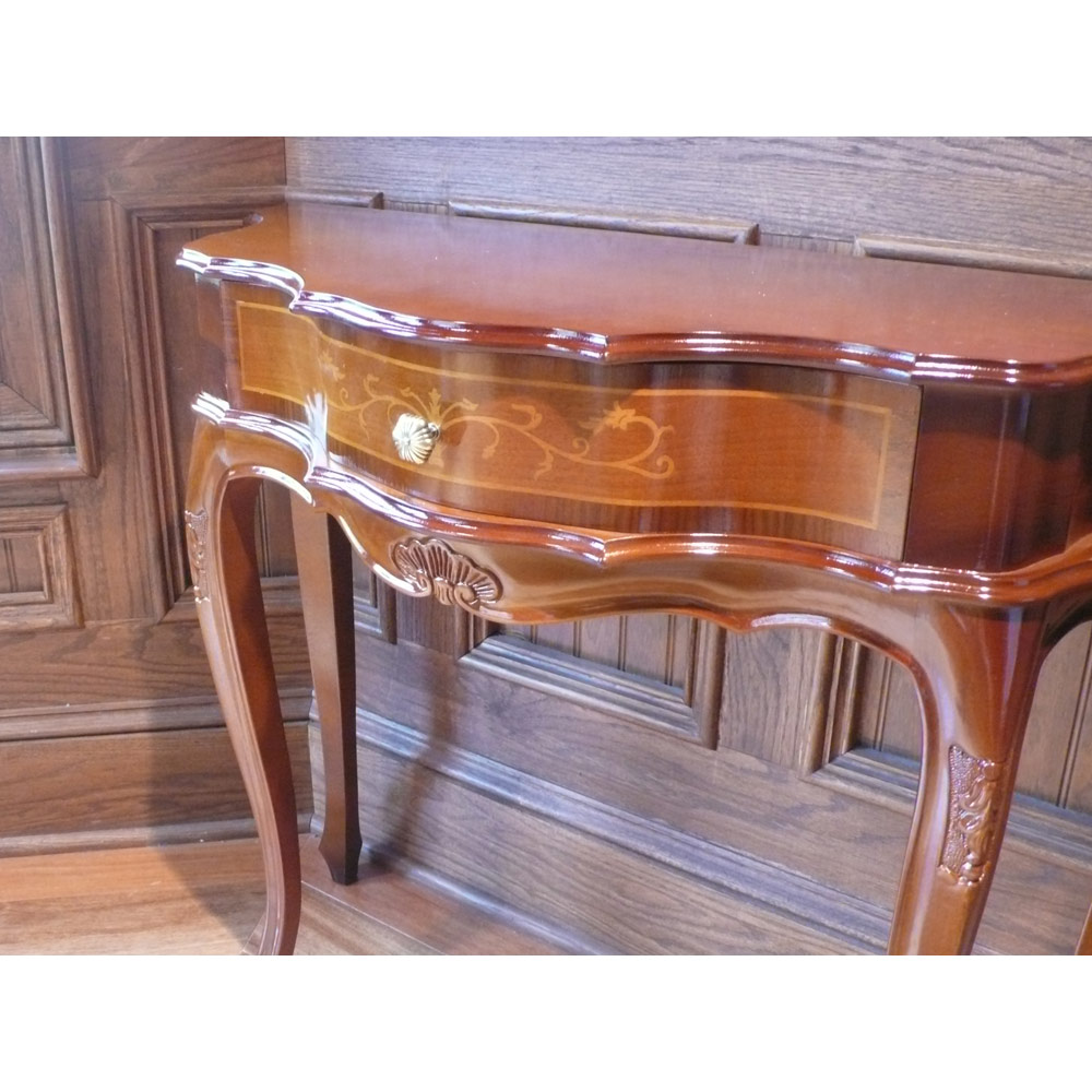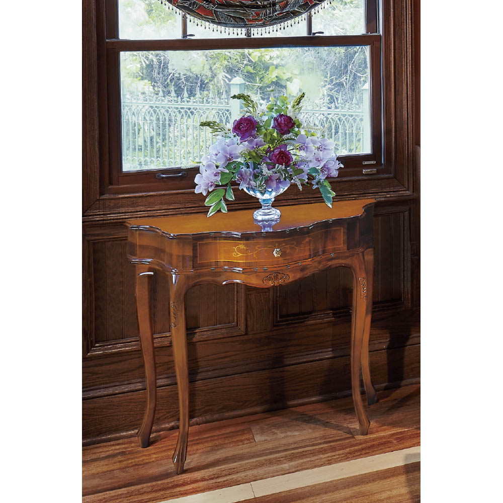 ヨーロッパの職人が現代に受け継いでいる精緻な技と美の結晶の象嵌細工を前面に施した格調高いコンソールテーブル。職人の技とイタリアの様式美。象がんとは、異なる素材を組み合わせて花柄などの紋様を表現する伝統技法。職人たちが現代に受け継いできた精緻な技と美をご堪能ください。クラシック家具の流麗なフォルムが外国のような格調高い雰囲気を醸します。シリーズの家具とインテリアコーディネートしたりエントランスに花台として置けば華やかな玄関インテリアが完成します。〜アンティーク家具の特集はこちら〜アンティーク家具の世界