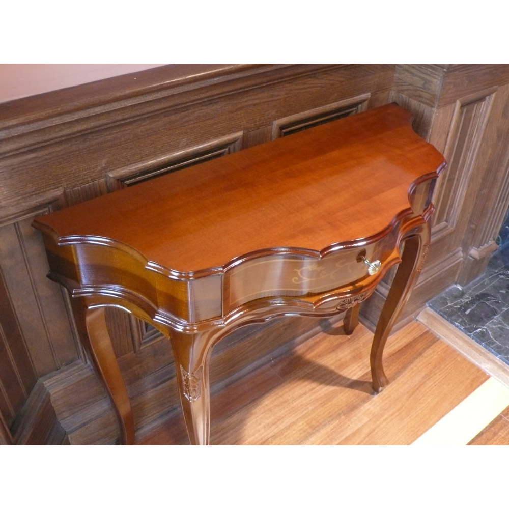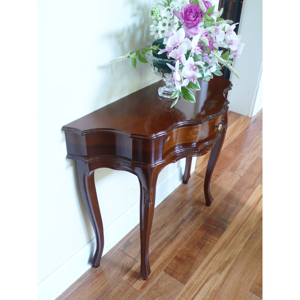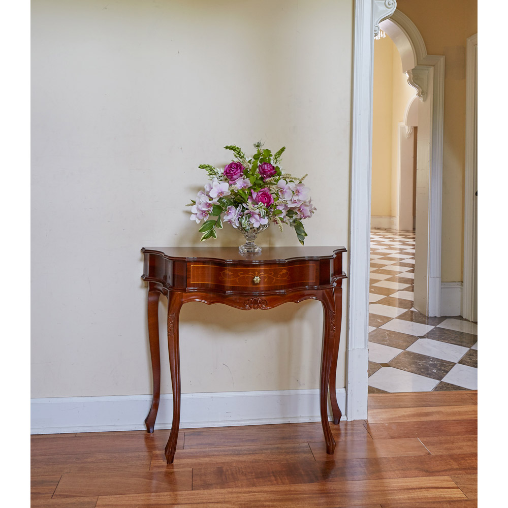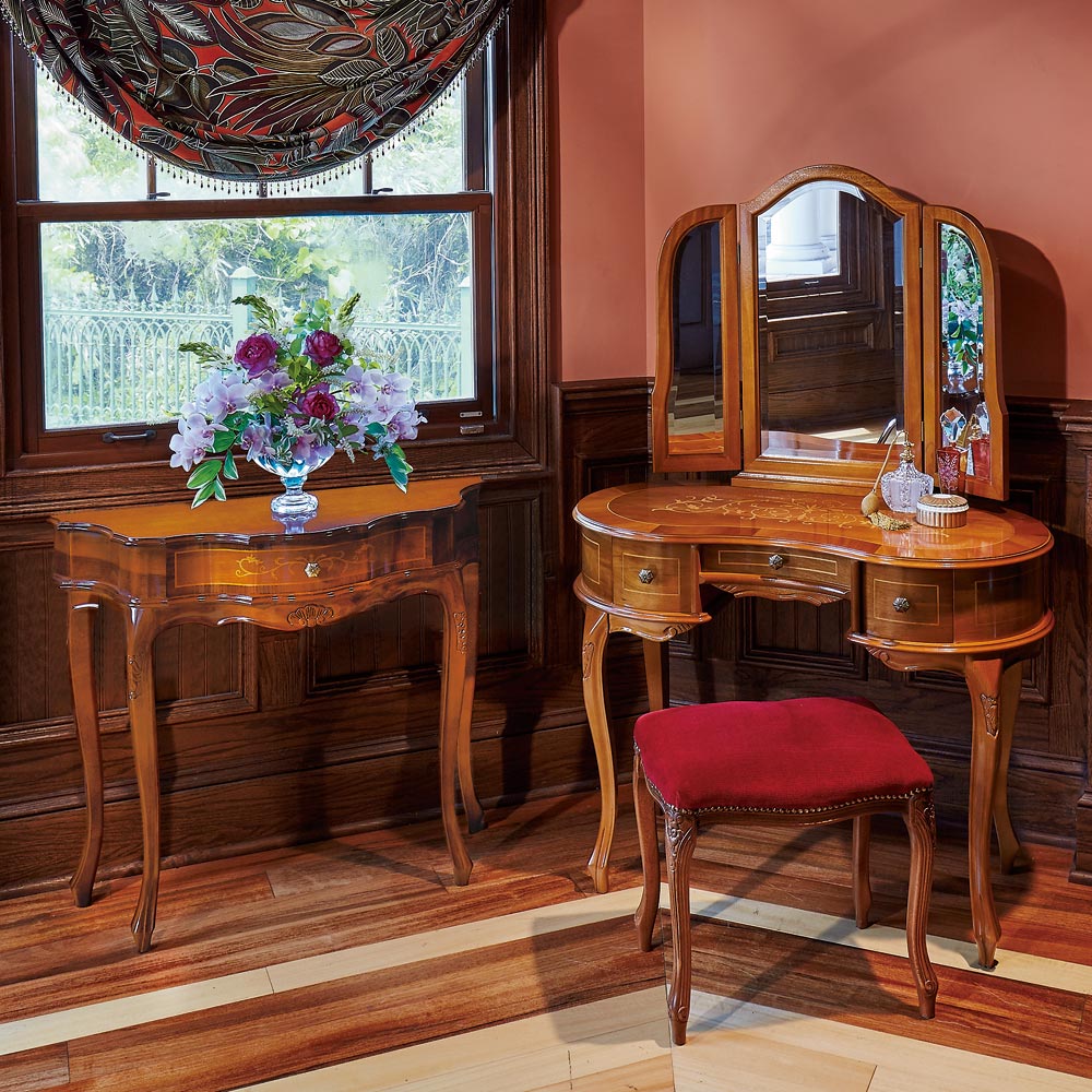 ヨーロッパの職人が現代に受け継いでいる精緻な技と美の結晶の象嵌細工を前面に施した格調高いコンソールテーブル。職人の技とイタリアの様式美。象がんとは、異なる素材を組み合わせて花柄などの紋様を表現する伝統技法。職人たちが現代に受け継いできた精緻な技と美をご堪能ください。クラシック家具の流麗なフォルムが外国のような格調高い雰囲気を醸します。シリーズの家具とインテリアコーディネートしたりエントランスに花台として置けば華やかな玄関インテリアが完成します。〜アンティーク家具の特集はこちら〜アンティーク家具の世界