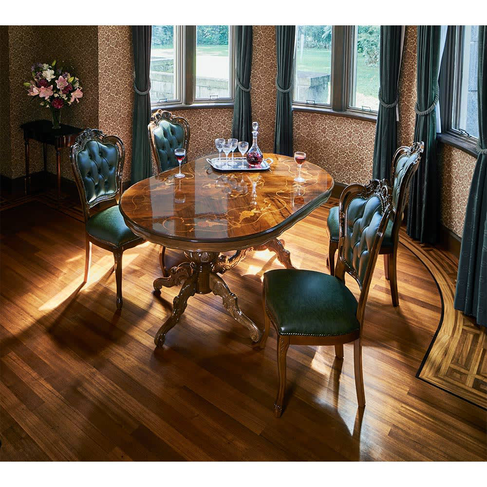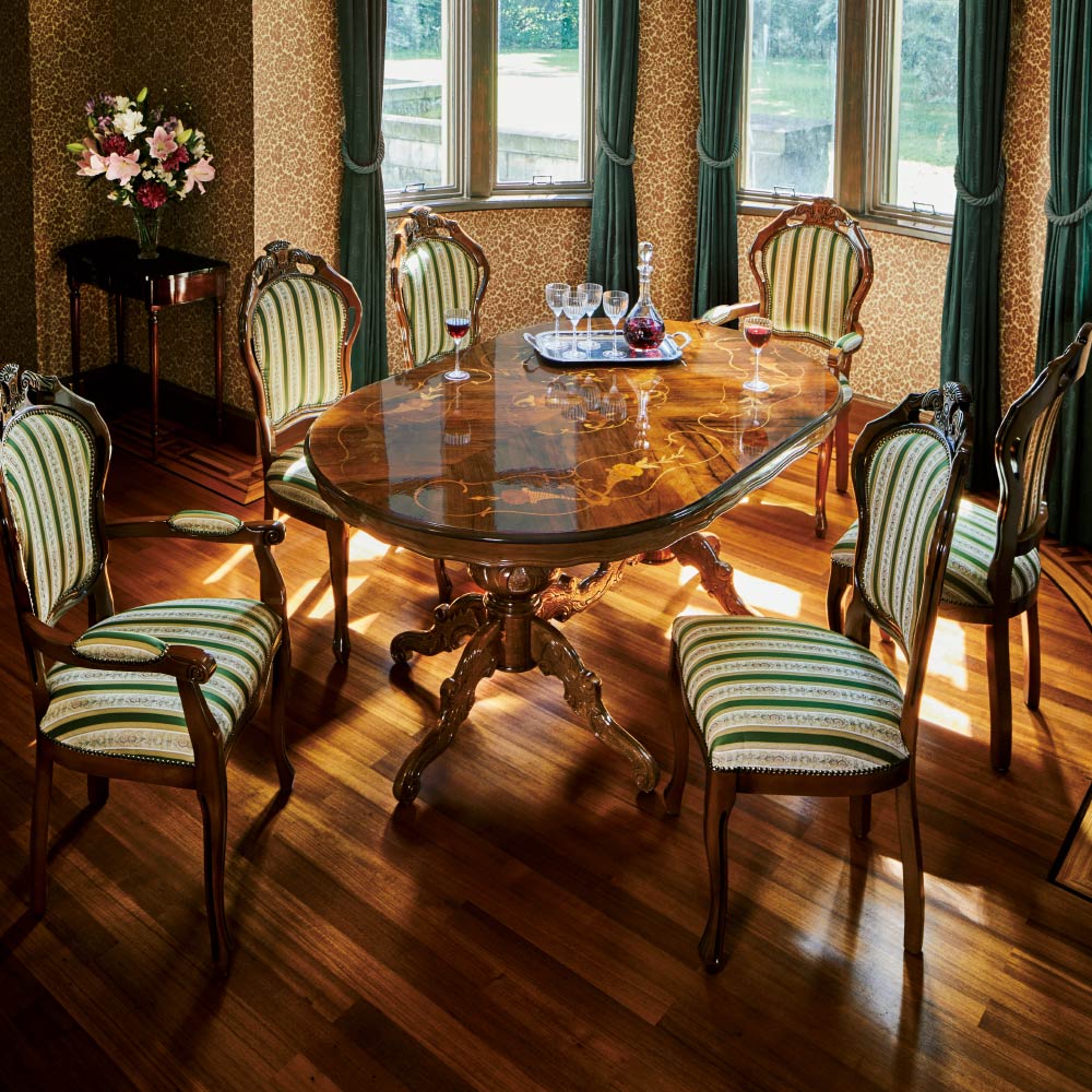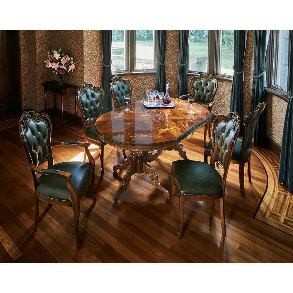 ヨーロッパの職人が現代に受け継ぐ精緻な技と美の結晶である、象がん細工を施したイタリア製ダイニングテーブルです。人気の猫脚デザインなどクラシック家具ならではの流麗なフォルムが、華やかで高級感のあるインテリアを演出します。イタリア現地職人による伝統の技が息づく、イタリアの様式美◆イタリアの家具メーカーで長年修行を積んだ熟練の職人たちが昔ながらの技法を駆使し、丹精込めて仕上げたダイニングテーブルです。◆細やかな模様をひとつひとつ切り出したところへ色合いの違う木材をはめ込んで磨きをかけています。◆テーブル全体に象がん細工を施した贅沢で風格漂うヨーロピアンデザイン。◆飴色に輝くブラウン塗装仕上げは使いこむ程に味わいが出て、長年に渡ってお楽しみいただけます。◆クラシカルなデザイン性と機能性を融合させた、人気のクラシック家具です。◆映画に出てくるようなデザインのイタリア製センターテーブルが、お部屋のコーディネートを優雅に演出します。◆流れるような優美なフォルムの脚部デザインは、重厚でしっかりと安定感があります。◆オーバル形の曲線が美しい幅172.5cmの大型テーブルは、家族やお客様が集まって座りやすい形状です。ヨーロッパの職人たちが現代に受け継いできた象がん細工◆象がんとは、異なる素材を組み合わせて花柄などの紋様を表現する伝統技法。◆使用される素材も天然木を使用するため、1点1点職人が素材と対話し、その味わいを最大限に引き出せる風合いに仕上げております。◆手作業で仕上げているため、板にあらわれる象がん模様は、カタログや写真と色や柄の色味や風合いが多少異なる場合がございます。◆家具1点1点に込められた、あたたかみのある表情をお楽しみください。◆美しく精緻な模様が天板全体にはめ込まれているのでダイニングが華やかな雰囲気に。◆イタリアならではの光沢塗装仕上げは、さらに象がんの美しさを際立たせます。◆脚部にも手作業で彫られた、美しい装飾が施されています。商品担当者からのメッセージ古くから腕利き職人が集まる地域で作られたイタリアン家具はディノスの人気商品です。ヨーロッパ家具やアンティーク家具とのコーディネートで、海外インテリアのようなおしゃれで素敵なお部屋の雰囲気に。届いたその日からご使用いただける完成品なのも魅力のひとつです。ディノスが自信を持ってお勧めするクラシック家具・輸入インテリアをお楽しみください。〜アンティーク家具の特集はこちら〜アンティーク家具の世界