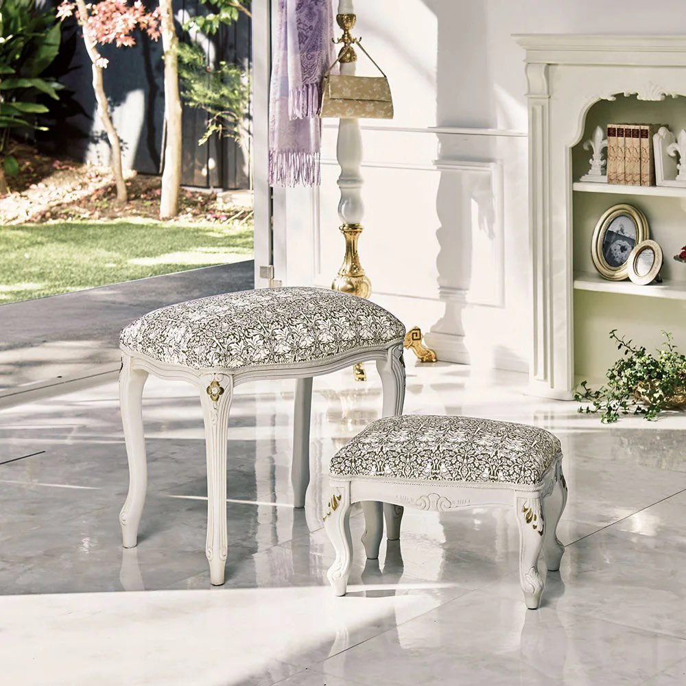 Fabric by ベスト・オブ・モリスの人気ファブリック「ブラザーラビット」を使用した、クラシックなスツール。置くだけで洗練されたヨーロピアン空間が完成します。〜ウィリアム・モリスの美意識とイタリアン家具の様式美をひとつに〜◆伝統的なイタリアンデザインのスツールに、モダンデザインの父と呼ばれるモリスのファブリックを使用しました。◆「ブラザーラビット」はウィリアム・モリスが子どもたちに読み聞かせたおとぎ話に出てくるうさぎをモチーフにした人気柄。◆フレームはイタリア製。古い歴史と伝統を受け継ぐイタリア家具職人の技術力を活かして、丁寧に造られています。◆優雅なデザインと存在感で、ヨーロッパのクラシックホテルのようなお部屋を演出します。〜ディテールにもこだわった上質な家具が、日々の暮らしを豊かに彩ります〜◆ビーチ天然木を贅沢に使用し、光沢のあるアンティーク風塗装で仕上げました。◆優美なフォルムの猫脚デザインを採用。細部にも美しい細工を施しました。◆座り心地にも配慮し、座面内部にはコイルスプリングを内蔵しています。◆おとぎ話のモチーフをモノトーンの濃淡で描くことで、大人っぽい印象に仕上げました。〜ちょっとしたスペースが、置くだけでエレガントな欧風空間に〜◆玄関やリビング、寝室などに置くだけで、優雅なスペースを演出できます。◆眺めているだけでも癒される美しさで、お部屋のアクセントとしても最適です。◆コンパクトで軽量なので、楽に移動ができ、予備のチェアやオットマンとして、バッグや衣類の一時置きにと、多彩にお使いいただけます。届いてすぐに使える完成品。職人が1点1点、丹精込めて作り上げています。組み立て不要の完成品でお届けしますので、組み立てが苦手な方もすぐにお使いいただけます。〜同じシリーズのフットスツール、両肘スツールもご用意しました〜◆同じファブリックを使用したフットスツール、両肘スツールもご用意しました。◆シリーズで揃えれば、優雅なサロンのような空間をコーディネートできます。【ウィリアム・モリスのテキスタイルデザイン】150年の年月を経て愛され続ける、モリスのテキスタイルデザイン「家の中に、役に立たないもの、美しいと思えないものを置いてはならない」という言葉を残しているウィリアム・モリスは、絵画や彫刻など、美術館で鑑賞する装飾芸術品のことを「大芸術」、日常の暮らしや身のまわりの物を美しく彩る芸術品のことを、親しみを込めて「小芸術(レッサー・アーツ)」と呼びました。モリスが生涯をかけて取り組んだのはまさにこの「小芸術」。人生の細部に宿り楽しみや幸福感を大切にするための芸術です。62年の生涯で10人分の仕事をしたと言われるほど、精力的に仕事に励んだモリス。デザインの表現の追求のために、刺しゅうや染色、織物の技術も必ず自身で研究した、職人気質の人でした。William Morris(1834〜1896年)19世紀後半、装飾デザインの分野で活躍した英国の芸術家。傑出したインテリアデザイナーであると同時に、画家、詩人、グラフィックデザイナー、出版人、社会主義活動家と多彩な顔を持ち、それぞれの分野で目覚ましい業績を残した。アーツ&クラフツ運動に影響を与え、近代デザインの父とも呼ばれる。