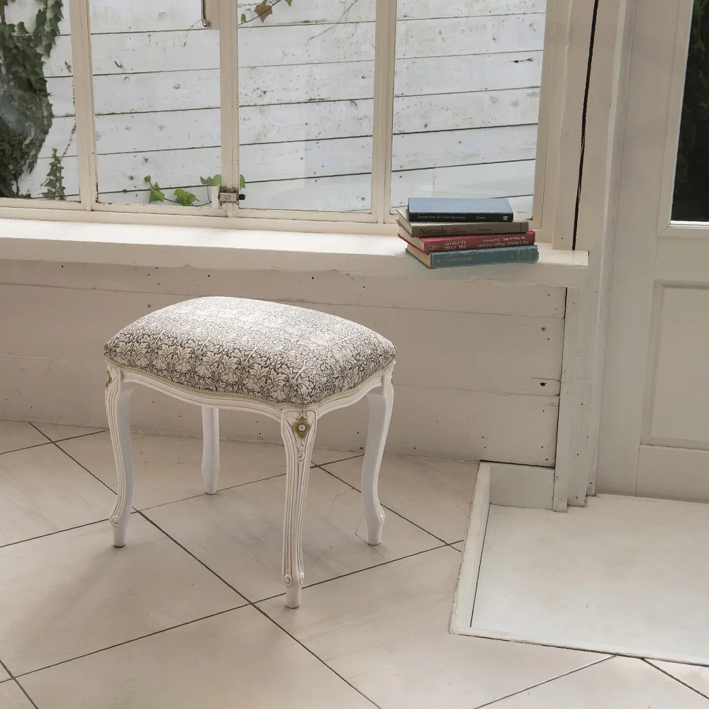 イタリアンデザインのクラシックなスツールに、Fabric by ベスト・オブ・モリスの人気ファブリック「ブラザーラビット柄」を使用しました。1点1点職人の手作業によって大切につくられています。