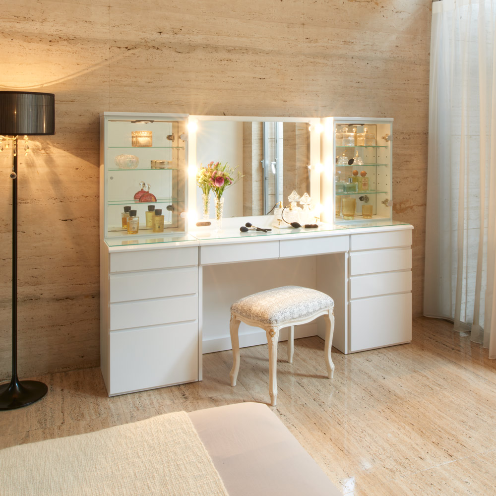 コーディネート例 おしゃれなドレッサーに合わせれば、優雅なメイクアップルームが完成します。 ※写真は別売りの「LEDライト付きドレッサーシリーズ」にベストオブモリスのスツールを使用しています。