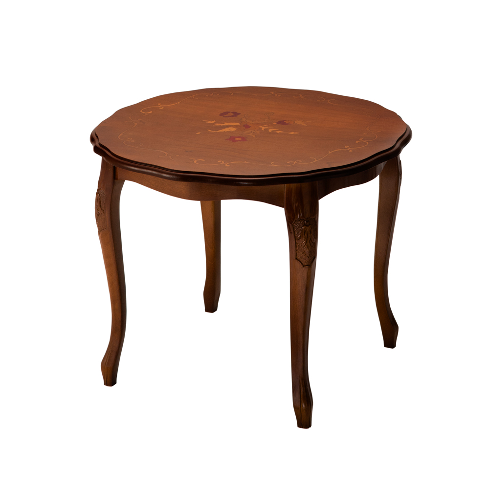 ヨーロッパの職人が現代に受け継いでいる、精緻な技と美の結晶の象がん細工を施した、格調高いリビング丸テーブル。ティーテーブルやサイドテーブルとして活躍するほどよいサイズで、流麗なフォルムが海外のような高級感あるインテリアを演出します。イタリア現地職人による伝統の技が息づく、イタリアの様式美◆イタリアの家具メーカーで長年修行を積んだ熟練の職人たちが昔ながらの技法を駆使し、丹精込めて仕上げたリビング丸テーブルです。◆テーブル全体に象がん細工を施した贅沢で風格漂うヨーロピアンデザイン。◆細やかな模様をひとつひとつ切り出したところへ色合いの違う木材をはめ込んで磨きをかけています。◆飴色に輝くブラウン塗装仕上げは使いこむ程に味わいが出て、長年に渡ってお楽しみいただけます。◆クラシカルなデザイン性と機能性を融合させた、人気のクラシック家具です。◆映画のインテリアに出てくるようなデザインの、人気のイタリア製テーブルが、お部屋のコーディネートを優雅に演出します。◆流れるような優美なフォルムの脚部デザインは、重厚でしっかりと安定感があります。◆ティーテーブルやサイドテーブルとして活躍するほどよいサイズで、家族やお客さまと和やかにすごすテーブルとしても最適です。ヨーロッパの職人たちが現代に受け継いできた象がん細工◆象がんとは、異なる素材を組み合わせて花柄などの紋様を表現する伝統技法。◆使用される素材も天然木を使用するため、1点1点職人が素材と対話し、その味わいを最大限に引き出せる風合いに仕上げております。◆手作業で仕上げているため、板にあらわれる象がん模様は、カタログや写真と色や柄の色味や風合いが多少異なる場合がございます。◆家具1点1点に込められた、あたたかみのある表情をお楽しみください。◆美しく精緻な模様が天板全体にはめ込まれているのでリビングが華やかな雰囲気に。◆イタリアならではの光沢塗装仕上げは、さらに象がんの美しさを際立たせます。◆脚部にも手作業で彫られた、美しい装飾が施されています。商品担当者からのメッセージ古くから腕利き職人が集まる地域で作られたイタリアン家具はディノスの人気商品です。ヨーロッパ家具やアンティーク家具とのコーディネートで、海外インテリアのようなおしゃれで素敵なお部屋の雰囲気に。届いたその日からご使用いただける完成品なのも魅力のひとつです。ディノスが自信を持ってお勧めするクラシック家具・輸入インテリアをお楽しみください。〜アンティーク家具の特集はこちら〜アンティーク家具の世界