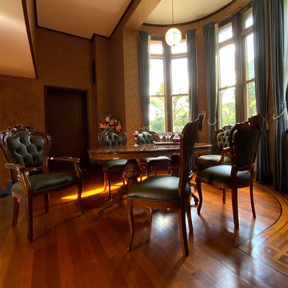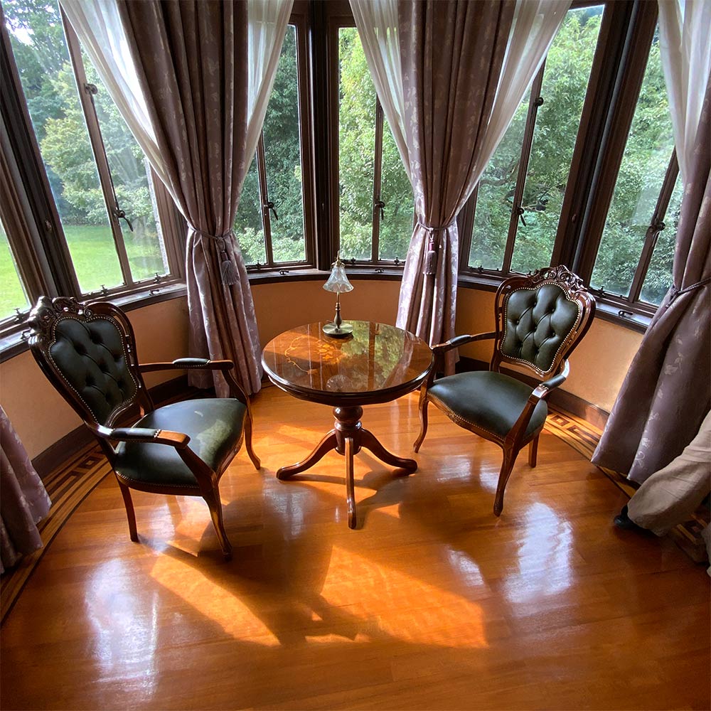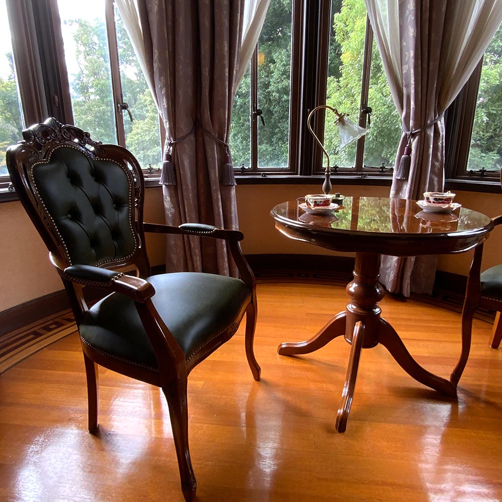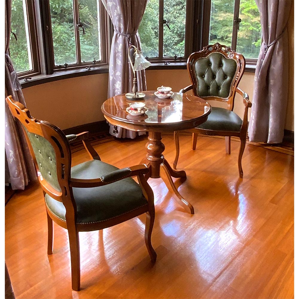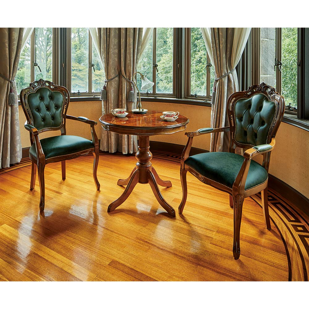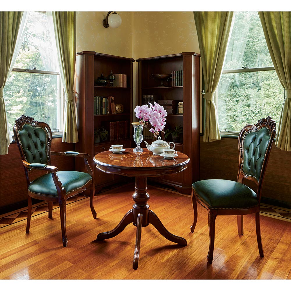 コーディネート例 優雅なティータイムを楽しむスペースにも。 ※お届けは革張りダイニング肘付きチェアです。写真は別売りの丸テーブルとの組合せです。