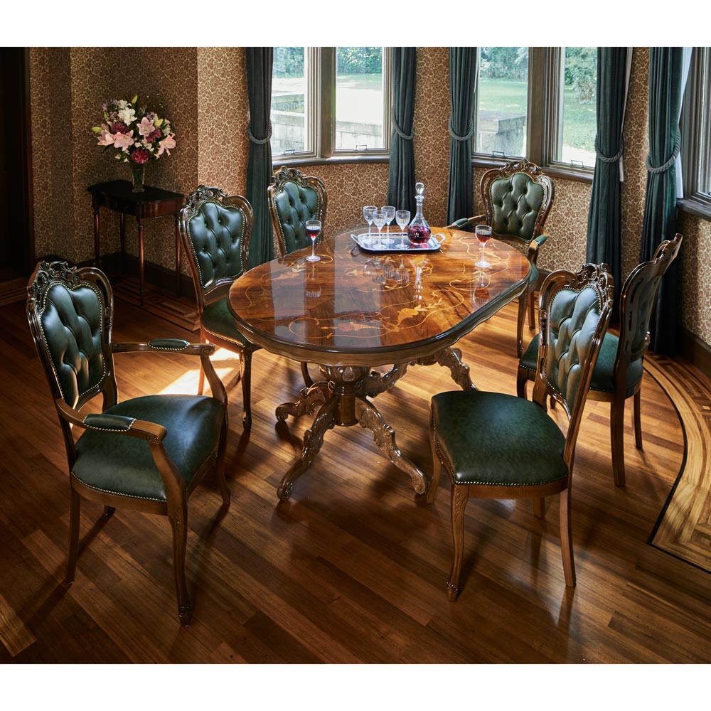 イタリアより輸入した牛革張りの格調高いアームチェア。座り心地にも配慮し、椅子内部にはコイルスプリングを内蔵しているので、本格派を求める方におすすめです。クラシック家具の流麗なフォルムが、海外のような高級感あるインテリアを演出します。イタリアより輸入した上質なイタリアンクラシック家具をご自宅に。上質で洗練された外国のようなクラシックインテリアが、届いたその日に実現しますイタリア現地職人による伝統の技が息づく、イタリアの様式美◆イタリアの家具メーカーで長年修行を積んだ熟練の職人たちが昔ながらの技法を駆使し、丹精込めて仕上げました。高貴なダイニングルームをあなたに。◆座り心地にも配慮しチェア座面内部にはコイルスプリングを内蔵しています。ウレタンのみのチェアと異なり、へたり感が少なくしっかりと弾力のある座り心地を実現します。◆前方脚部2本は優美で流れるようなフォルムの猫脚形状。贅沢で風格漂うヨーロピアンデザインです。◆脚部・フレーム部は飴色に輝くブラウン塗装仕上げ。使いこむ程に味わいが出て、長年に渡ってお楽しみいただけます。◆映画のインテリアに出てくるような人気のチェアはお部屋のコーディネートを優雅に演出します。◆ダイニングチェアとしてのみでなく、玄関や書斎、ベッドルームやクローゼット用のパーソナルチェアとしてもおすすめです。イタリア製の上質な牛革を使用し、細部までこだわりの意匠を施しました◆深い色味の上質な牛革を使用し、飾りボタンで留めた高級感のあるデザインです。◆肘掛けにも革張りを施し、ゆったりとした座り心地を実現しました。◆随所に施された美しい彫刻やブロンズ仕上げの鋲使いが、さらに高級感を増しています。◆チェアの座面・背もたれに牛革を使用。全方向から見ても美しい仕上がりです。商品担当者からのメッセージ古くから腕利き職人が集まる地域で作られたイタリアン家具はディノスの人気商品です。ヨーロッパ家具やアンティーク家具とのコーディネートで、海外インテリアのようなおしゃれで素敵なお部屋の雰囲気に。届いたその日からご使用いただける完成品なのも魅力のひとつです。ディノスが自信を持ってお勧めするクラシック家具・輸入インテリアをお楽しみください。〜アンティーク家具の特集はこちら〜アンティーク家具の世界