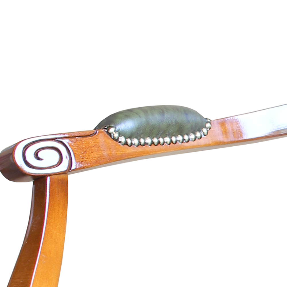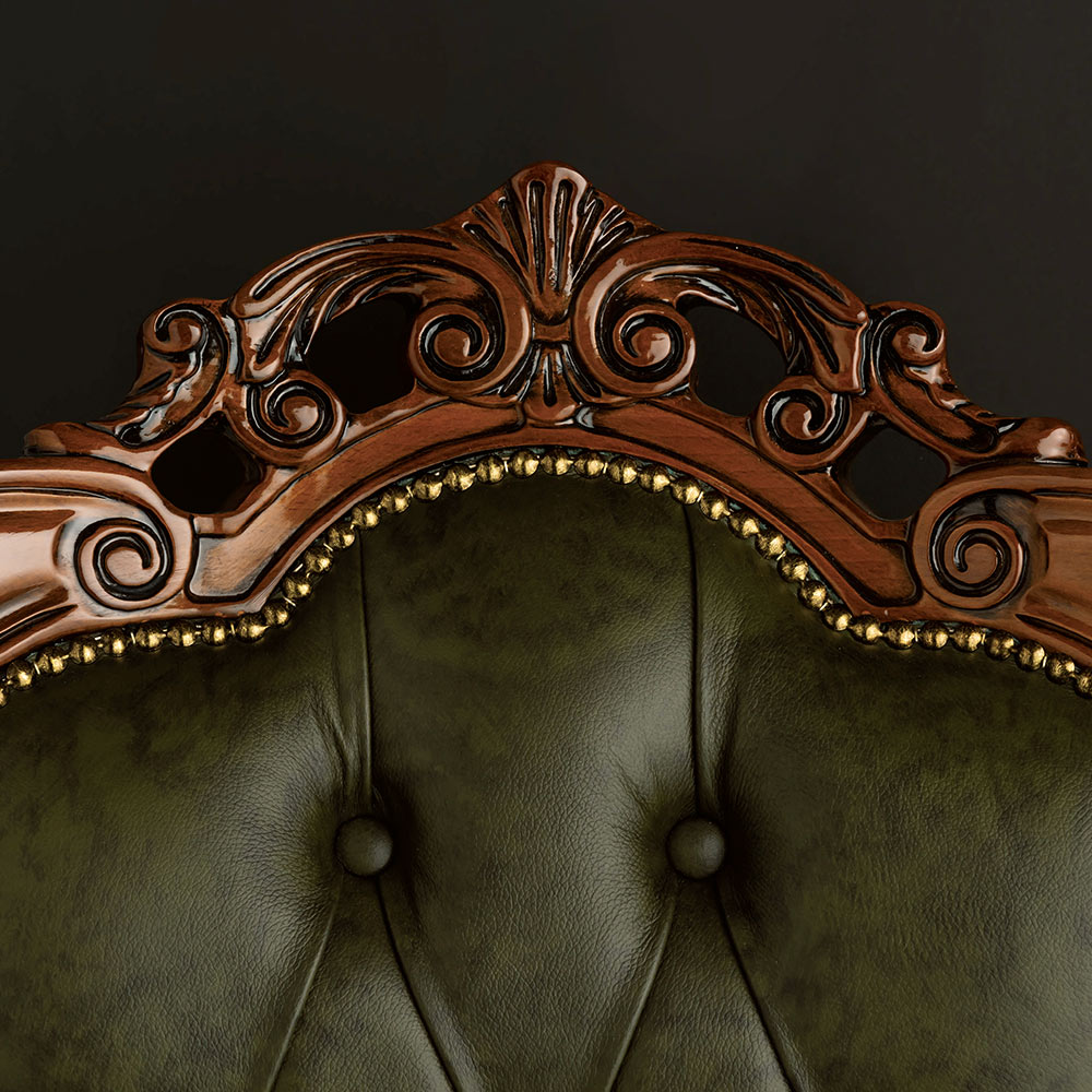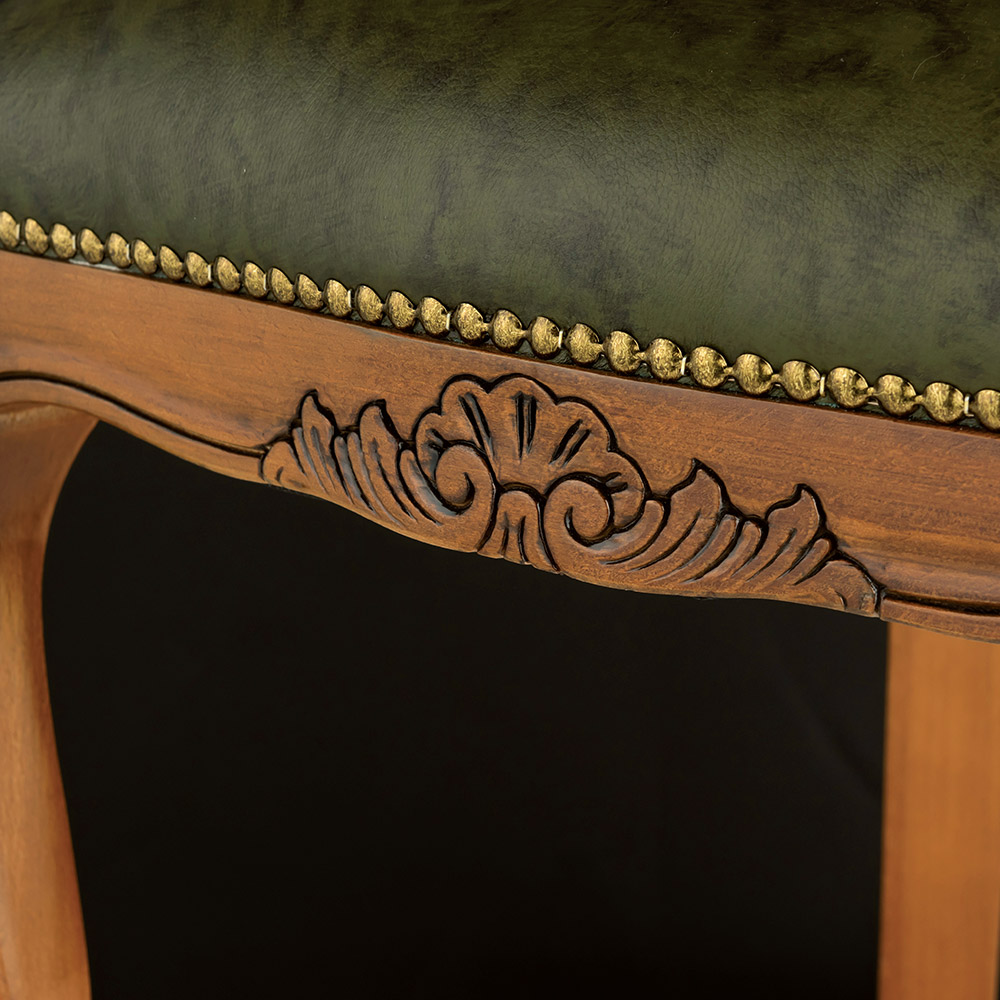 座面の下部に施された美しい彫刻が、さらに高級感を増しています。牛革を留めているブロンズ仕上げの鋲もアクセントに。