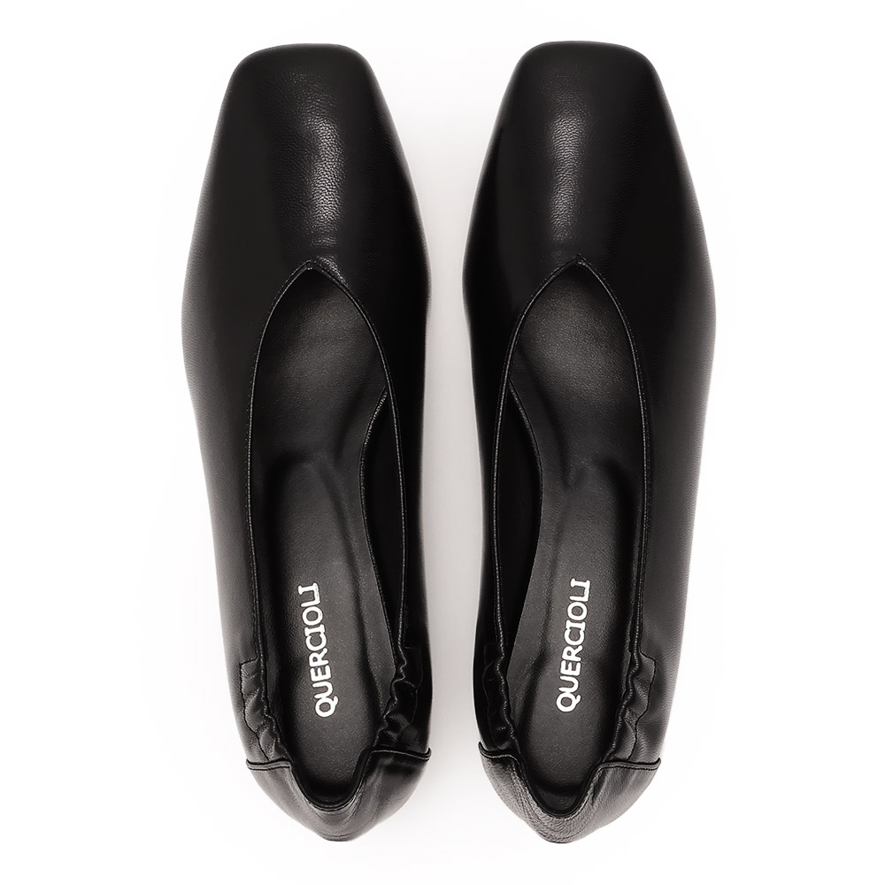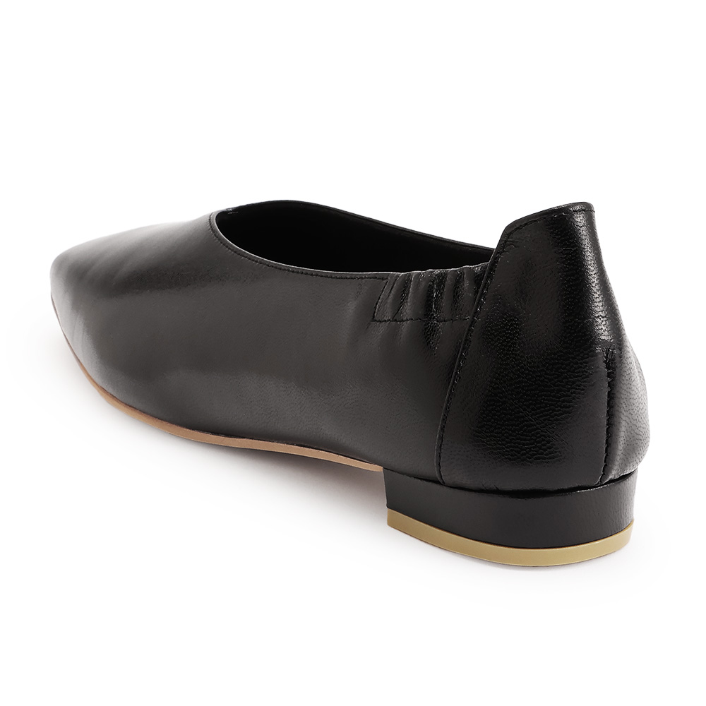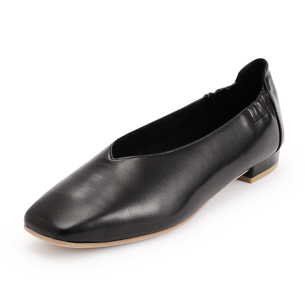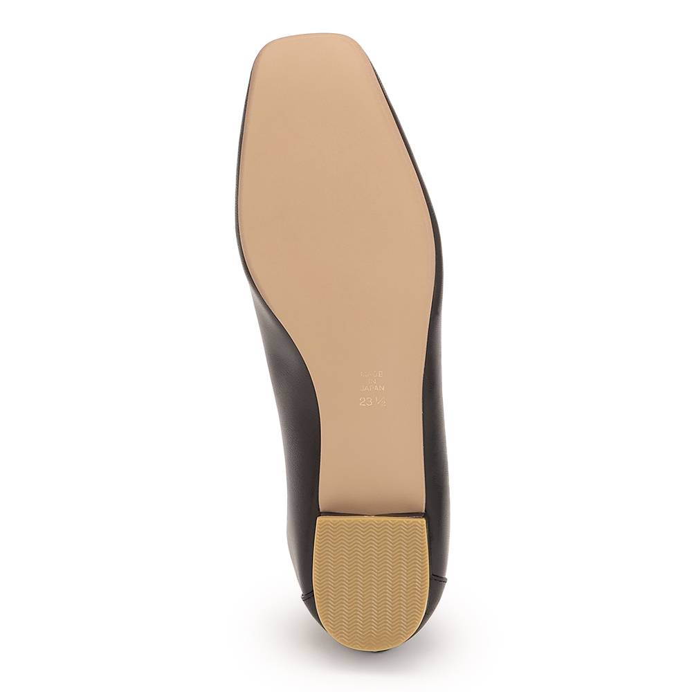 足への優しさを秘めた、精巧なジャパンメイドソフトなやぎ革が足を包み込む一足は、芯材を省いた優しい着用感が魅力。踵部分のゴム、屈曲性のある中底が吸いつくような履き心地を生みます。ゆるやかなVカットの履き口やスクエアトゥがレディーの気品を描出。