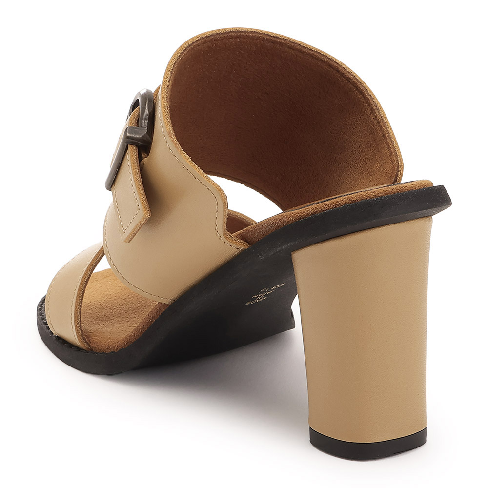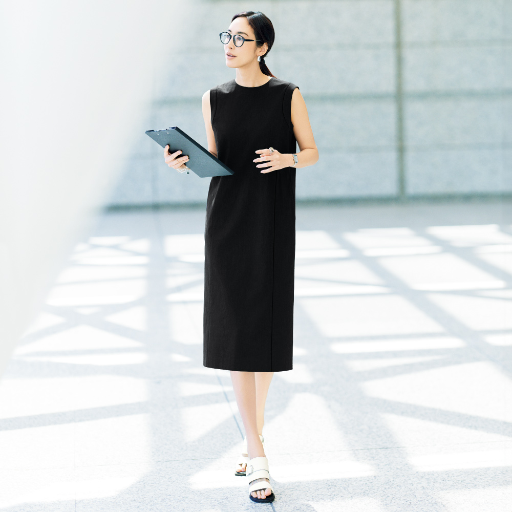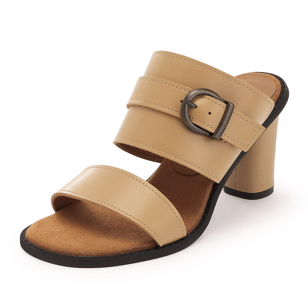 ジャストなシルエットを創る今どきのクチュール足元には白いサンダルを合わせて、クリーンな抜けを創出。幅広のツーバンドが甲をしっかりホールドし、スエード調のインナーが滑りにくさを追加。バックル付きベルト、筒形ヒールなど秀麗な佇まいに。