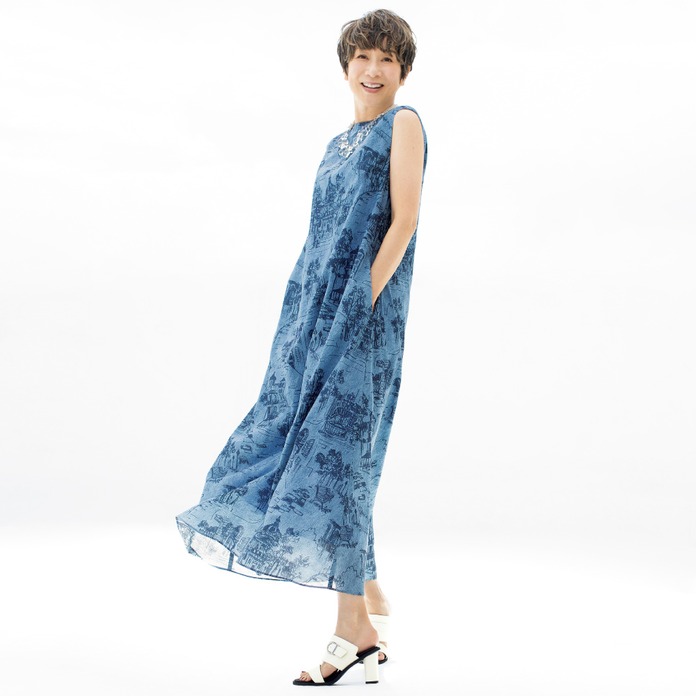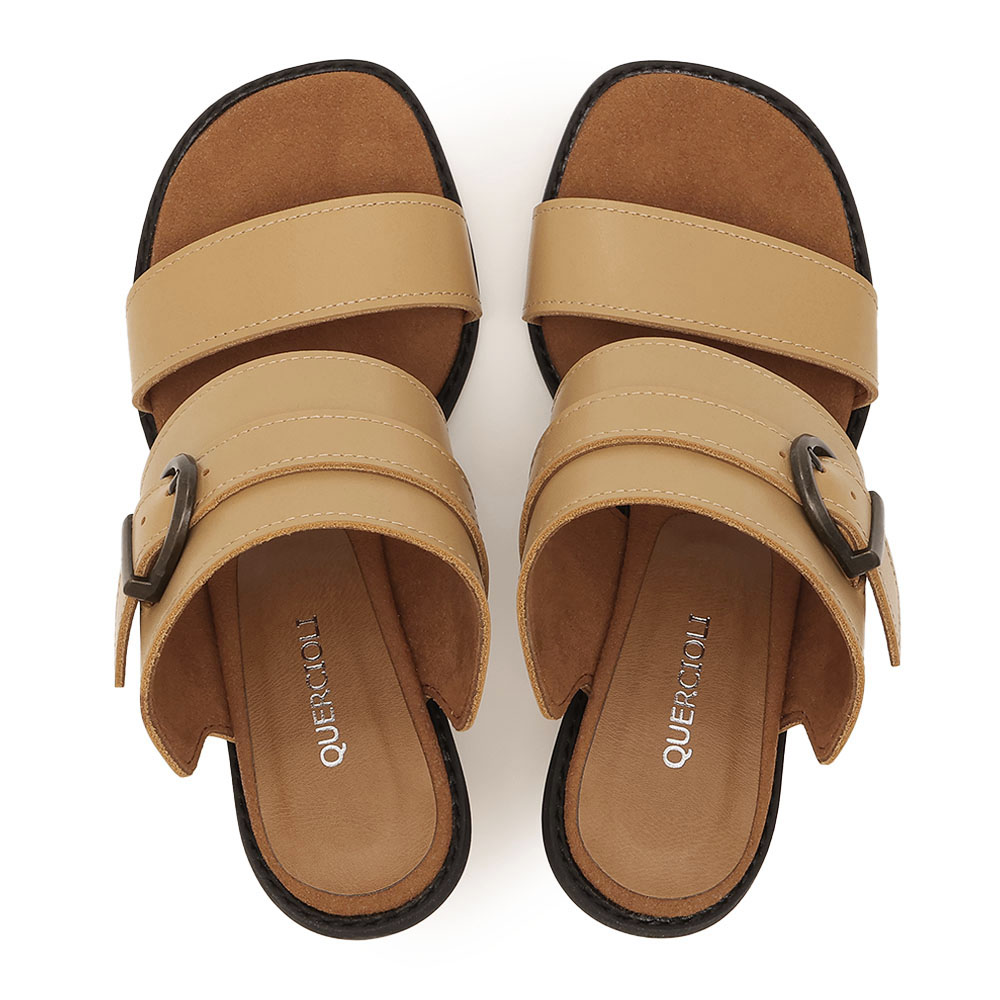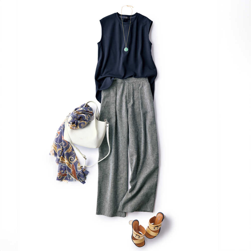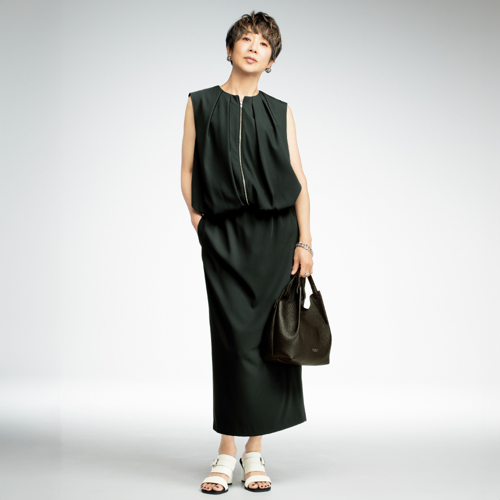 ジャストなシルエットを創る今どきのクチュール足元には白いサンダルを合わせて、クリーンな抜けを創出。幅広のツーバンドが甲をしっかりホールドし、スエード調のインナーが滑りにくさを追加。バックル付きベルト、筒形ヒールなど秀麗な佇まいに。