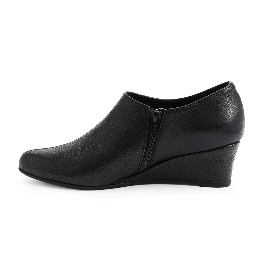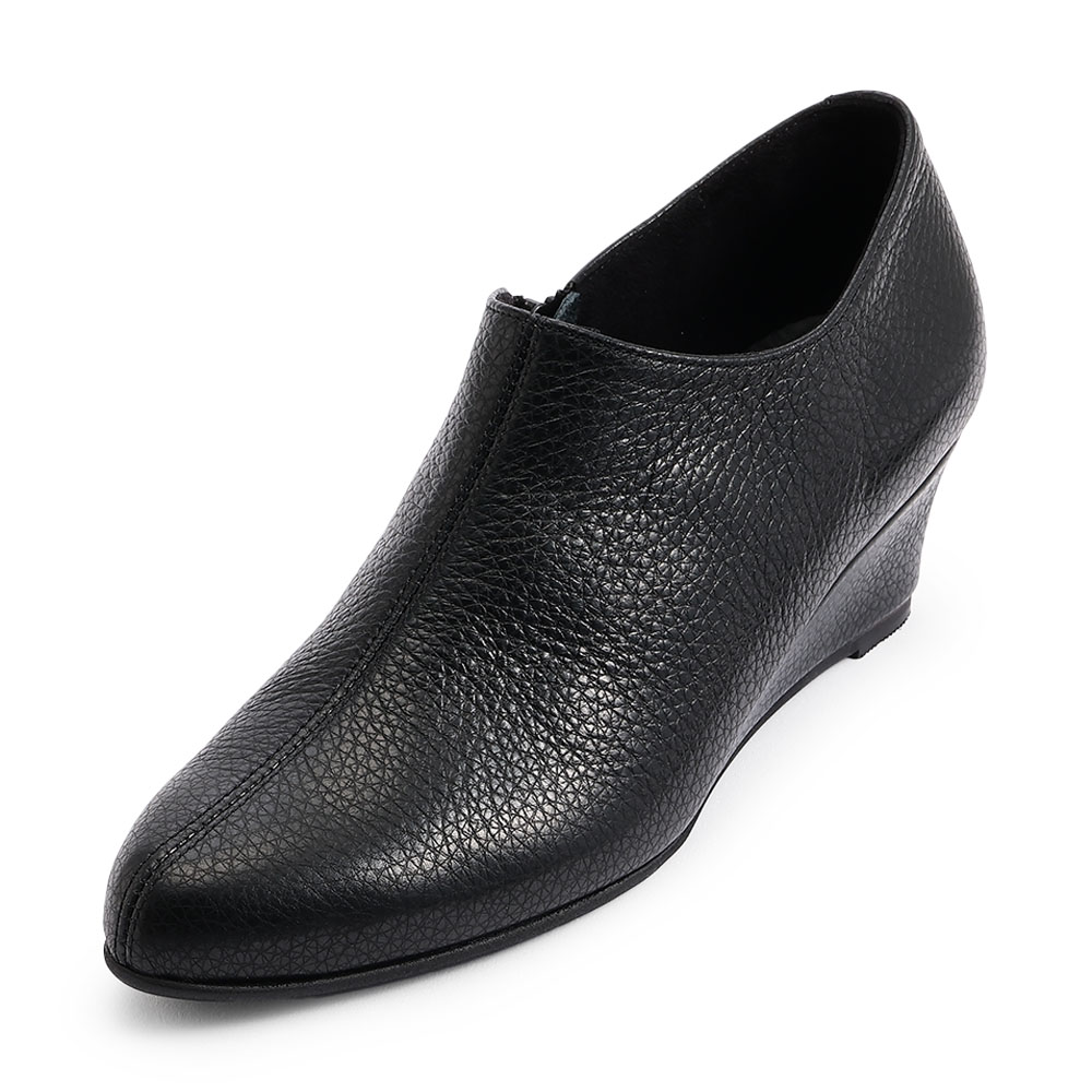 日本の知恵が、歩みに寄り添う美しさと心地よさを両立させた、日本発の一足切り込み加工を施した「中底」装飾を削ぎ落し、美しいシルエットを追求したソフトなイタリアンレザーのブーティ。中底に切り込みを入れて屈曲性を高め、歩行時の足と靴のなじみを向上。歩くほどの心地よさと疲労感の違いを実感できます。≫ POINTリッチ感のある革巻きのウェッジヒールを採用することにより美脚見えと快適さを兼備。