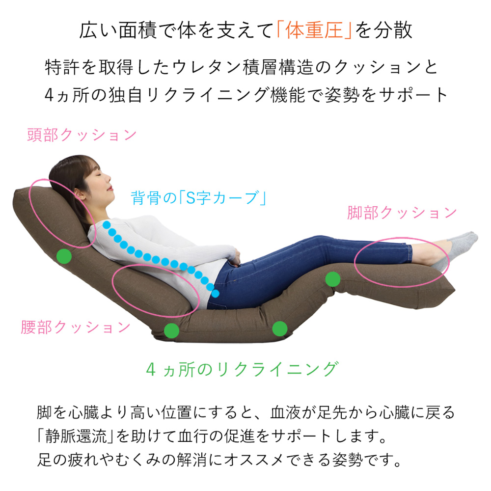 4ヵ所のリクライニングと独自のクッション構造。ラクな姿勢をサポートする日本製の高機能チェア。身体の負担が少ない「中立姿勢」でソファのようにリラックスできます。ワイドタイプはdinosだけ。テレワークや在宅勤務のリフレッシュアイテムとしてオススメです。芝浦工業大学と産学共同研究で誕生〜ラクな姿勢をサポートする日本製の高機能座椅子一日の疲れを癒やしてくれる、そんな座り心地のチェアです〜頭部・背部・脚部・膝下4カ所のリクライニング機能がお好みの姿勢をサポート。身体の負担が少ない、脚を上げ宙に浮かんでいるような「中立姿勢」はほんとうにリラックスできます。ソファのようなこだわりの仕様で、独自のウレタン構造により頭から脚までいたわるように支え、一日の疲れを癒やしてくれます。ご自宅でのテレワークや在宅勤務で仕事中のリフレッシュアイテムとしてオススメです。国内工場にて生産している、こだわりぬいた日本製の高品質をお楽しみください。【POINT1】 好みのポジションでくつろげるリクライニング機能 ◎頭部・背部・脚部・膝下の4カ所にリクライニング機能付き。◎頭部は0〜41度の間で無段階・背もたれと脚部は17段階・膝下は無段階にリクライニング。◎角度を組み合わせて、お好みのリラックス姿勢でくつろげます。◎身体の負担が少ない、脚を上げ宙に浮かんでいるような「中立姿勢」はほんとうにリラックスできます。◎おうち時間におすすめくつろぎ座椅子。映画鑑賞、読書、スマートフォン・タブレットを使ったモバイルワーク、テレワークも快適にできます。【POINT2】 全身をいたわる工夫が凝縮された素材と構造 ◎適材適所の素材を使用しました。部位ごとに硬さの違うウレタンフォームで身体にやさしい座り心地です。◎座椅子本来の目的である身体の負担を軽減するための中心素材であるウレタンフォームは、ウレタン製造の各メーカーが持つ、それぞれに得意な材料を商品コンセプトにあわせて使い分けています。【POINT3】 面倒な組み立てのない完成商品 ◎面倒な組み立てのない完成品なので、お届け後すぐにお使い頂けます!〜座椅子のマエストロが作る安心の「国産・日本製」〜日本人のくつろぎとリラックスを追及し続けてきた、座椅子業界のパイオニア“ヤマザキ”「座った時の腰への負担を軽減する」という、座椅子本来の機能を重視した商品作りをコンセプトに、人間工学的な見地からの設計を行っています。日本だから出来る品質管理の下で生産された精密な部品や材料を、国内工場にて独自の工程で生産している「ジャパンメイド」。そのこだわりゆえに“職人”とも称される国産座椅子メーカーです。基盤のスチールパイプは安心こだわりの構造!!◎中身に使用しているスチールパイプは厚さ(肉厚)についての基準を設け、日本国内で造管されたものを使用。◎スチールパイプを主材料とした構造部材については、強度試験、破壊試験を行い、JIS規格に合格したものだけを商品化しています。