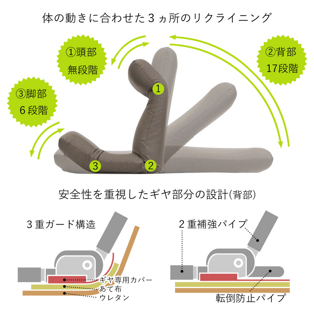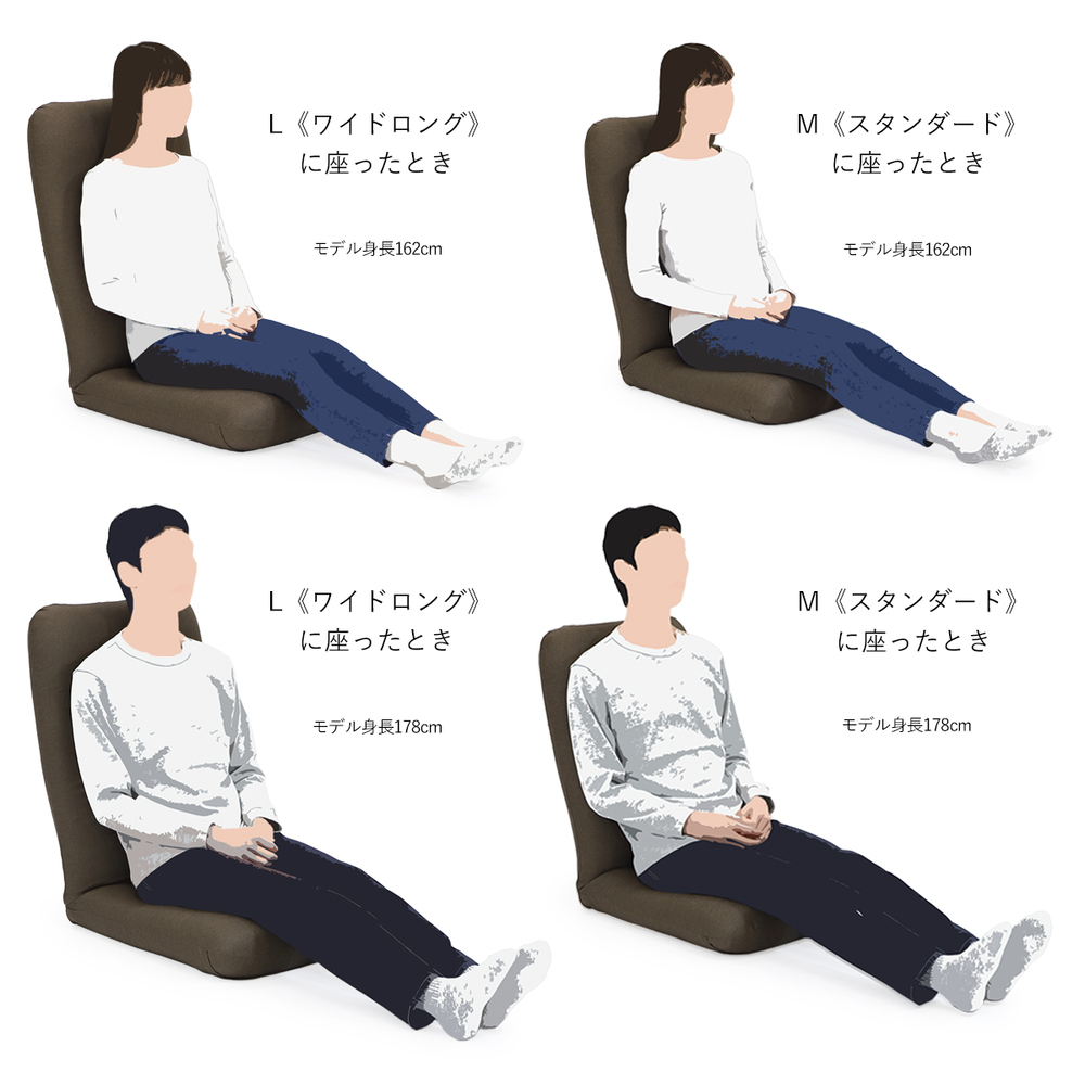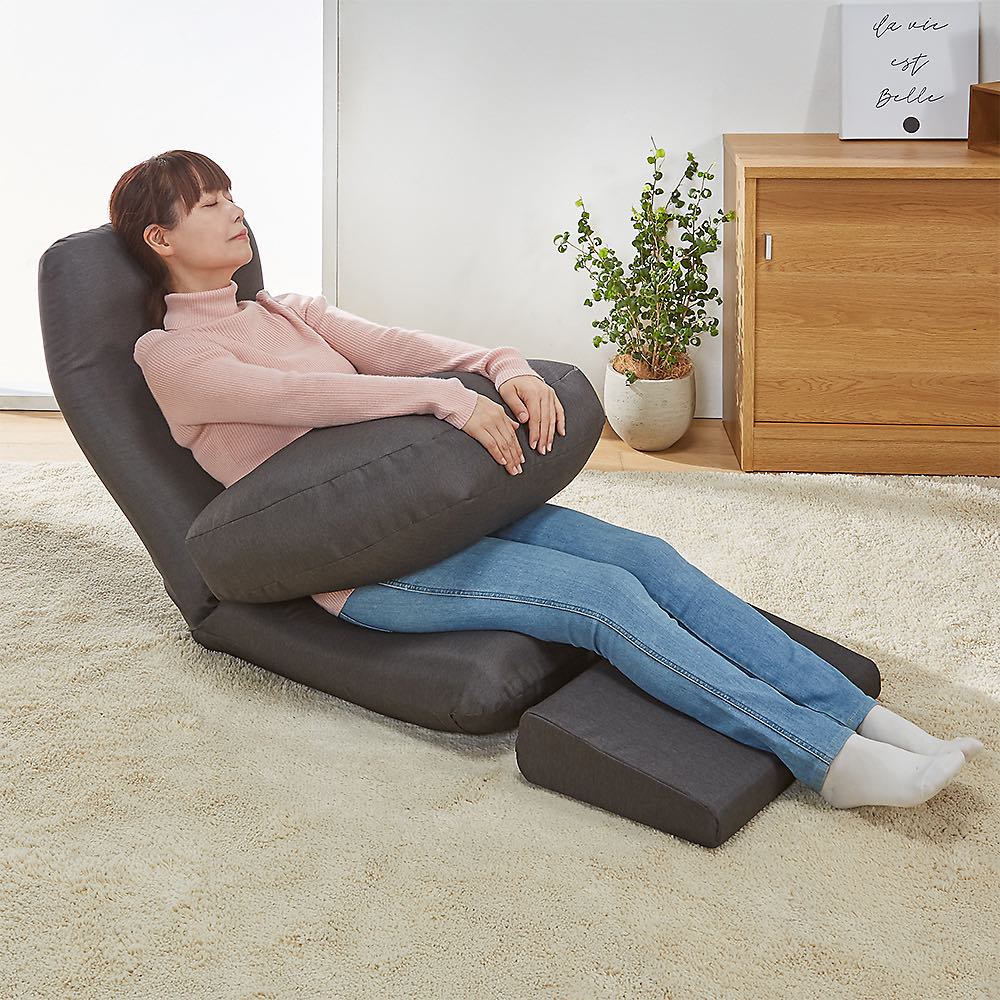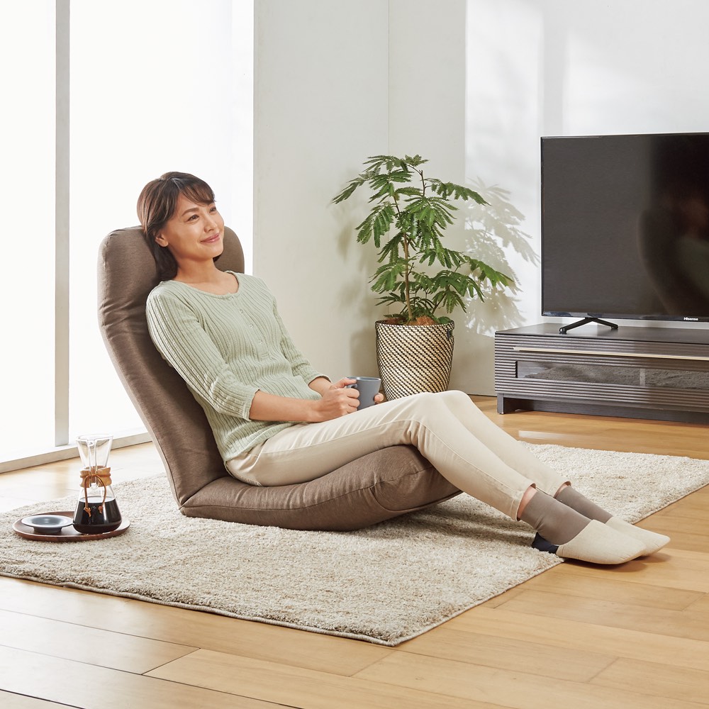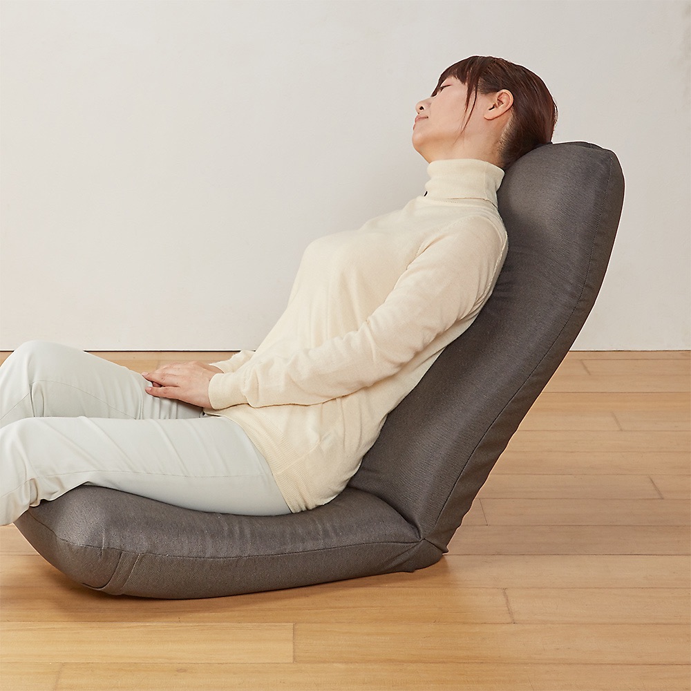 テレワークやリモートワークに大好評!これが座椅子!?と驚いてしまうほどくつろげるので、ソファが置けないお家やリビングにちょい置きにもおすすめ。細やかなリクライニングで身体に心地よくフィット。独自の内部構造により「人の手で優しく支えられる」感覚の座り心地。芝浦工大と国内の座椅子メーカーが共同研究した『腰に優しく疲れにくい』座椅子です。同色の専用替えカバー付きです。かぶせやすい同素材の専用カバー付き。引っかきに強い素材で、丸洗いも可能です。〜腰に優しい「人の手で優しく支えられる」感覚のすわり心地〜芝浦工大と国内の座椅子メーカーが共同研究した、『腰に優しく疲れにくい』ラクラク座椅子。独自の内部構造により手で押されているかのように心地よく背筋が伸びます。また、3ヵ所のリクライニング機能&体格に合わせてサイズを選べるので、より体にフィット!!国内工場にて生産している、こだわりぬいた日本製の高品質をお楽しみください。【POINT1】 腰に優しい曲面形状のクッション構造◎曲面形状の背もたれが背筋のS字曲線を保ち、「体重圧」を分散します。◎お尻のラインに合わせ広い面積で支える曲面形状の座面が「体重圧」を分散します。【POINT2】 体に合わせて選べるサイズ!!◎体格に合わせてサイズが選べるので、より自分の体にフィットします。Mサイズ…身長170cmまでの方向き。標準的で使いやすいサイズ。Lサイズ…身長170cm以上の方向き。幅も高さも大き目サイズ。男性の方でもゆったりお使いいただけます。【POINT3】 リクライニング機能でリラックスポジションが思いのまま◎頭部、背もたれ、脚部の3ヶ所のリクライニングでゆったりと全身リラックスできます。◎頭部は無段階、背もたれは17段階でリクライニング調節が可能。頭部にフィットし、頭や首が疲れません。◎脚部は6段階でリクライニング調節が可能です。ひざ裏にフィットし、支えてサポートするので足元ラクラク。お尻の前すべりも防止できます。【POINT4】 面倒な組み立てのない完成商品◎完成品なのでお届け後、すぐにお使いいただけます!!生地感も上品、リビングにすっと馴染む大人カラーをご用意しました「機能が良くても、お洒落じゃなきゃリビングに置きたくない!」座椅子に多いそんなお悩みを解消すべく、落ち着いていお洒落な生地・色味にしました!肌触りはもちろん、ひっかきキズが付きにくいシャンブレー調のツイル生地を使用。担当者も愛用中!お子様からご年配の方までオススメしたい一品です「1LDKに住んでいるのですが、リビングが狭く、ソファを置くことは諦めていました。食後のちょっとした時間やテレビを見る時に、ふかふかのソファに座りたいと思うことが多々あったのですが、今はこの座椅子が全て解消してくれています!体にフィットして頭までしっかり支えられるので、何もしていないと思わず寝てしまうほど。テレワーク時も使っているので、一日のうちかなり長い時間お世話になっています。」