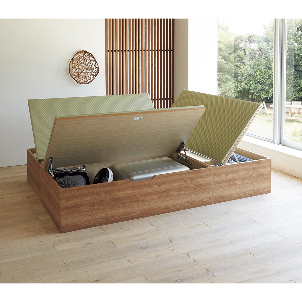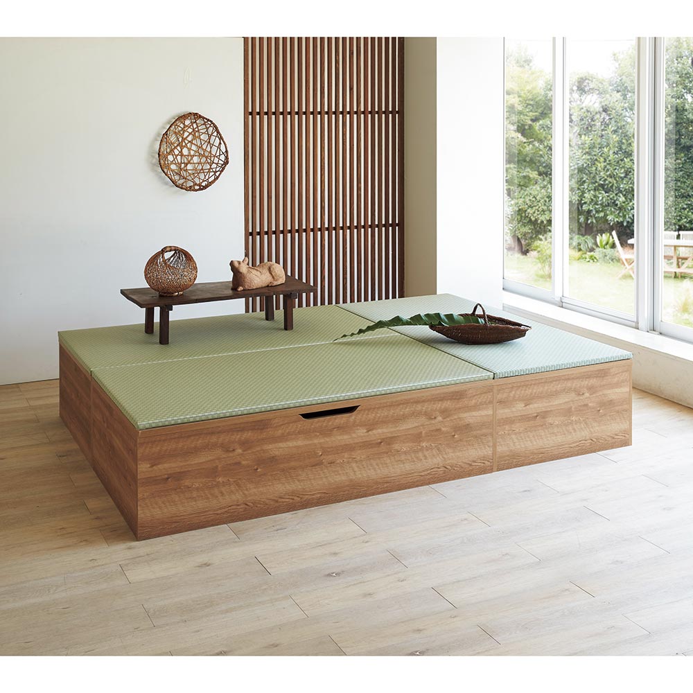 い草の質感が爽やかな和みの畳スペースに簡単リフォーム。清潔感が続くセキスイ畳「美草」を使用しました。お部屋のスペースに合わせてセレクト。心ゆくまで寛げる安らぎの和空間が手軽に叶います。畳スペースに簡単リフォーム和室はくつろぎスペースに、就寝空間にと多用途に役立つ伝統的な空間。フローリングスぺースに、並べるだけで和空間が完成します。モダンなインテリアにもマッチする、ヘリなしタイプの畳を採用。畳の下には大容量の収納空間が広がります。リフォームと収納空間づくりが同時に叶うユニット式収納畳です。お部屋にあわせて豊富なサイズから選べます。洗練されたモダン空間にゆったり和みスペースを演出。畳の下には大容量の収納空間畳面はダンパー構造で開閉をサポート。簡単に開け閉めできます。高さ45cmタイプはスーツケースや家電、収納ケースも収納可能。(収納部内寸高さ35cm)大容量収納スペースが広がります。レイアウトしやすいミニタイプ畳サイズ幅60奥行60cmのコンパクトタイプだから置きやすい。自由なレイアウトで、居心地の良い空間が生まれます。セキスイ畳「美草」を使用天然い草の風合いや肌触りはそのままに、耐久性など高い機能性を実現した新素材の畳。●いつも清潔:水・汚れに強い素材で、水拭きできるからお掃除が簡単です。●カビの心配が少ない:内部に空気層をもつ構造で湿気を調整するので、一般的ない草に比べてカビの心配が少ない素材です。また空気層をもつのでクッション性もあります。●キレイ長持ち:耐久性にすぐれ日光のよく入る部屋でも色あせしにくく、経年劣化が少ないです。※屋外で太陽光が照りつける条件下、2年間の畳の色変化を調査その優れた特長からグッドデザイン賞を受賞しています。安心で造りもしっかり安心の国産家具管理の行き届いた日本国内の木工所にて、素材に精通する匠が心を込めて一つ一つ丁寧に仕上げております。届いたらすぐ使えるのが嬉しい完成品本体は組立不要。届いたらすぐ使えるのが嬉しい完成品でお届けします。