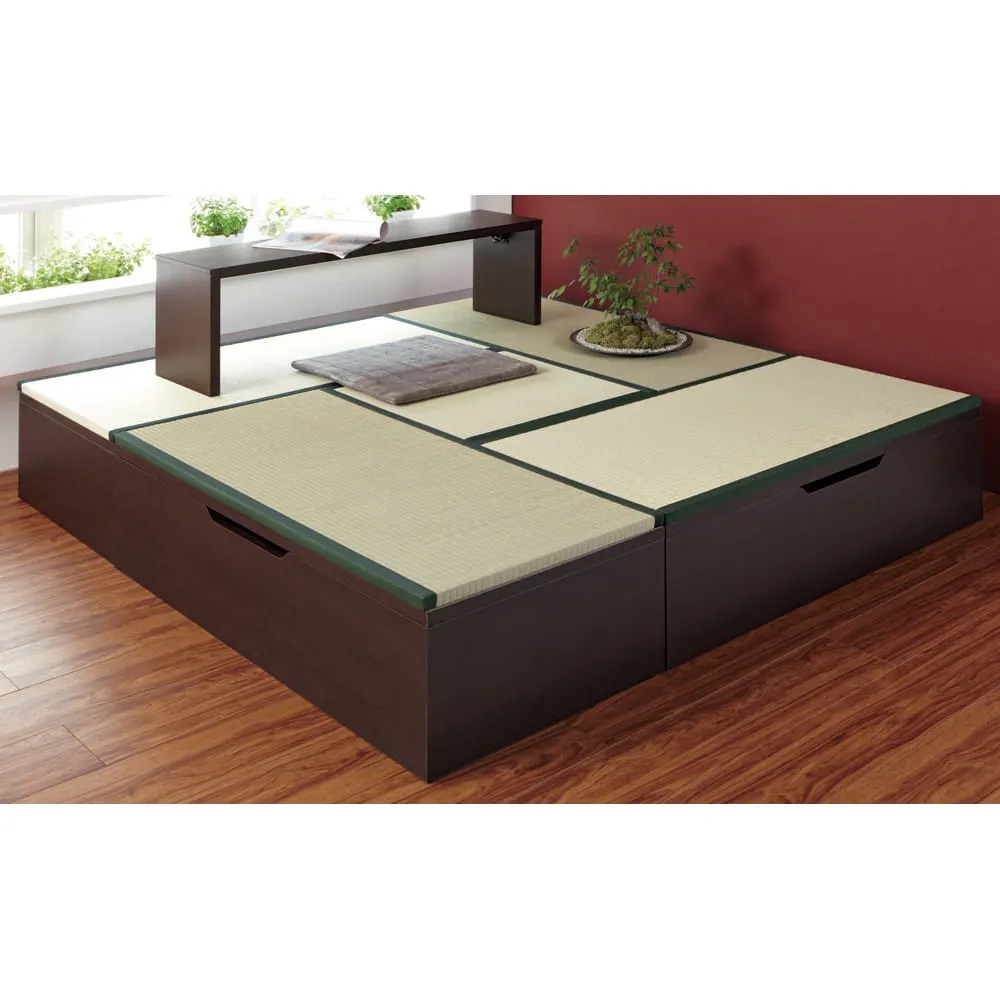フローリングに置くだけで、い草の香りが爽やかな高床式置き畳コーナーに!畳下部は跳ね上げ式開閉の大容量収納庫。すぐに使える完成品で簡単リフォーム。〜手軽に安らぎの和空間インテリアが実現するユニット畳〜◆くつろぎのスペースが生まれると同時にたっぷりの収納力でお部屋もすっきり。◆洋室の一画を使って和モダンなインテリアを実現できます。◆高床式置き畳なのでうたた寝やちょっとしたティータイムを過ごしてみてはいかがでしょう。◆うたた寝に便利な畳ベッド・収納ベッドとしてもお使い頂けます。◆洋風のリビングでも自分だけの和室スペースを持つ事ができます。◆「ダークブラウン」と、木目が美しい「ブラウン木目」の2色をご用意しました。◆インテリアに合わせて畳の「ヘリ無し」「ヘリ有り」をお選びいただけます。◆お部屋のスペースに合わせて豊富なサイズバリエーションからお選びいただけます。〜畳の下は長尺物もしまえる大容量収納スペース〜◆充実の収納力でリビングが広々と片付きます。◆衣類収納や季節家電の収納などに便利な高床式収納です。◆高さ33cmタイプには1畳分に布団やラグなどが収納可能。◆スキーやスノーボード、ラグなどの長尺ものの収納もできて便利です。◆お部屋を広く使いつつ、収納スペースを広げる事ができます。◆畳の載った蓋部分はスプリング付きの跳ね上げ式。女性でも簡単に持ち上がり、開けるとぴたっと固定されるので出し入れもスムーズです。〜信頼と安心の国内工場での生産品です〜◆国内の職人がひとつずつ丁寧に仕上げた逸品です。◆細部の丁寧な仕上がりなど、国産品ならではの高品質をお楽しみください。◆届いてすぐにお使いいただける本体完成品(畳を載せるだけ)も人気のポイント。◆おしゃれなインテリア、収納家具として人気のアイデア商品です。〜新築やリフォーム、模様替えの時にもおすすめの逸品〜◆お引越しや模様替えのタイミングでスペースを便利に有効活用してみませんか?◆高価な備え付け家具やリフォームよりも、リーズナブルに新生活を始められます。◆和風のお部屋にはもちろん、北欧テイストと日本のテイストを融合させた「ジャパンディ」テイストにもおすすめです。◆普段使うものだからこそ、幅広いサイズの中からじっくりとご検討ください。