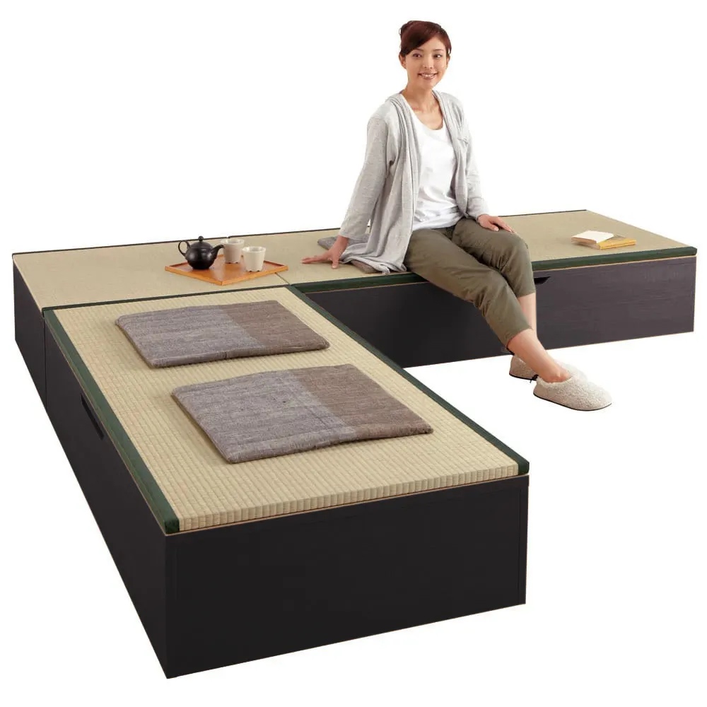 フローリングに置くだけで、い草の香りが爽やかな高床式置き畳コーナーに!畳下部は跳ね上げ式開閉の大容量収納庫。すぐに使える完成品で簡単リフォーム。〜手軽に安らぎの和空間インテリアが実現するユニット畳〜◆くつろぎのスペースが生まれると同時にたっぷりの収納力でお部屋もすっきり。◆洋室の一画を使って和モダンなインテリアを実現できます。◆高床式置き畳なのでうたた寝やちょっとしたティータイムを過ごしてみてはいかがでしょう。◆うたた寝に便利な畳ベッド・収納ベッドとしてもお使い頂けます。◆洋風のリビングでも自分だけの和室スペースを持つ事ができます。◆「ダークブラウン」と、木目が美しい「ブラウン木目」の2色をご用意しました。◆インテリアに合わせて畳の「ヘリ無し」「ヘリ有り」をお選びいただけます。◆お部屋のスペースに合わせて豊富なサイズバリエーションからお選びいただけます。〜畳の下は長尺物もしまえる大容量収納スペース〜◆充実の収納力でリビングが広々と片付きます。◆衣類収納や季節家電の収納などに便利な高床式収納です。◆高さ33cmタイプには1畳分に布団やラグなどが収納可能。◆スキーやスノーボード、ラグなどの長尺ものの収納もできて便利です。◆お部屋を広く使いつつ、収納スペースを広げる事ができます。◆畳の載った蓋部分はスプリング付きの跳ね上げ式。女性でも簡単に持ち上がり、開けるとぴたっと固定されるので出し入れもスムーズです。〜信頼と安心の国内工場での生産品です〜◆国内の職人がひとつずつ丁寧に仕上げた逸品です。◆細部の丁寧な仕上がりなど、国産品ならではの高品質をお楽しみください。◆届いてすぐにお使いいただける本体完成品(畳を載せるだけ)も人気のポイント。◆おしゃれなインテリア、収納家具として人気のアイデア商品です。〜新築やリフォーム、模様替えの時にもおすすめの逸品〜◆お引越しや模様替えのタイミングでスペースを便利に有効活用してみませんか?◆高価な備え付け家具やリフォームよりも、リーズナブルに新生活を始められます。◆和風のお部屋にはもちろん、北欧テイストと日本のテイストを融合させた「ジャパンディ」テイストにもおすすめです。◆普段使うものだからこそ、幅広いサイズの中からじっくりとご検討ください。