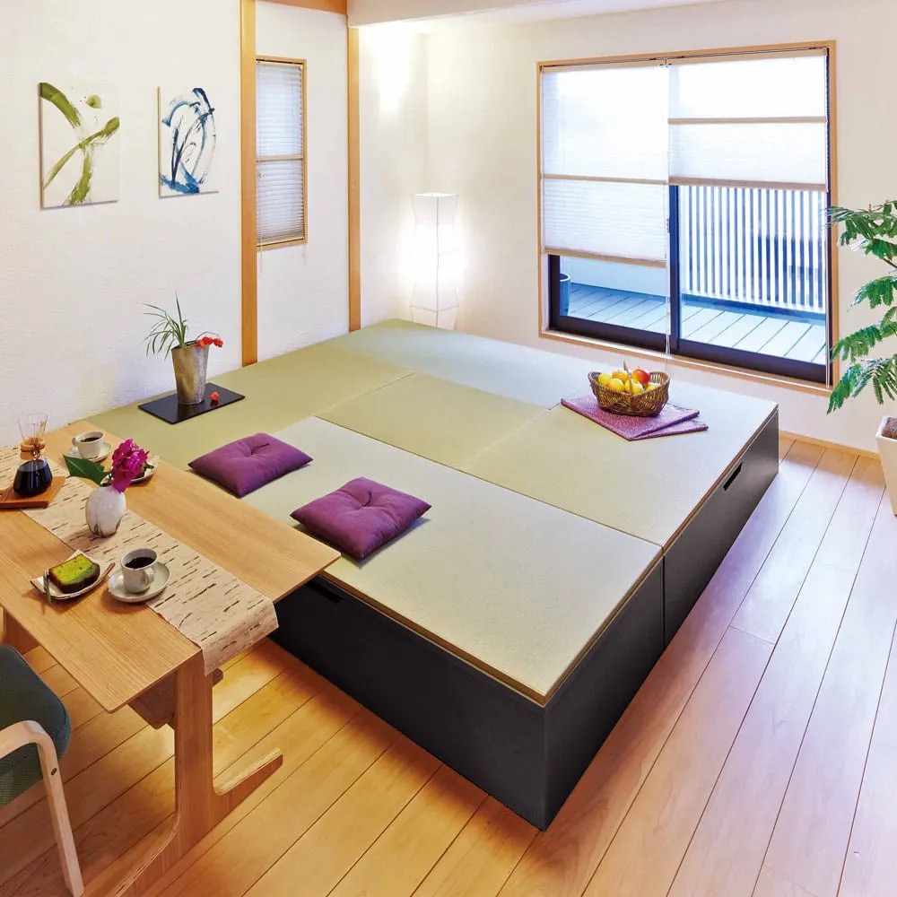 ミニマルな暮らしのお手本として注目されている和の住まいの進化形。置くだけで凛とした空間が生まれ、収納不足も解消します。(※写真はヘリ無・半畳+1畳×4・高さ45cm)