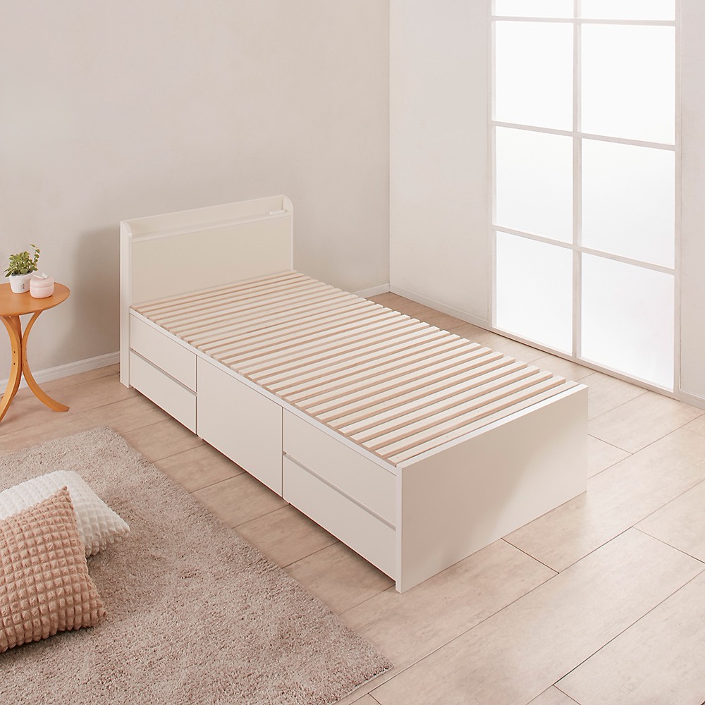 dinosがおすすめする大容量収納でお部屋が広く使えるチェストベッド。洋服をたくさんお持ちの方にクローゼットいらずな驚きの収納力。ヘッドボードは角が丸く、奥行9cmの省スペース設計。お部屋が広く使える国産の大量収納チェストベッド。本体・ヘッドボード・サイズ・色がお好み・お部屋のテイストに合わせて選べる120タイプ!組み合わせで120タイプから選べるから、お望みのベッドが必ず見つかるディノスがおすすめするチェストベッドです。Q.チェストベッドとは?A.タンスとベッドが一体化。最大で衣装ケース25個分(大量収納引き出しすのこタイプ・ダブルサイズ)を収納できるので場所を取らずに寝室がすっきり。Q.どうしてチェストベッドがいいの?A.収納スペースが少なかったり、タンスを置く場所がないお部屋でも、空間の有効活用ができます。ディノスのチェストベッドならお部屋や用途に合ったベッドがきっと見つかりますお洋服をたくさん持っている人におすすめ!大型引出し付のベッド何と引出し奥行き84cmで衣装ケース約12個分の収納力で衣替え知らずの大容量チェストベッド奥行84cmの引き出しで大量収納が可能。奥行き84cmの引き出しで大量の衣類がしまえ、衣替えも不要に。フルスライドレールつきで奥までスムーズに出し入れができます。※引出しは手前側に70cm引き出せます。引出しの奥行内寸は84cmです。お好みで選べるヘッドボード◆立てかけ薄型棚スマホや小物が立てかけられる便利な薄型棚。コンセント付きなので充電もばっちり。◆角が丸い薄型棚角が丸く加工されており奥行9cmの省スペース設計。コンセント付きなので充電もばっちり。◆照明・収納棚付きサイドにほのかな照明と収納棚付きの機能的なヘッドボード。収納スペースにはA4サイズの雑誌が収納できます。コンセント付きなので充電もばっちり。◆ヘッドレスタイプ省スペースにベッドを設置できるヘッドレスタイプ。お部屋に合わせて選べる3色ホワイト・ダークブラウン・ブラウン木目の3色をご用意いたしました。お部屋のインテリアや雰囲気に合わせてお選びいただけます。新生活・お引越しのタイミングに合わせてベッドフレームを見直してみませんか?タンス・チェストいらずの大型収納でお部屋がすっきり整えられます!他にも収納付きベッドを多数ご用意しています!大容量チェストベッド特集はこちらから