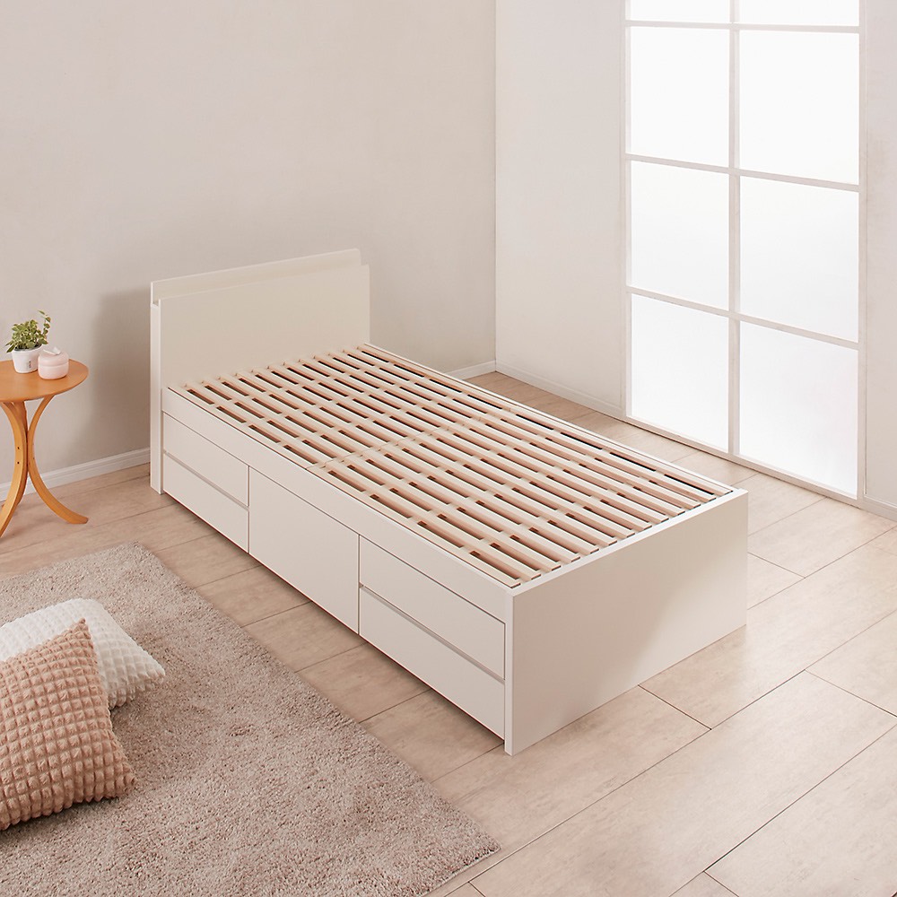 dinosがおすすめする大容量収納でお部屋が広く使えるチェストベッド。布団派もマット派もすのこで快適。ヘッドボードはスマホや小物が立て掛けやすい薄型収納。