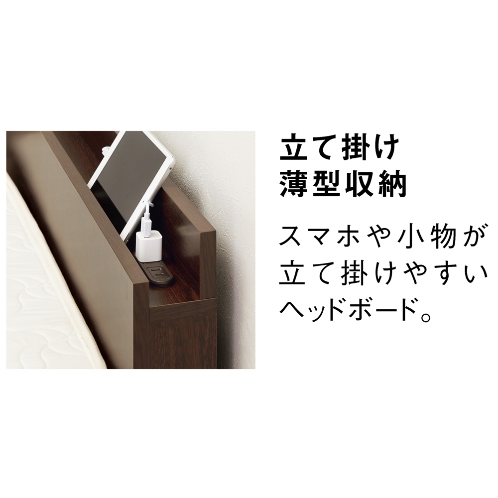 立てかけられるヘッドボードで落下防止。充電に便利なコンセント付き。