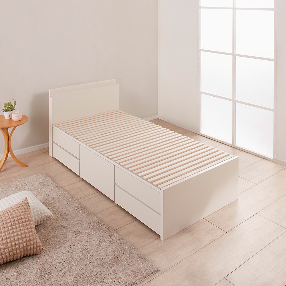 dinosがおすすめする大容量収納でお部屋が広く使えるチェストベッド。洋服をたくさんお持ちの方にクローゼットいらずな驚きの収納力。ヘッドボードはスマホや小物が立て掛けやすい薄型収納。お部屋が広く使える国産の大量収納チェストベッド。本体・ヘッドボード・サイズ・色がお好み・お部屋のテイストに合わせて選べる120タイプ!組み合わせで120タイプから選べるから、お望みのベッドが必ず見つかるディノスがおすすめするチェストベッドです。Q.チェストベッドとは?A.タンスとベッドが一体化。最大で衣装ケース25個分(大量収納引き出しすのこタイプ・ダブルサイズ)を収納できるので場所を取らずに寝室がすっきり。Q.どうしてチェストベッドがいいの?A.収納スペースが少なかったり、タンスを置く場所がないお部屋でも、空間の有効活用ができます。ディノスのチェストベッドならお部屋や用途に合ったベッドがきっと見つかりますお洋服をたくさん持っている人におすすめ!大型引出し付のベッド何と引出し奥行き84cmで衣装ケース約12個分の収納力で衣替え知らずの大容量チェストベッド奥行84cmの引き出しで大量収納が可能。奥行き84cmの引き出しで大量の衣類がしまえ、衣替えも不要に。フルスライドレールつきで奥までスムーズに出し入れができます。※引出しは手前側に70cm引き出せます。引出しの奥行内寸は84cmです。お好みで選べるヘッドボード◆立てかけ薄型棚スマホや小物が立てかけられる便利な薄型棚。コンセント付きなので充電もばっちり。◆角が丸い薄型棚角が丸く加工されており奥行9cmの省スペース設計。コンセント付きなので充電もばっちり。◆照明・収納棚付きサイドにほのかな照明と収納棚付きの機能的なヘッドボード。収納スペースにはA4サイズの雑誌が収納できます。コンセント付きなので充電もばっちり。◆ヘッドレスタイプ省スペースにベッドを設置できるヘッドレスタイプ。お部屋に合わせて選べる3色ホワイト・ダークブラウン・ブラウン木目の3色をご用意いたしました。お部屋のインテリアや雰囲気に合わせてお選びいただけます。新生活・お引越しのタイミングに合わせてベッドフレームを見直してみませんか?タンス・チェストいらずの大型収納でお部屋がすっきり整えられます!他にも収納付きベッドを多数ご用意しています!大容量チェストベッド特集はこちらから