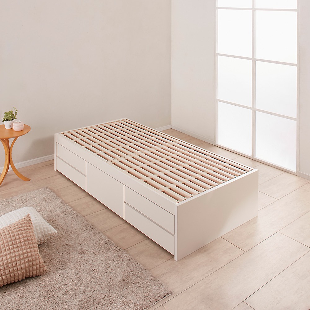 dinosがおすすめする大容量収納でお部屋が広く使えるチェストベッド。布団派もマット派もすのこで快適。すっきりお部屋が広く使えるヘッドレスタイプ。お部屋が広く使える国産の大量収納チェストベッド。本体・ヘッドボード・サイズ・色がお好み・お部屋のテイストに合わせて選べる120タイプ!組み合わせで120タイプから選べるから、お望みのベッドが必ず見つかるディノスがおすすめするチェストベッドです。Q.チェストベッドとは?A.タンスとベッドが一体化。最大で衣装ケース25個分(大量収納引き出しすのこタイプ・ダブルサイズ)を収納できるので場所を取らずに寝室がすっきり。Q.どうしてチェストベッドがいいの?A.収納スペースが少なかったり、タンスを置く場所がないお部屋でも、空間の有効活用ができます。ディノスのチェストベッドならお部屋や用途に合ったベッドがきっと見つかります【通気性が気になる人におすすめ!長物もしまえるすのこタイプのベッド】引き出しと反対側には長もの収納もできる広々スペースがあり、季節ものもたっぷりしまえる機能性が魅力のチェストベッド。布団派のひと、マットレス派の方どちらでもご利用いただけます。床面はすのこ使用で通気性が気になる方にもおすすめ。毛布や敷物などのかさばるものも収納できる十分なスペースがあります。お好みで選べるヘッドボード◆立てかけ薄型棚スマホや小物が立てかけられる便利な薄型棚。コンセント付きなので充電もばっちり。◆角が丸い薄型棚角が丸く加工されており奥行9cmの省スペース設計。コンセント付きなので充電もばっちり。◆照明・収納棚付きサイドにほのかな照明と収納棚付きの機能的なヘッドボード。収納スペースにはA4サイズの雑誌が収納できます。コンセント付きなので充電もばっちり。◆ヘッドレスタイプ省スペースにベッドを設置できるヘッドレスタイプ。お部屋に合わせて選べる3色ホワイト・ダークブラウン・ブラウン木目の3色をご用意いたしました。お部屋のインテリアや雰囲気に合わせてお選びいただけます。新生活・お引越しのタイミングに合わせてベッドフレームを見直してみませんか?タンス・チェストいらずの大型収納でお部屋がすっきり整えられます!他にも収納付きベッドを多数ご用意しています!大容量チェストベッド特集はこちらから