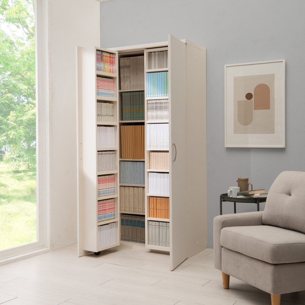 本が「守れる」「たくさん入る」「取り出しやすい」。開閉しやすい収納付き扉とスライド棚で大量収納を可能にした、蔵書家のための本棚です。「欲しい機能」が詰まったスライド本棚ディノスで人気のスライド本棚に扉付きタイプが登場。「本を日焼けから守る」「たくさん収納できる」「探しやすい」「取り出しやすい」と機能たっぷり。収納物を全て隠せる扉付き仕様。完成品で面倒な組立いらず。背表紙を隠して、お部屋をすっきりと見せられる扉付きの本棚。扉があることで日焼けやほこりの侵入を防ぎます。組み立て不要の完成品で到着後すぐお使いいただけます。扉を開くと圧巻の収納スペース。もったいなかったスペースもフル活用扉裏にも収納棚を設けることで、通常のスライド本棚で生まれるデッドスペースを無くし、より多くの収納が可能になりました。収納扉にはキャスターが付いており、105度まで開くので出し入れスムーズ。全体が見渡せ、必要なものを探しやすいです。たっぷり大容量収納扉裏収納で大容量収納を実現。B6単行本(幅12.8高さ18.2厚み1.5cm)であれば、最大約744冊収納できます。スライド棚のほか、奥行39cmの収納棚もあり、異なるサイズの収納物も効率よく収まります。本はもちろん、雑貨・リビング家電など奥行の深い物の収納にオススメです。扉裏の棚とスライド棚は1cmピッチ、奥の棚は3cmピッチの可動棚で、収納する本に合わせて高さが変えられます。※棚板1枚あたりの耐荷重は約8kgです。「探しやすい」「取り出しやすい」スライド収納前列の棚は左右に動くスライド収納。手前の収納棚をスライドすることで、後列に収納した本のタイトルも見やすく、取り出しも楽です。大量に収納しても軽々スライドできる秘密高級特殊ベアリングローラーを使用し、重い書籍もらくらくスライド。ローラーとの接地面積が最小になるよう下部レールにはステンレス製丸棒をセット。接地面積を最小に抑えることで、摩擦に対する耐久性とスライド時の静音性を高めました。サイズ詳細色展開(ア) ダークブラウン (イ) ホワイト