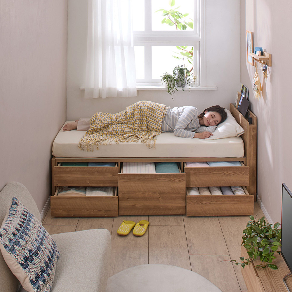 幅3サイズ×長さ2サイズ、それぞれ棚無し・棚付きの全12パターンから選べる、大容量の引き出し付きの収納ベッド。狭いお部屋につきもののお悩みを、この1台が解決します。