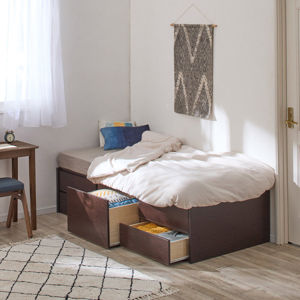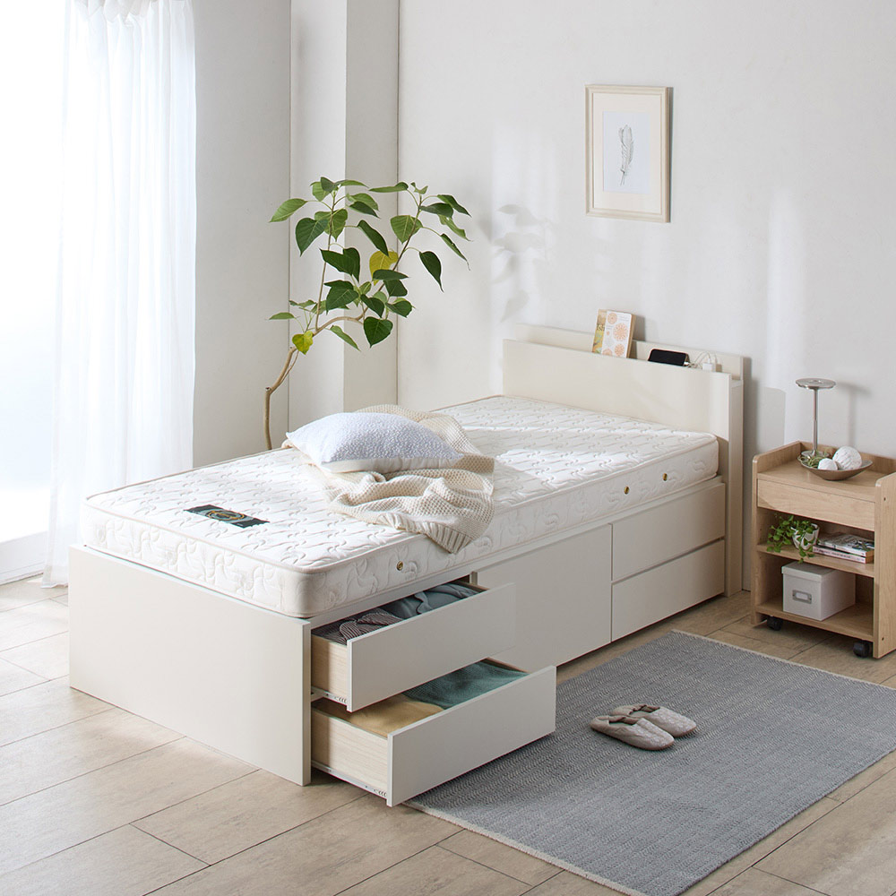 圧巻の収納力! 幅3サイズ×長さ2サイズ×棚ありなしの全12パターンからサイズを選べる、省スペース&大容量の収納付きベッド。収納部は国内工場で組み立て済みなので、頑丈で組立時間も短縮。国産ポケットコイルマットレスを標準装備し、寝心地も追求しました。置きたい位置にベッドが収まらず配置に苦労していた方に、おすすめの1台です。