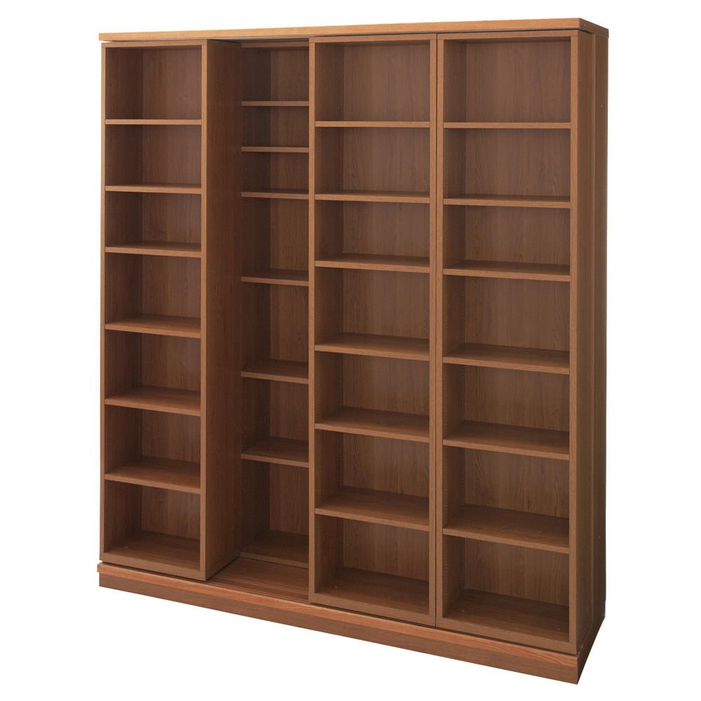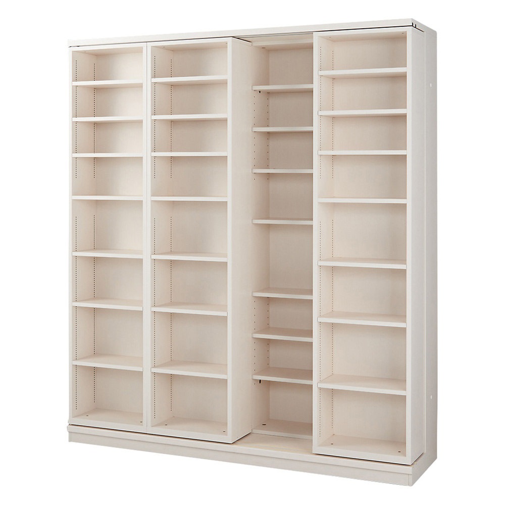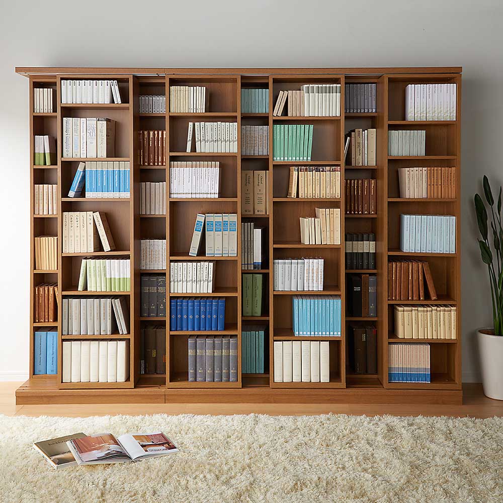 思い出とともに次世代へと引き継がれていく家具。驚異の収納力と耐久性を持ったスライド書架。数多くの愛蔵書を収納しても、丈夫なベアリング入りレールとステンレス芯棒がスムーズなスライドを実現する本棚です。引き継がれていく家具◆そろそろ本格的な書棚(本棚)とお考えのあなたに贈るブックシェルフ。◆リフォーム業者に依頼せずとも機能美あふれるスライド壁面収納書架を設置できます。◆学校の先生、専門家、アドバイザーの方々の本棚を想像、必要な要素を思い描き形にしました。◆お子様の本から専門書、辞典、A4ファイルサイズまで対応、床から天井までの空間を有効に活用します。◆引っ越しの時にも、一緒に連れて行きたくなる収納家具を目指した家具はいかがでしょうか?【製品情報】[色の種類]◆落ち着いたモダンな印象のダークブラウン。◆温もりを感じるナチュラル。◆やわらかくて優しい印象のホワイト(木目)。[サイズ・バリエーション]◆幅は、84cm、127cm、168cmの3サイズ。◆高さ192cmタイプと237cmの上置き付きタイプと高さ90cmの9バリエーションをご用意。[機能・構造・仕様]◆高級特殊ベアリングローラーとステンレス芯棒を搭載。重い書籍もらくらくスライドできる構造。◆ローラーとの接地面積が最小になるよう下部レールにはステンレス製丸棒をセット。◆ローラーとの接地面積を最小に抑え、摩擦に対する耐久性にも優れ、スライド時の静音性も高めました。◆耐久性に優れ、書籍を満載にした状態でもスムーズにスライドします。◆収蔵物に合わせて、内寸奥行を可変出来る二重レール構造も魅力。◆必要に応じてスライド書棚を乗せ変えることができます。◆前面のスライド書棚を前レールに乗せれば、後ろの書棚との間を広げることができ、奥行きが拡大、A4ファイルサイズもスッキリ収納することができます。◆前レールを使用すると、後ろの書棚の奥行きが、21.5cmから26cmに広がります。◆前方スライド書棚は、書籍に合わせて細かく調節可能な棚板1cmピッチ。無駄が少なく、たっぷり収納できます。◆後方の書棚は3cmピッチで、大きめの書籍の収納に適しています。